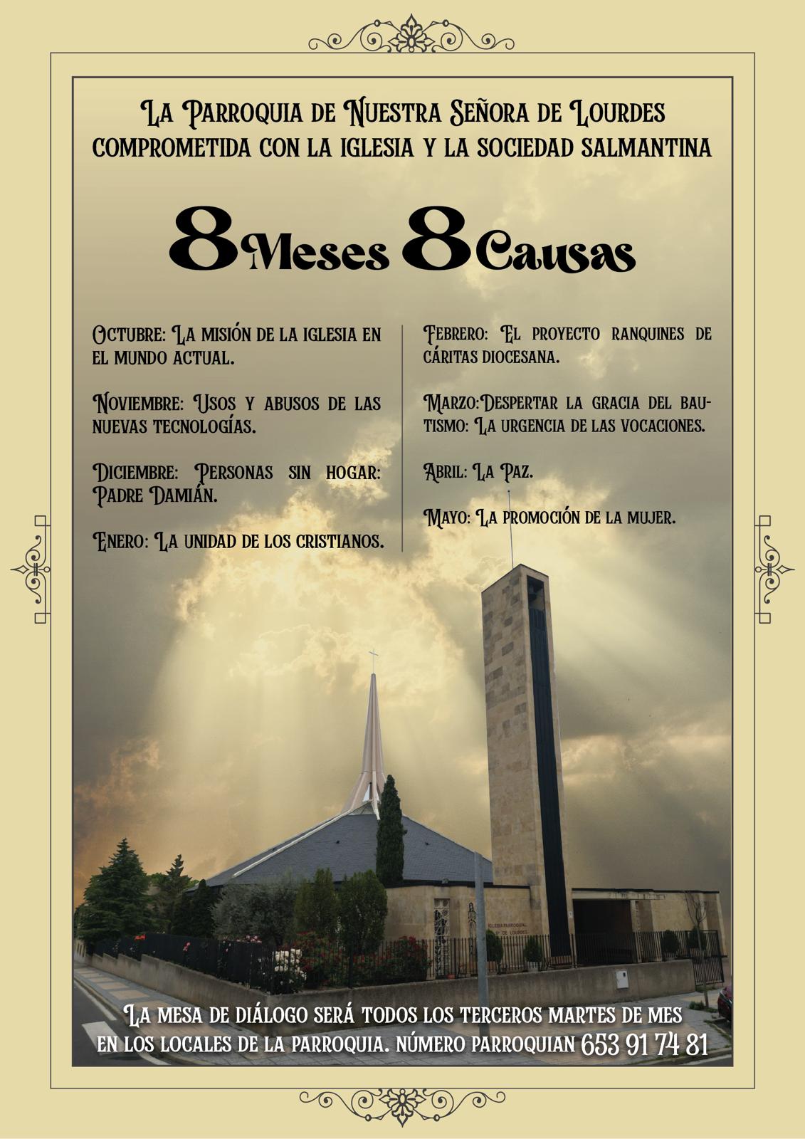 La parroquia de Nuestra Señora de Lourdes, en su compromiso con la realidad social y religiosa de Salamanca, ha puesto en marcha “8 meses, 8 causas”. Esta iniciativa tiene entre sus objetivos visibilizar “realidades sociales, políticas, económicas religiosas, que afectan a nuestra vida, a nuestro barrio, a nuestro mundo”, como señala el párroco, Miguel Ángel González. Además, busca promover la reflexión sobre el papel de la Iglesia y la sociedad, invitando a una mayor “implicación en la construcción de una sociedad más digna, más justa”, acorde con los valores del Reino de Dios.