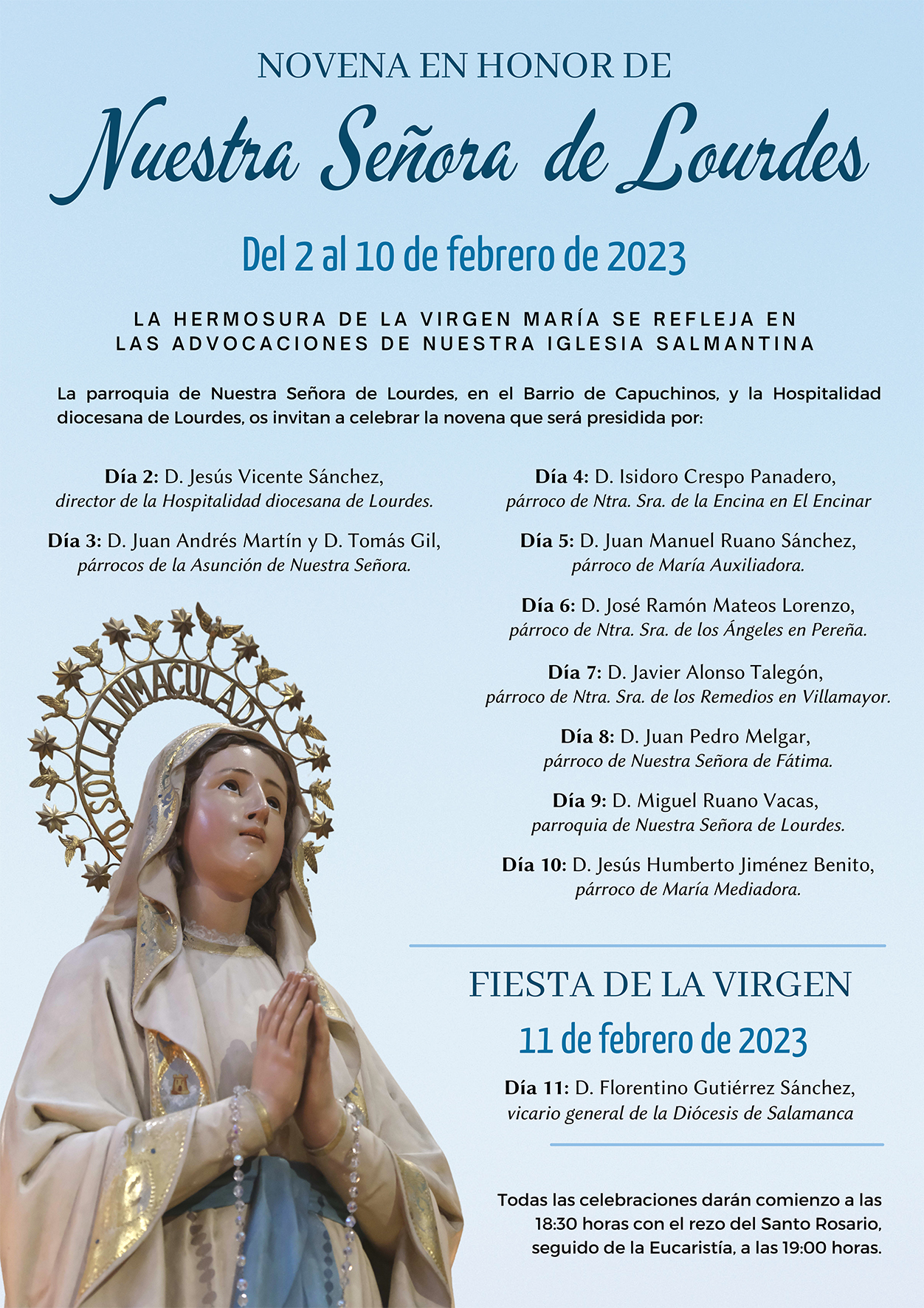 La novena se iniciará, todos los días, con el rezo del santo rosario, a las 18:30 horas, seguido de la celebración de la eucaristía, a las 19:00 horas, que será presidida cada jornada por un sacerdote o párroco de alguno de los templos diocesanos con advocación mariana. Tal y como señala el párroco de Nuestra Señora de Lourdes, Miguel Ángel González, “este año queremos profundizar en las advocaciones que nuestra Madre tiene por la diócesis de Salamanca. Porque Ella es la singular embajadora, cauce singular, de la Gracia y la Misericordia de Dios”. Advocaciones como la Asunción de Nuestra Señora (barrio de Puente Ladrillo, en Salamanca), Nuestra Señora de la Encina (El Encinar), María Auxiliadora (Salamanca), Nuestra Señora de los Ángeles (Pereña), Nuestra Señora de los Remedios (Villamayor), Nuestra Señora de Fátima (Salamanca) o María Mediadora (Salamanca).