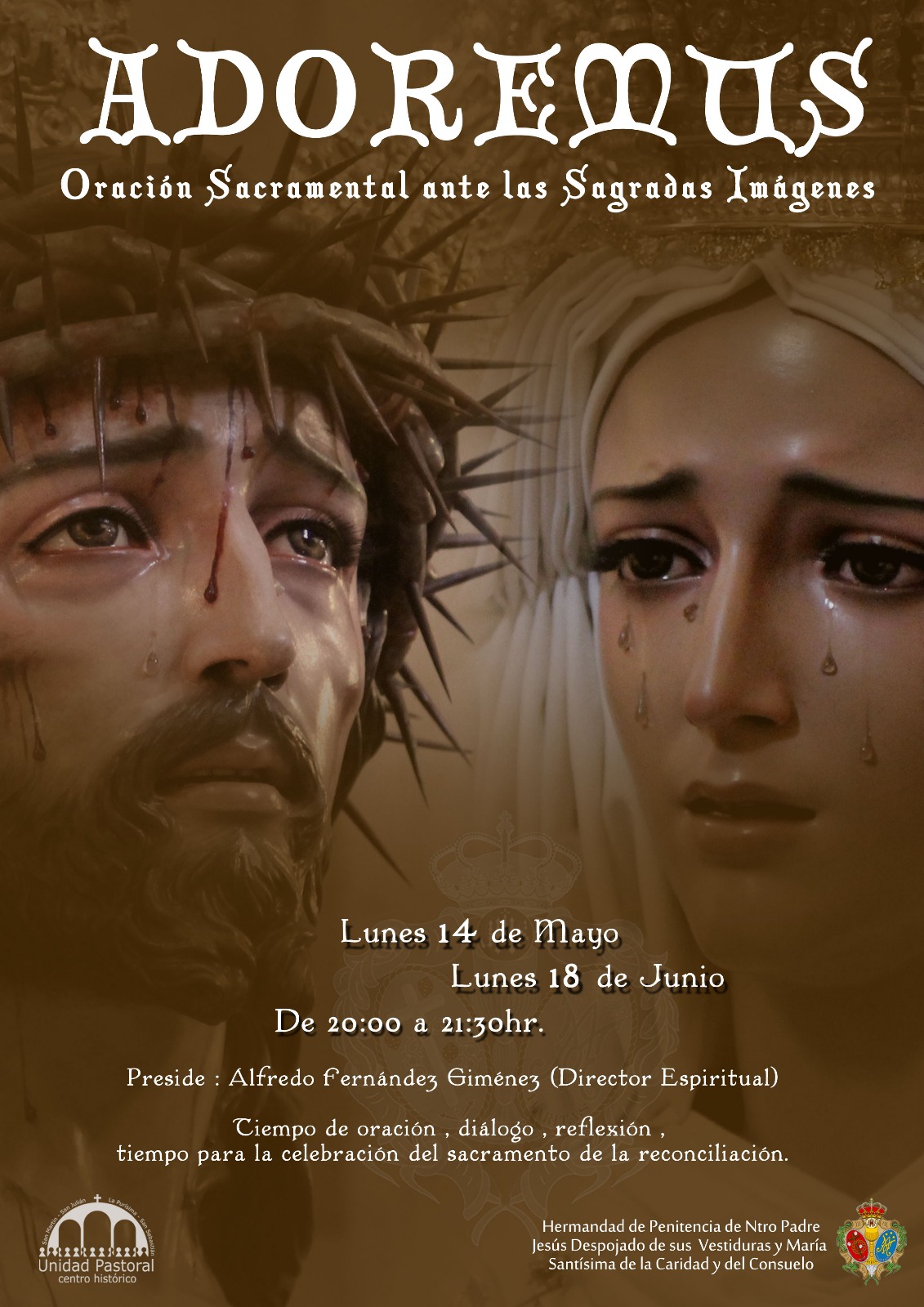 Los días 14 de mayo y 18 de junio, de 20.00 a 21.30 de la tarde, la parroquia de San Sebastián de Salamanca acoge la experiencia de oración “Adoremos”. Se trata de un encuentro mensual para orar ante el Santísimo Sacramento del Altar y ante las imágenes de Nuestro Padre Jesús Despojado y María Santísima Caridad y del Consuelo, al tiempo que se medita sobre la Palabra de Dios siguiendo una “Lectio Divina” preparada desde la Hermandad de Jesús Despojado y su director espiritual D. Alfredo Fernández Giménez.