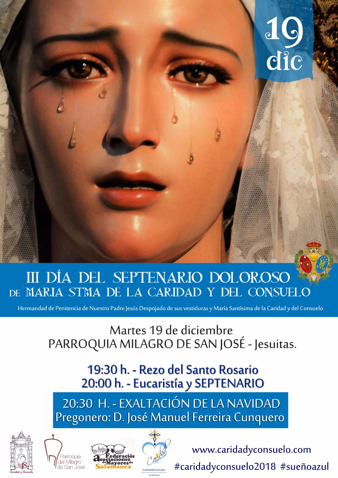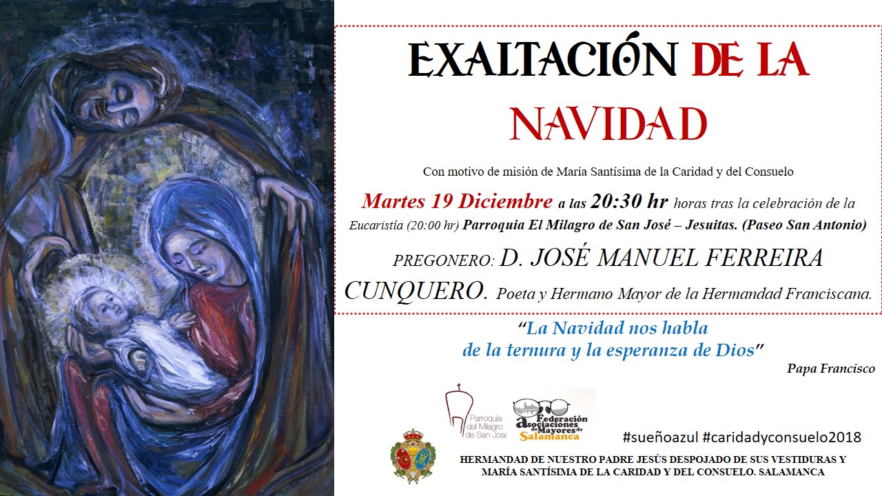 José Manuel Ferreira Cunquero, poeta y Hermano Mayor de la Hermandad Franciscana de Salamanca, pronunciará el martes 19 de diciembre la Exaltación de la Navidad promovida por la Hermandad de Penitencia de Nuestro Padre Jesús Despojado de sus vestiduras y María Santísima de la Caridad y del Consuelo. El acto tendrá lugar a las 8.30 de la tarde en la Parroquia del Milagro y se enmarca dentro de la Misión que la Hermandad está realizando con la Imagen de María Santísima de la Caridad y del Consuelo con motivo de su primera estación de penitencia el Domingo de Ramos de 2018. Previamente habrá rezo del Santo Rosario y Eucaristía, a las 7.30 de la tarde.