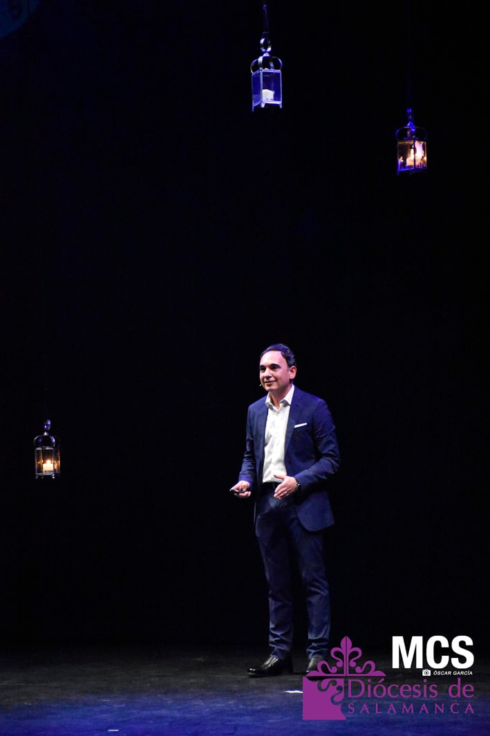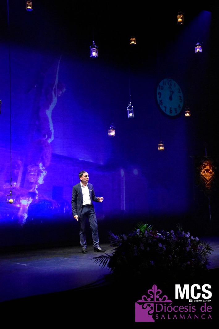 Lejos del tradicional atril del pregonero, se movió por el escenario relatando sus “Doce horas de pasión y una canción esperanzada”, como tituló su pregón. La primera imagen era de una Plaza Mayor rodeada de los anagramas de las 18 cofradías, hermandades y congregaciones de la ciudad, junto al de la Junta de Semana Santa.
