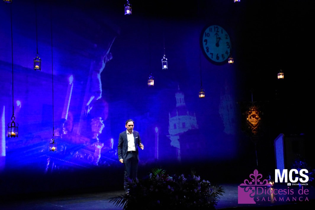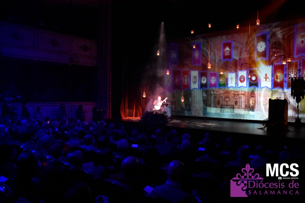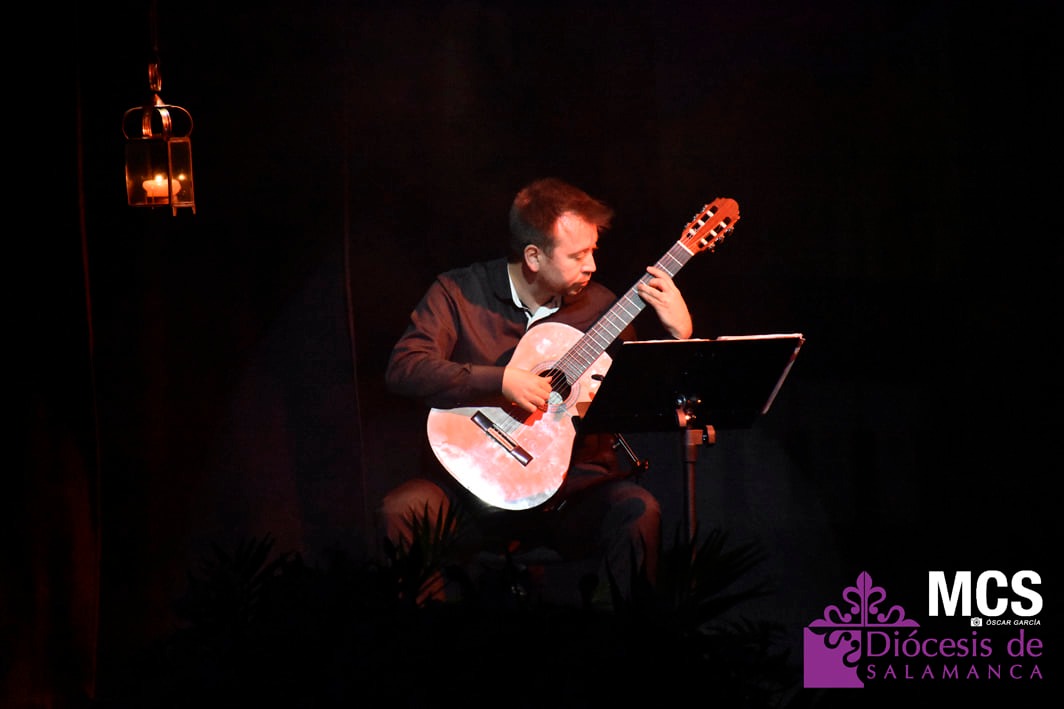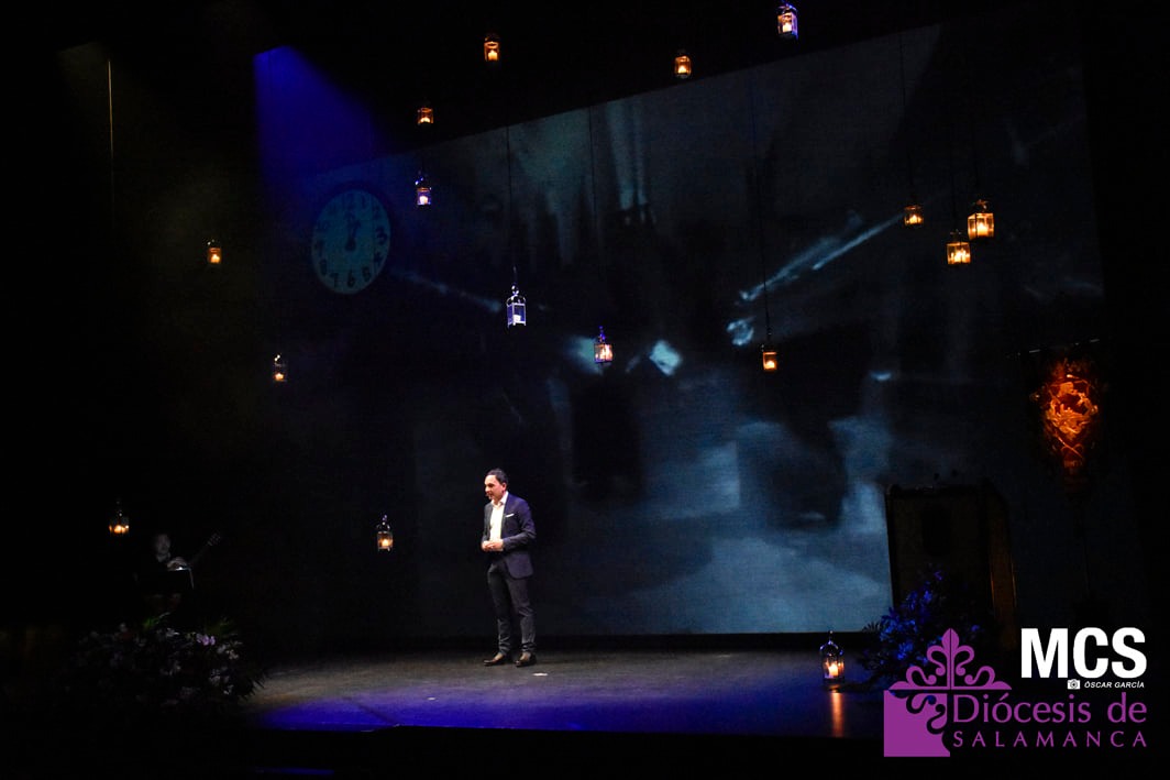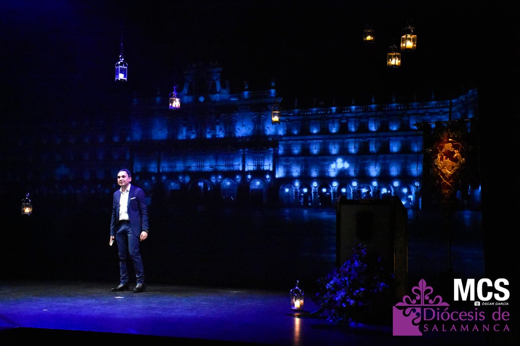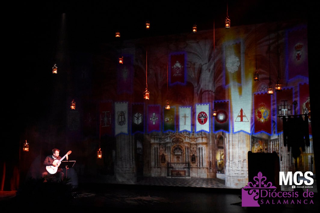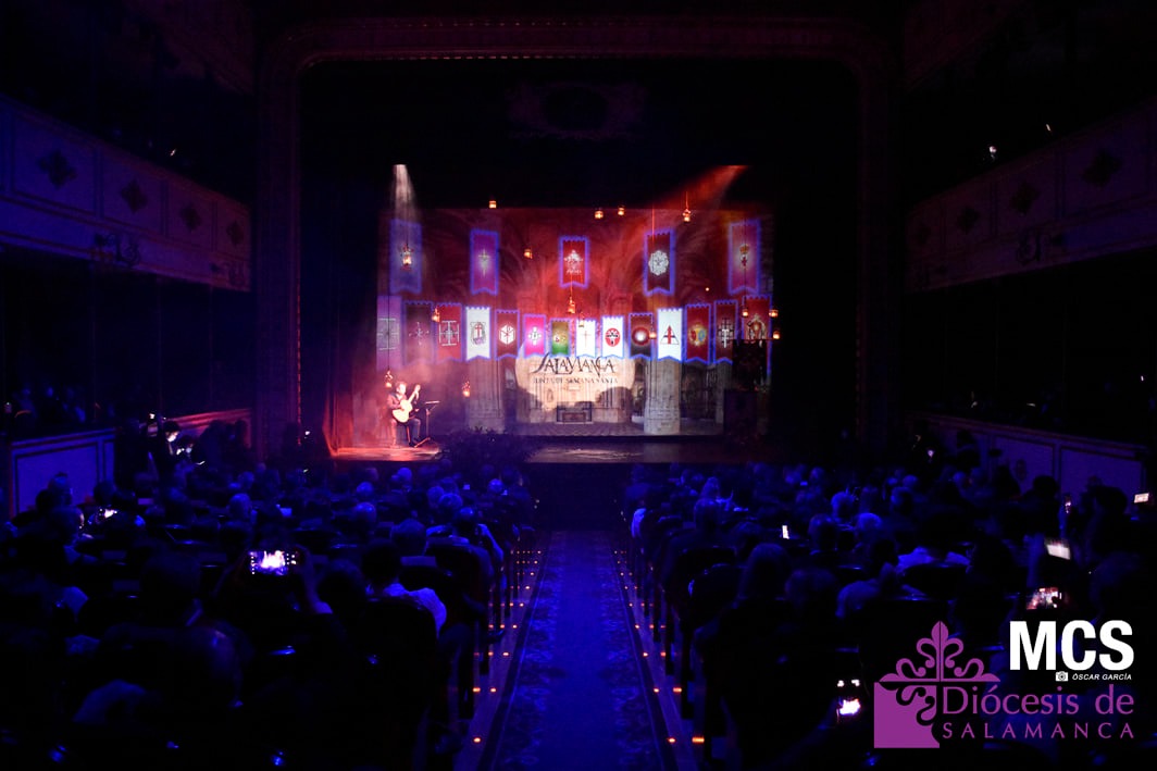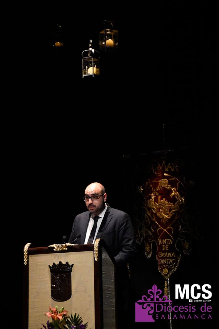 De las cuerdas de la guitarra de Sergio Iván González sonaron los acordes de Pasión en Salamanca, la marcha que compusiera Abel Moreno para la Semana Santa de Salamanca. Unos minutos después, el pregonero hacía su entrada al patio de butacas por el pasillo central con un farol de Jueves Santo en la mano.