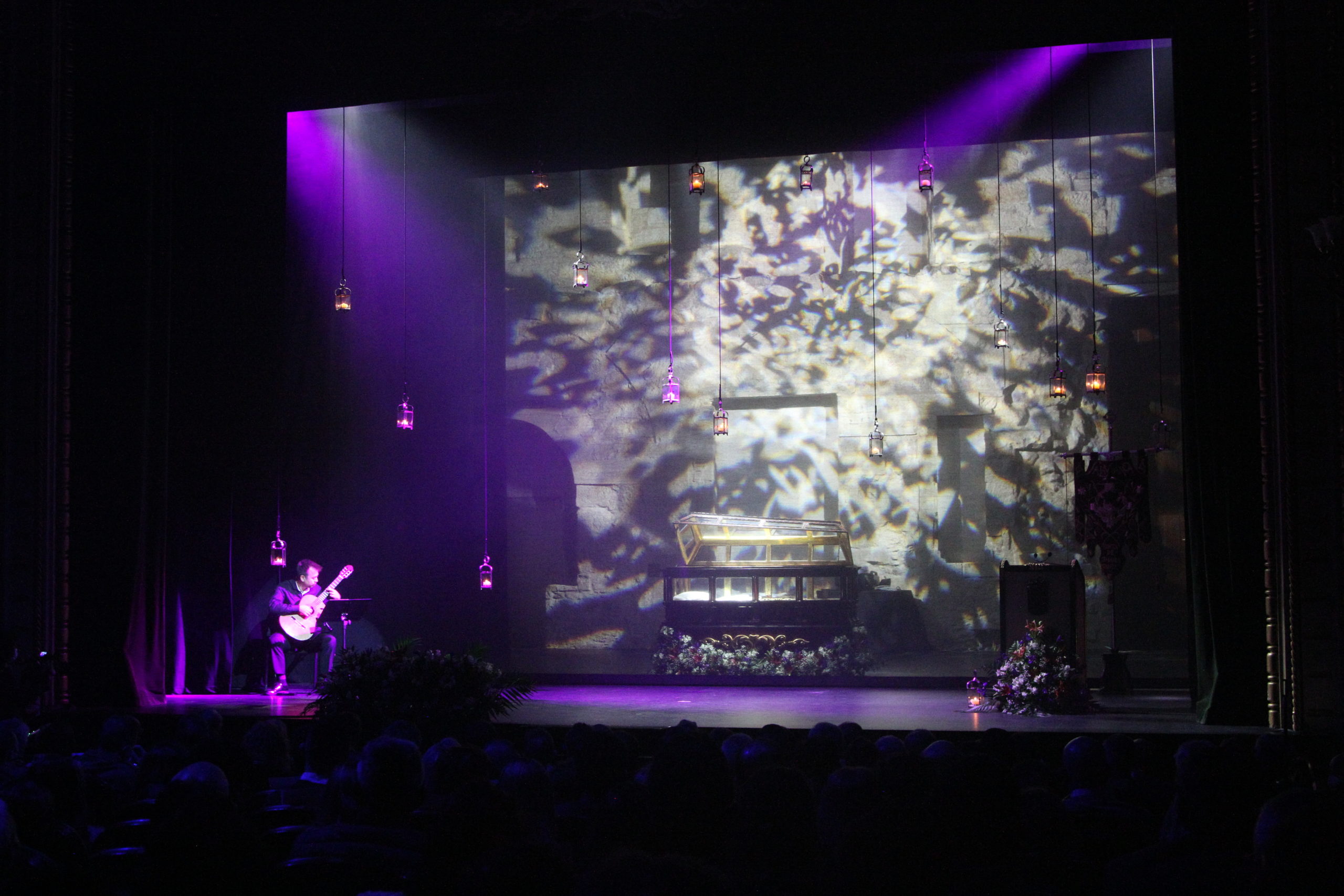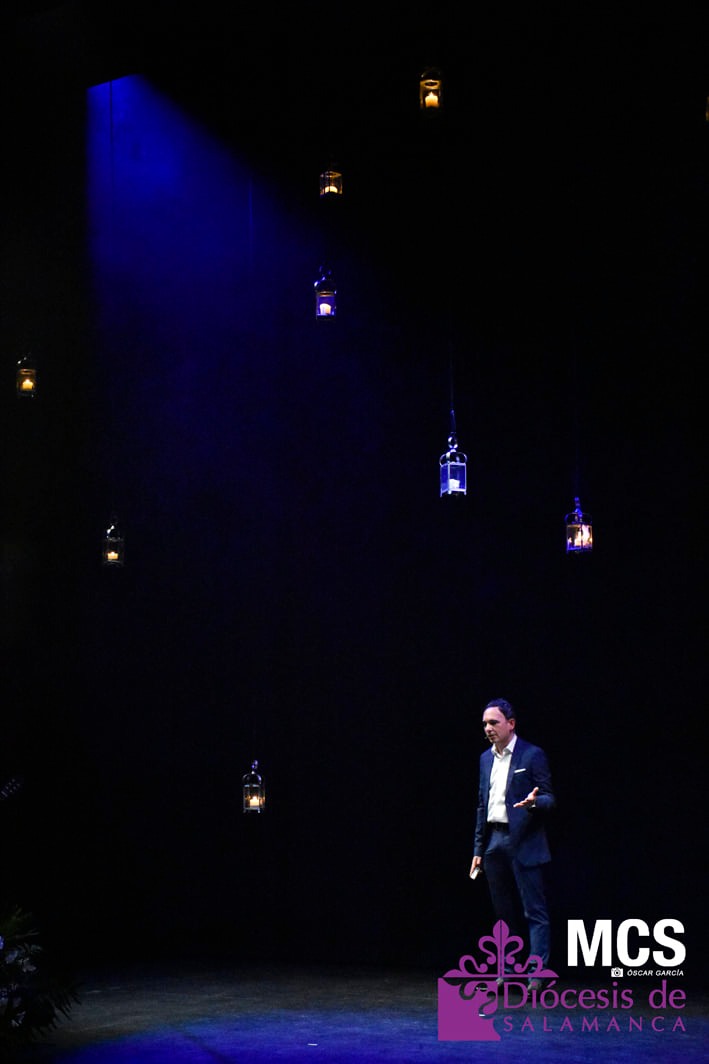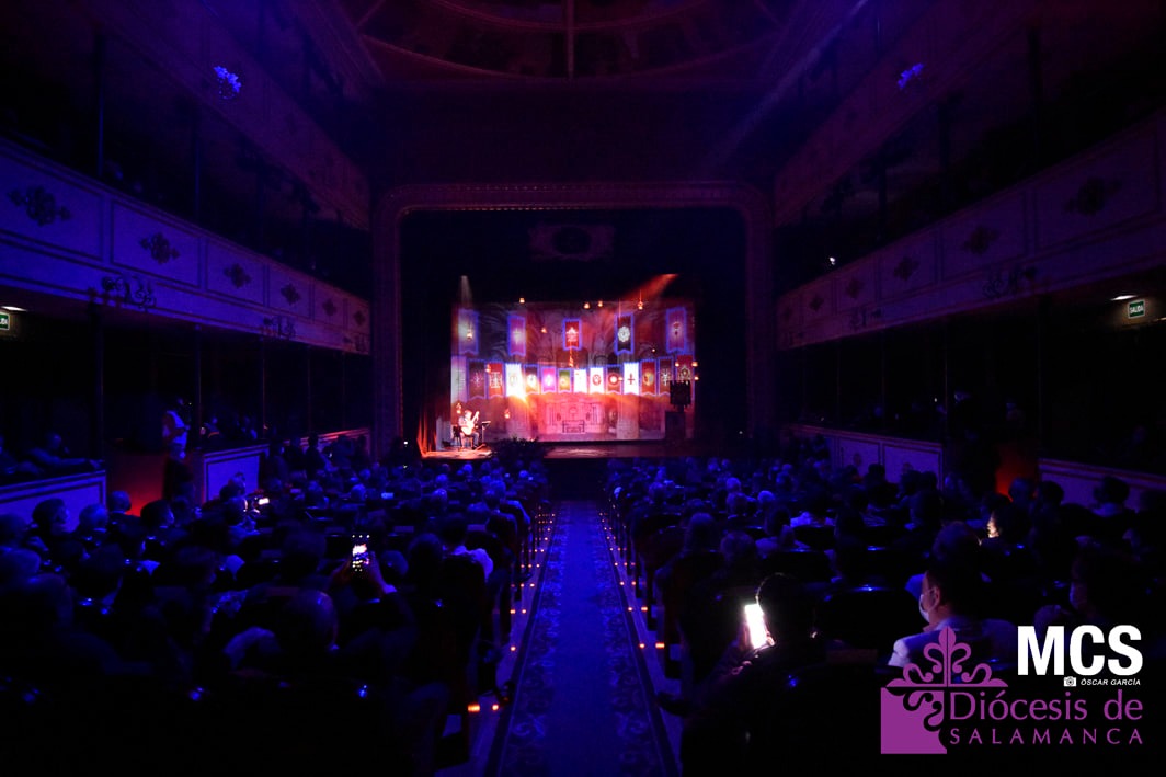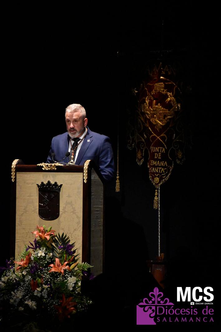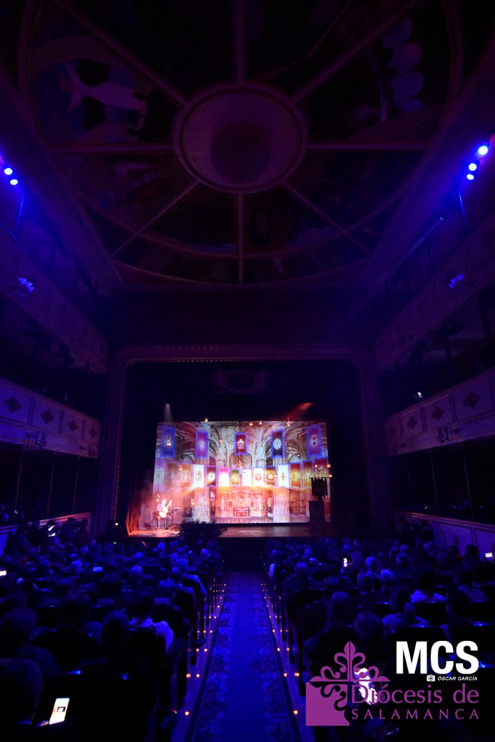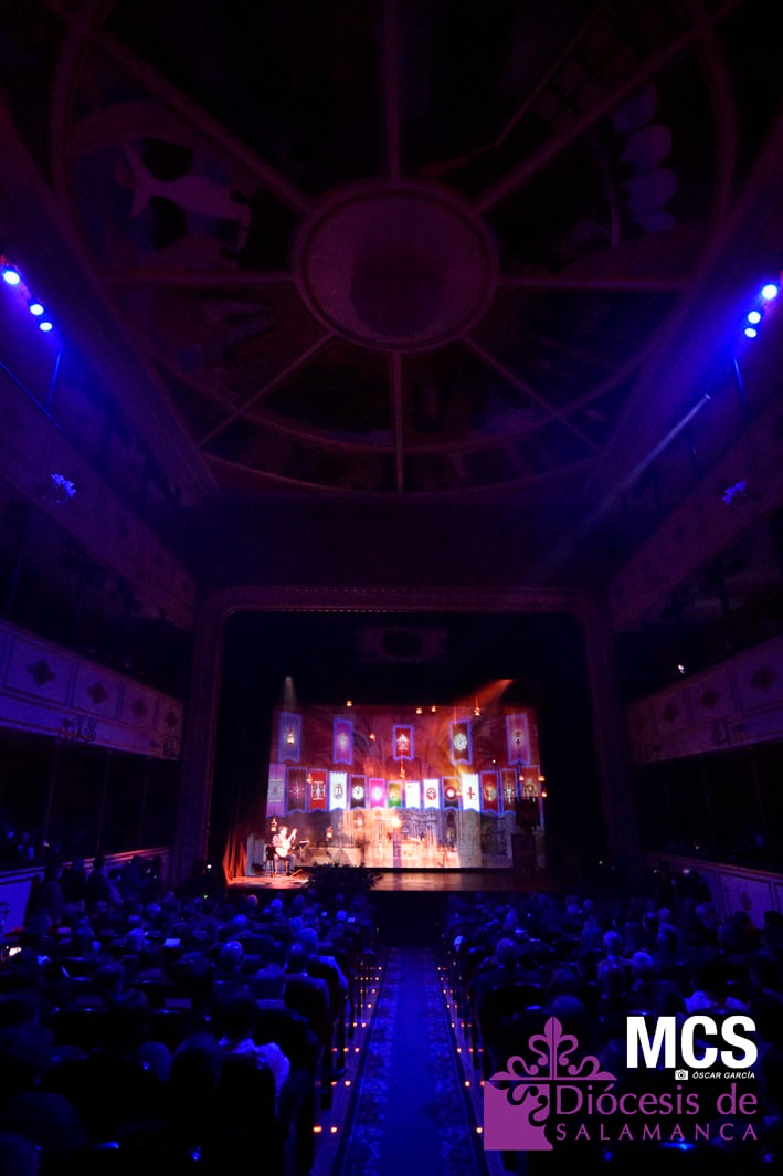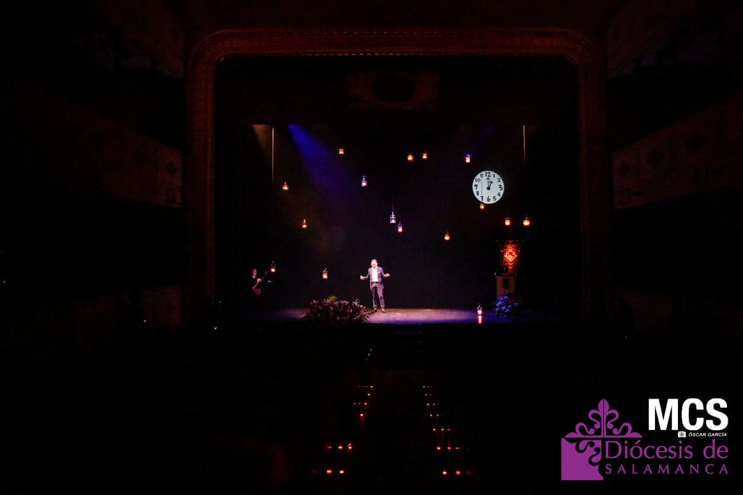 De las cuerdas de la guitarra de Sergio Iván González sonaron los acordes de Pasión en Salamanca, la marcha que compusiera Abel Moreno para la Semana Santa de Salamanca. Unos minutos después, el pregonero hacía su entrada al patio de butacas por el pasillo central con un farol de Jueves Santo en la mano.