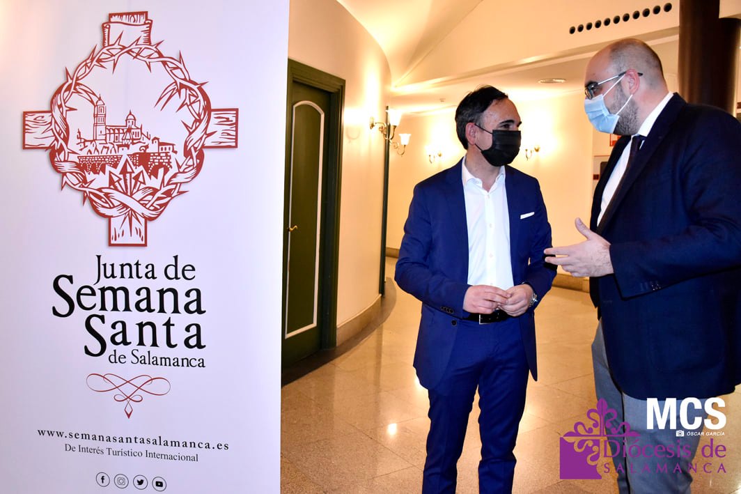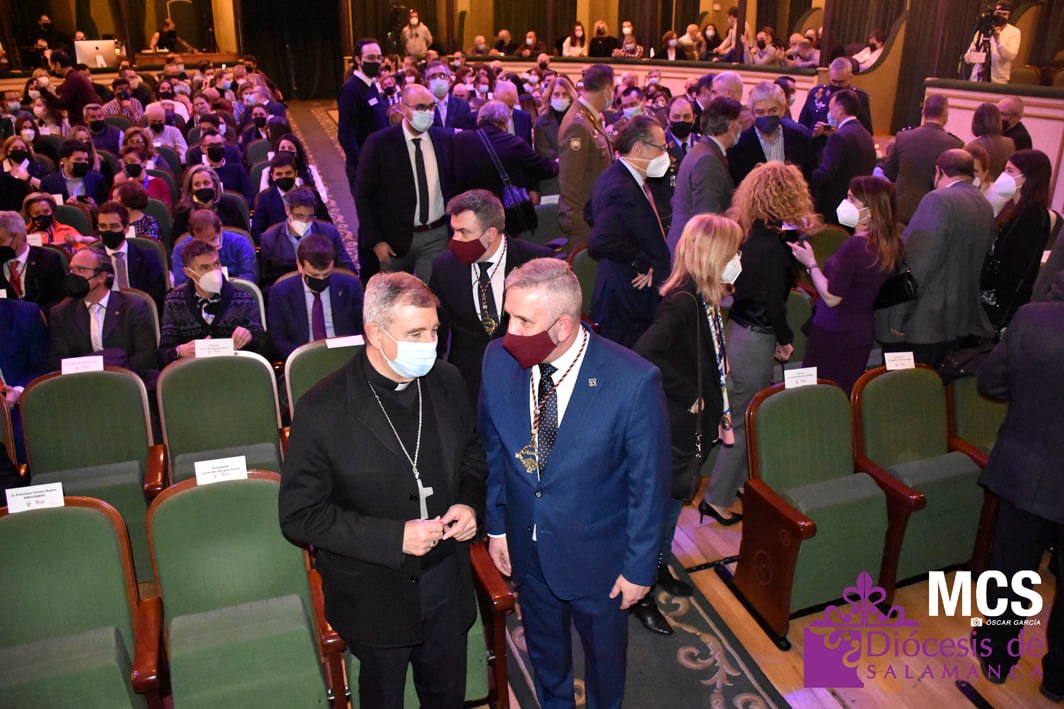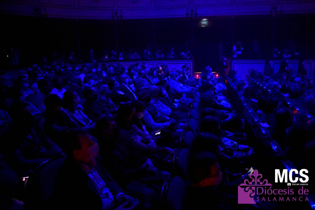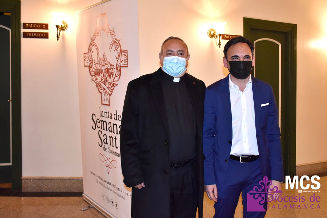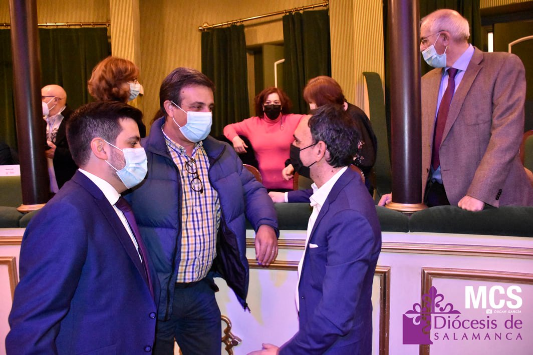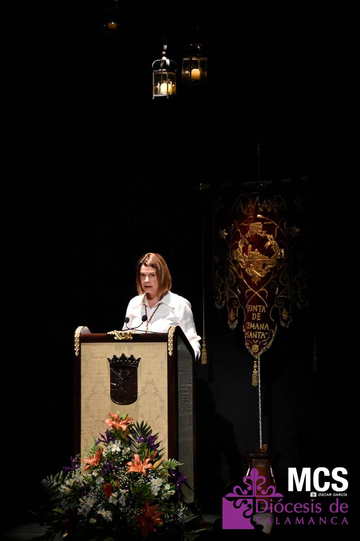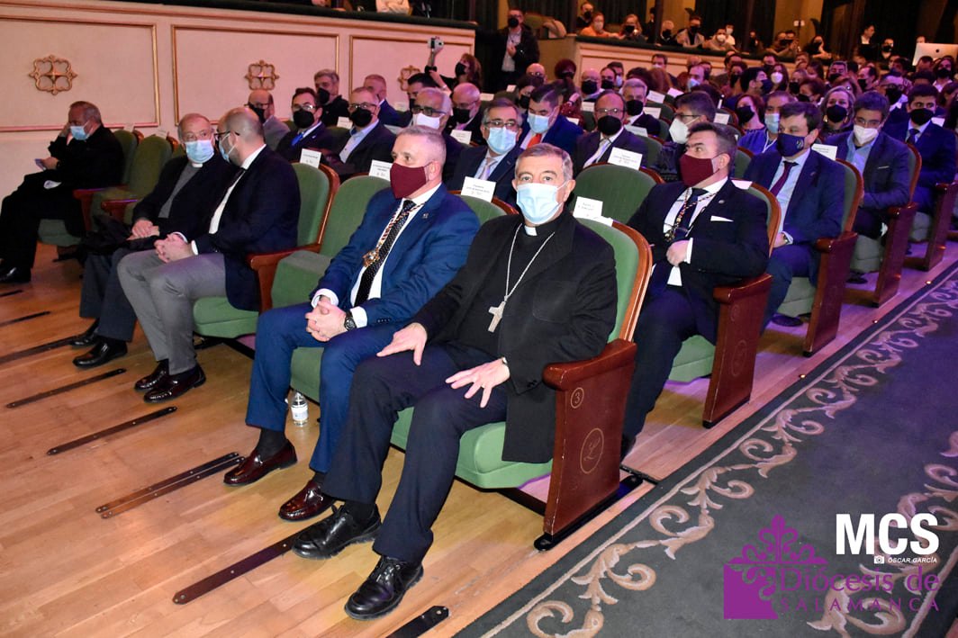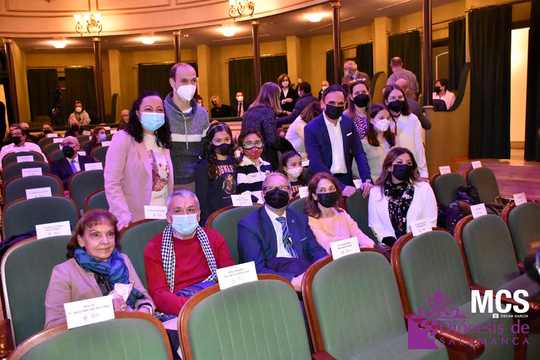 Sobre el escenario también recibió una llamada, y un relato de su labor, de los cofrades que ha conocido y que llenan su agenda del teléfono móvil. También tuvo un recuerdo a sus compañeros de profesión que escriben y fotografían la Pasión de Salamanca, y de forma especial, a algunos periodistas que ya no están entre nosotros, como José Manuel Blanco (Josito), o Celia Sánchez.