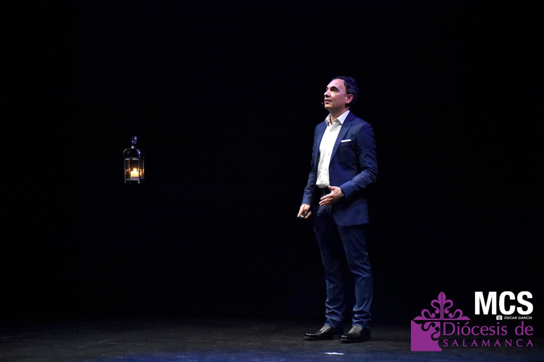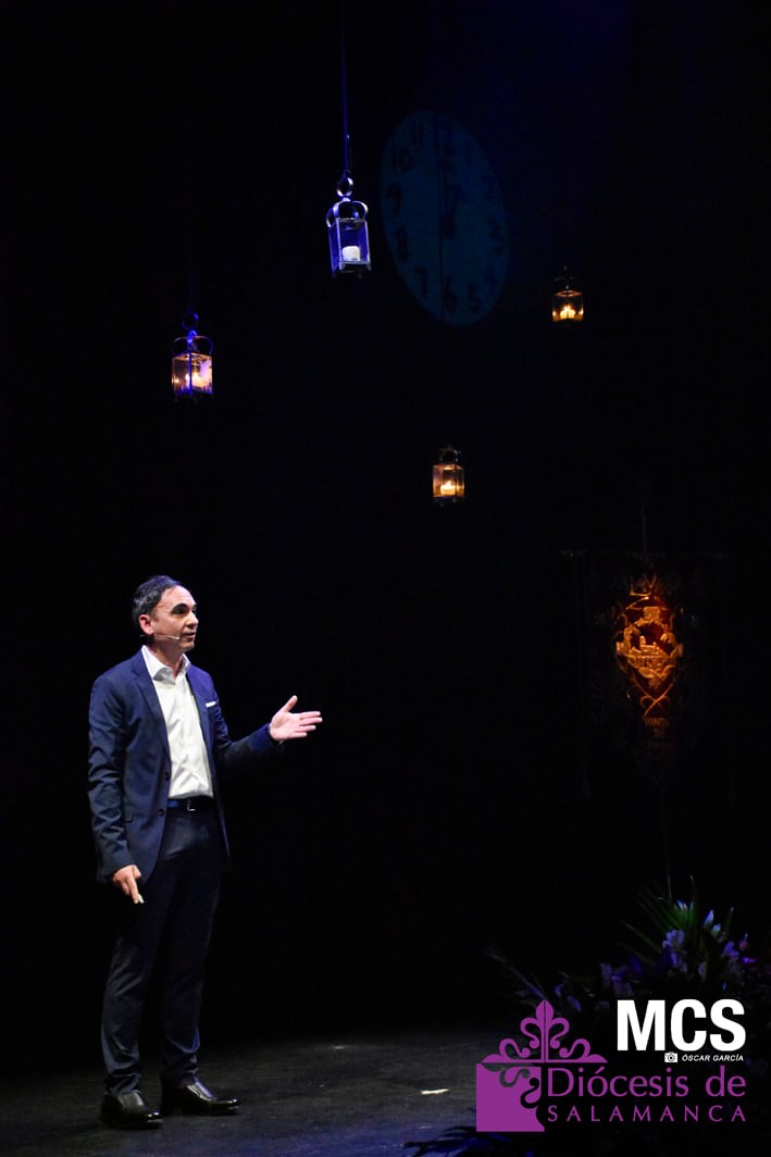 Antes de concluir su pregón, el escenario se iluminó con un sepulcro vacío en el centro, huellas de Jesús Resucitado. “Hay un universo que contiene la respiración, que espera. Hay un sepulcro vacío y un Resucitado que proclama la primavera”, concluía.