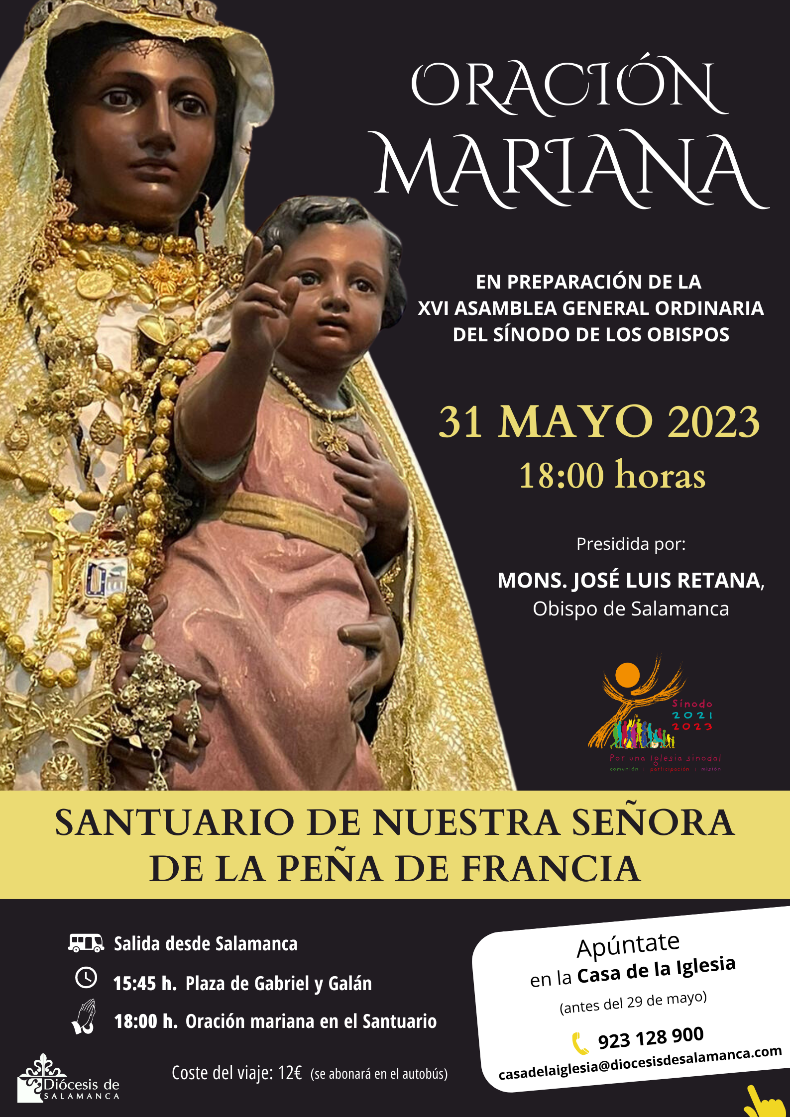 El prelado salmantino secunda así la petición realizada por el subsecretario del Sínodo de los Obispos, Mons. José Luis Marín de San Martín, a los presidentes de las Conferencias Episcopales solicitando que se disponga, en las diócesis de todo el mundo, la celebración de una oración ese día, 31 de mayo, en un santuario mariano para confiar a la Virgen el proceso sinodal. La finalidad de esta oración es «hacer consciente al pueblo de Dios de la importancia del proceso en curso y exhortar a los fieles a acompañarlo con la oración».