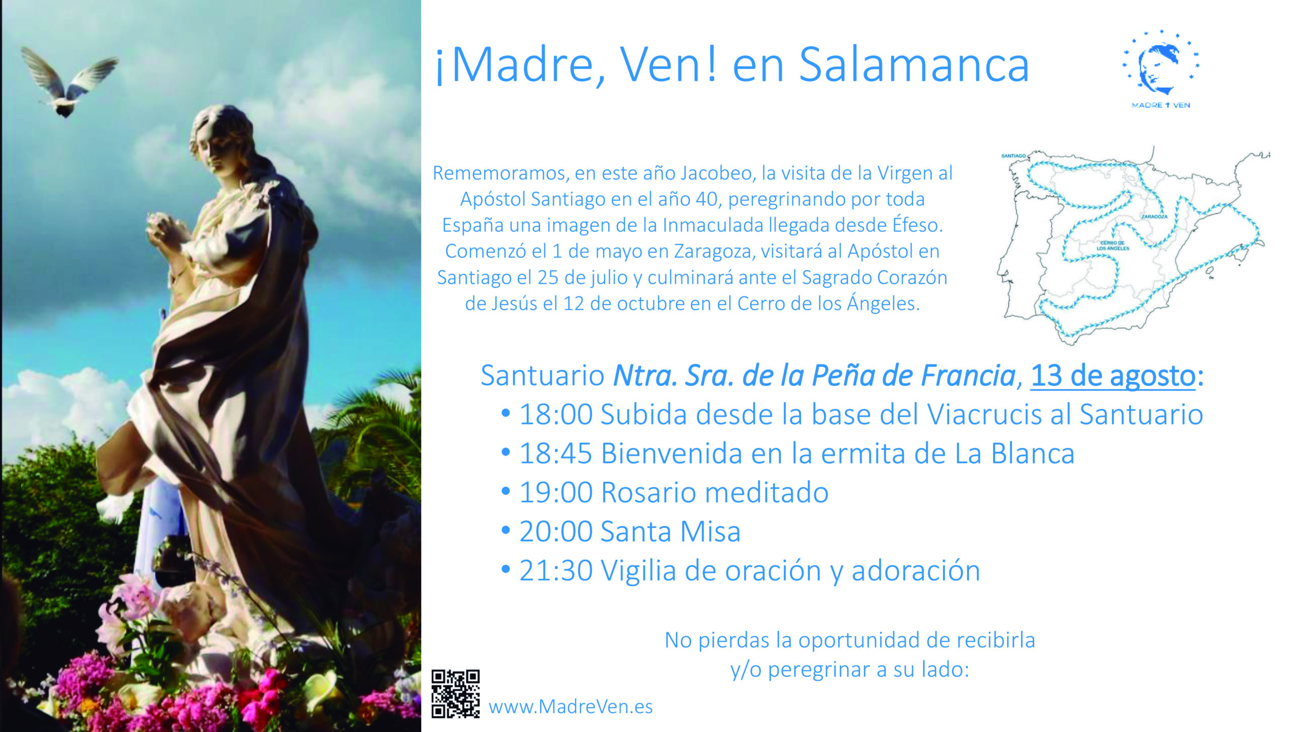 Este viernes, 13 de agosto, llegará a Salamanca, en concreto, al santuario de Nuestra Señora de la Peña de Francia. La subida está prevista para las 18:00 horas, desde la base del viacrucis al templo. A las 18:45 horas tendrá lugar la bienvenida de La Blanca en la ermita, y a las 19:00 horas comenzará el rosario meditado y la posterior santa misa, a las 20:00 horas. Finalmente, a las 21:30 horas, celebrarán una vigilia de oración y adoración.