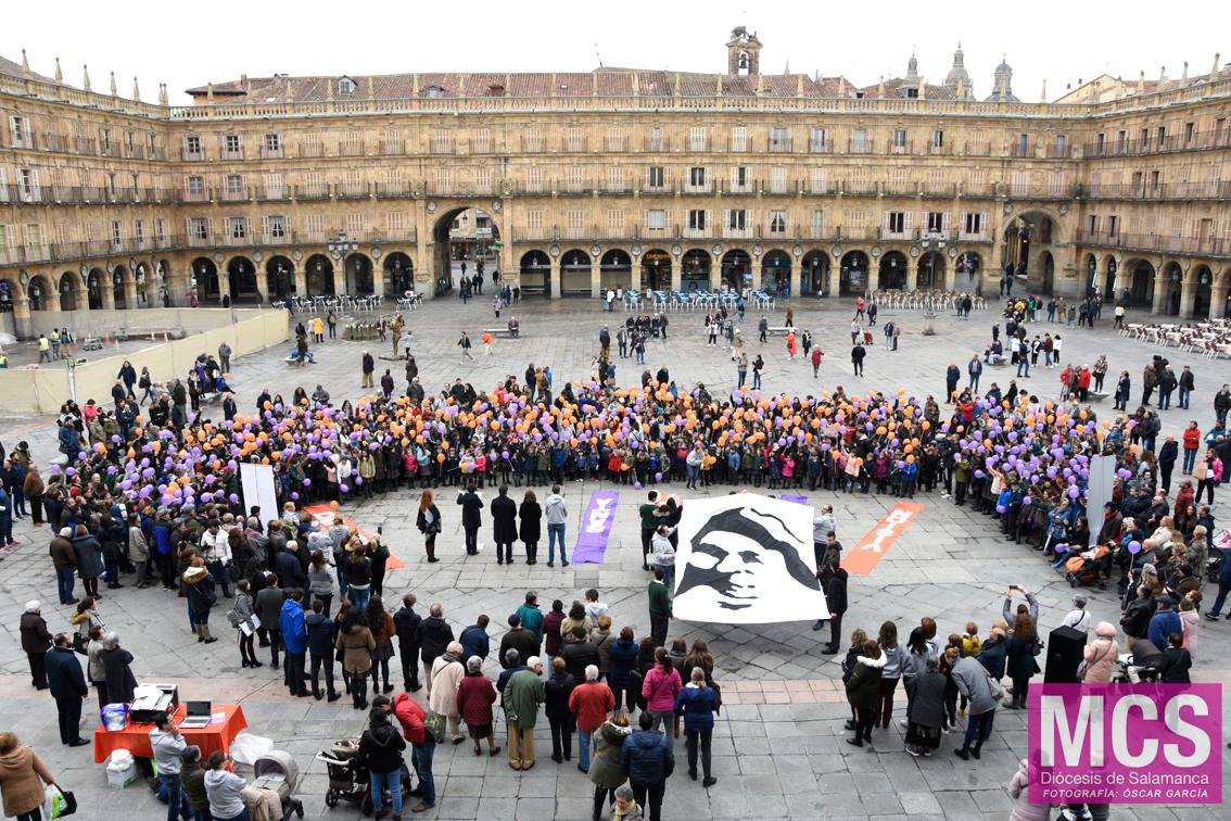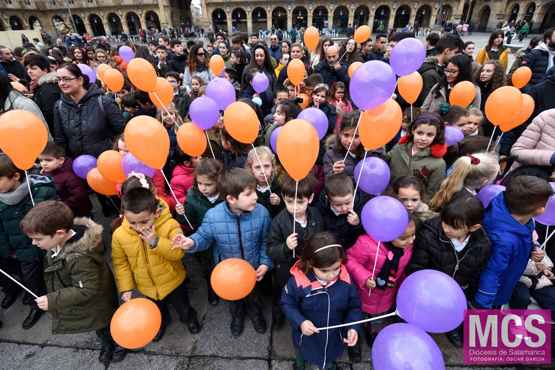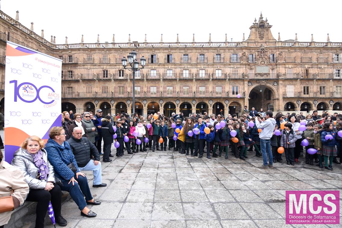 Cuatro palabras resumían la trayectoria de la fundadora del Colegio Sagrado Corazón, las Jesuitinas, Santa Cándida María de Jesús, durante el acto que ha tenido lugar en la mañana de ese martes, 19 de febrero, en el epicentro de la capital, la Plaza Mayor. En grandes telas sobre el suelo se podía leer: visión, sueño, santa y contigo. Los alumnos, de diferentes etapas educativas, portaban un globo con los colores del emblema del colegio y escuchaban con atención los mensajes que iban diciendo en relación a esta efemérides tan importante para todos ellos.