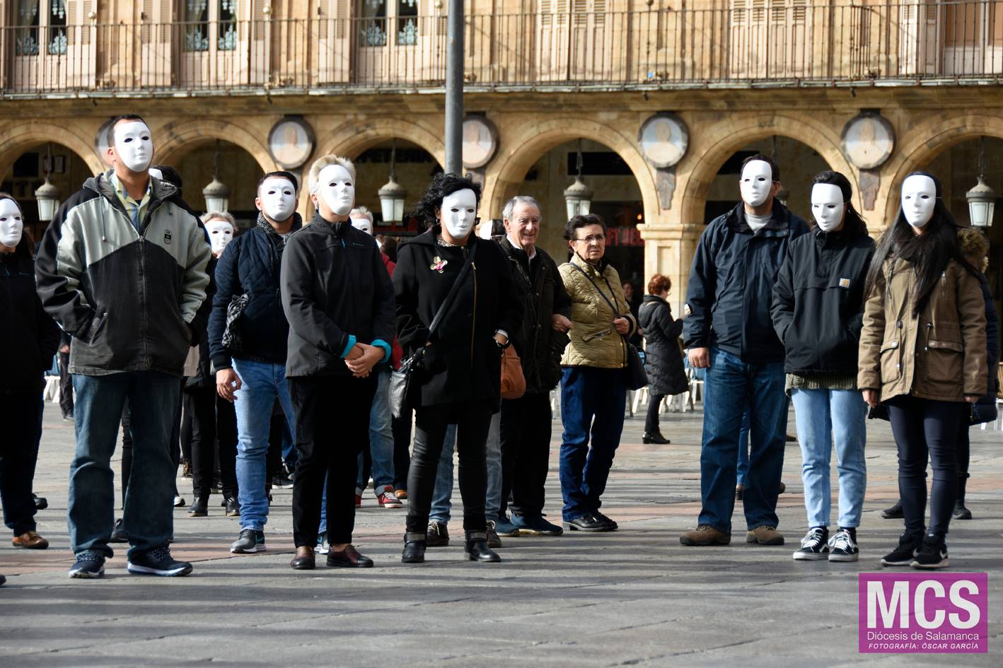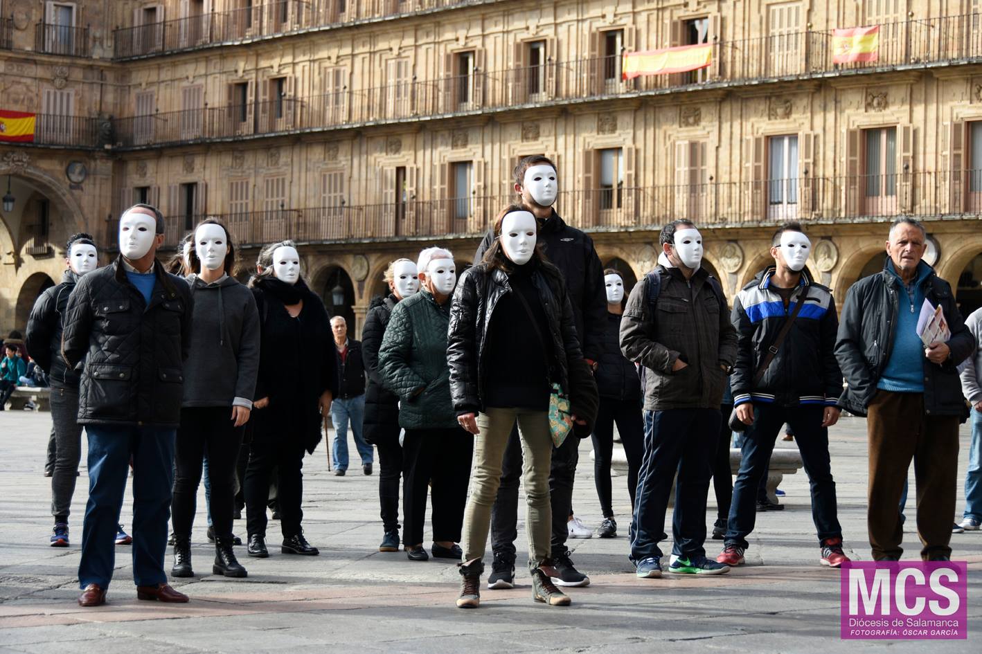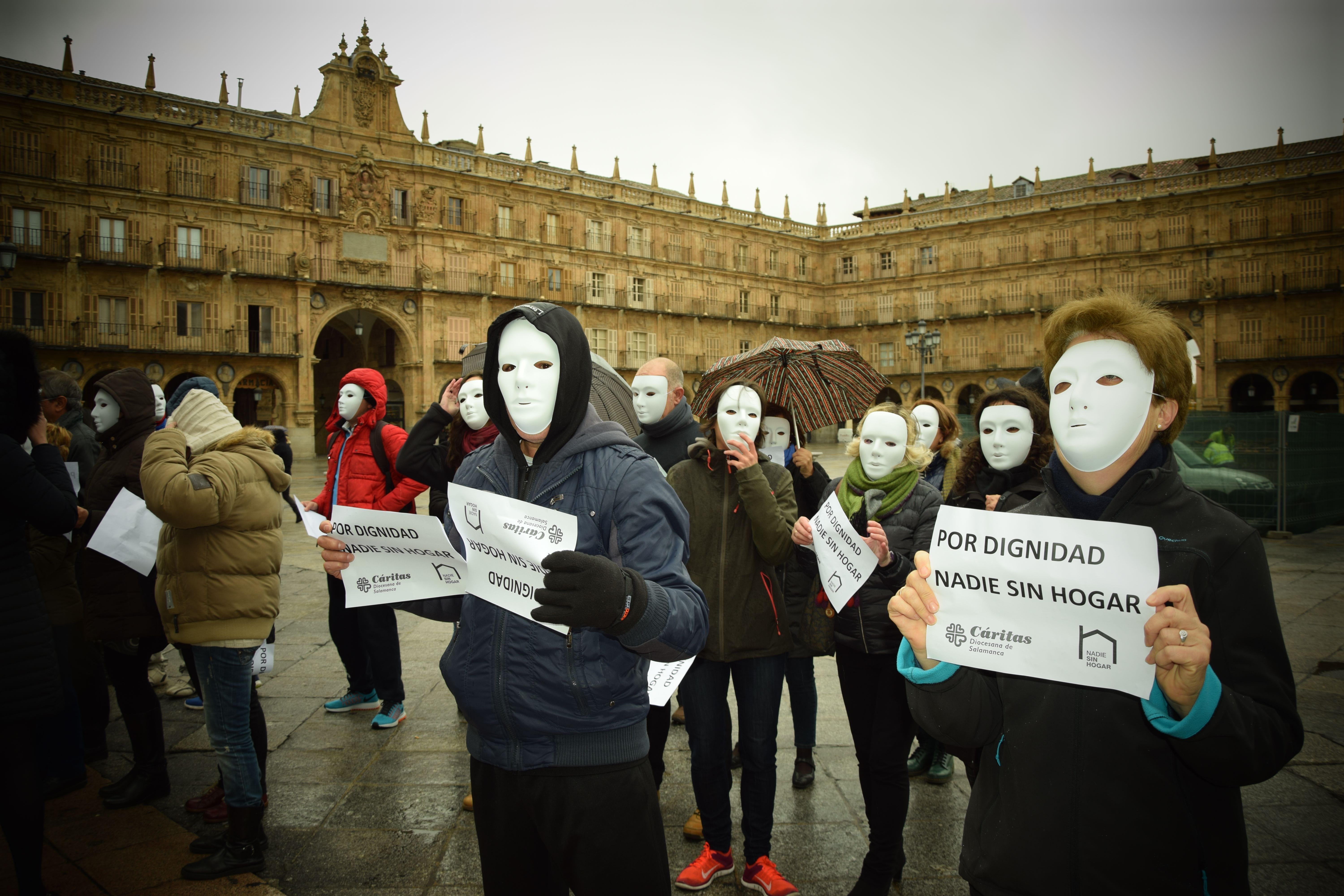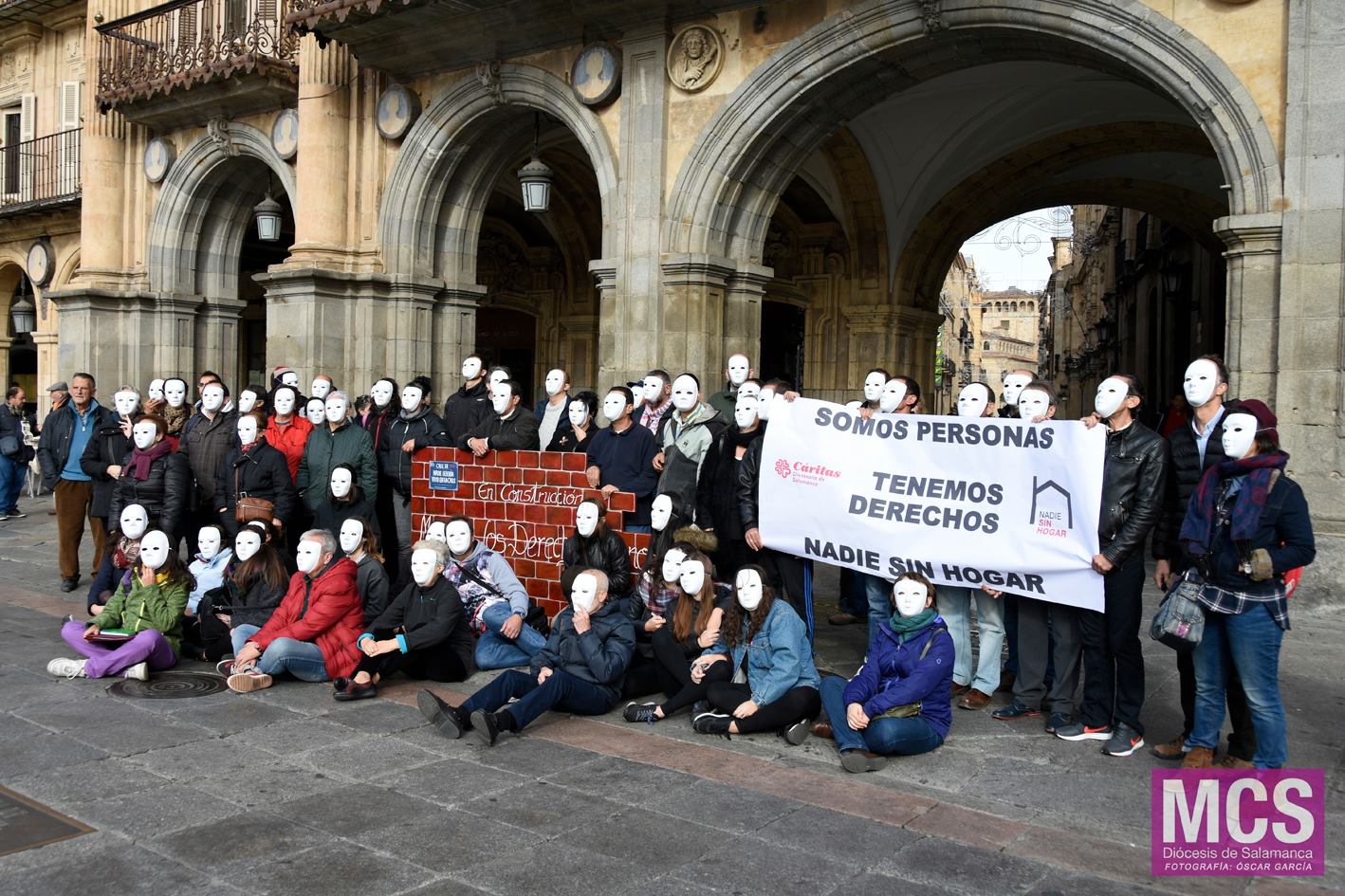 Cáritas diocesana de Salamanca convocó a participar en un flashmob de apoyo a las Personas sin hogar, el pasado jueves 23 de noviembre, a las 12.00 del mediodía en la Plaza Mayor de Salamanca. Un acto cargado de simbolismo con el que se pretendió dar visibilidad a la realidad de las personas sin hogar y reivindicar sus derechos . Al finalizar se hizo lectura de un manifiesto.