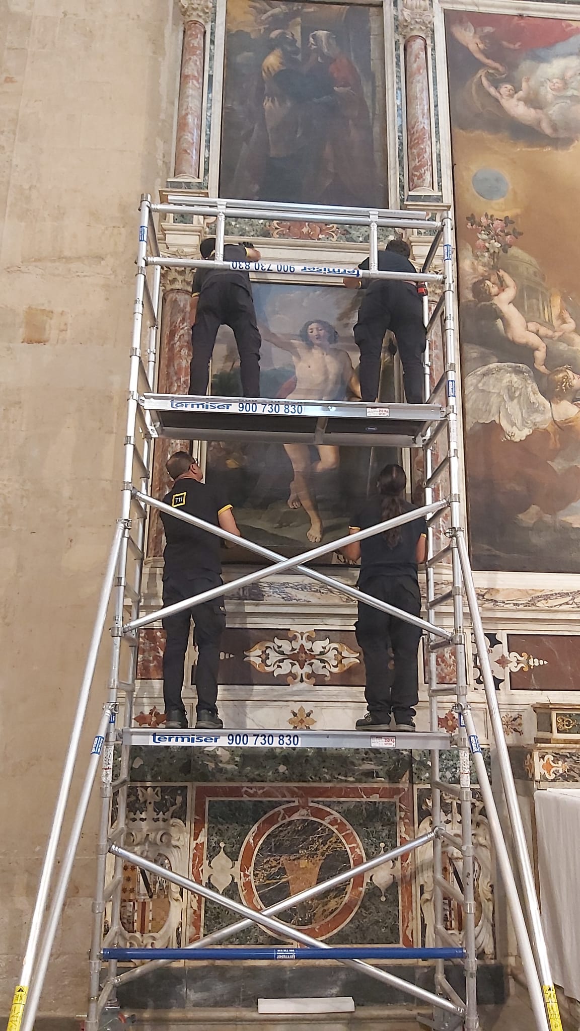 El proceso de limpieza de la superficie pictórica ha logrado recuperar la luminosidad y los vibrantes colores de esta obra de Reni, propiedad de las Madres Agustinas, que podemos disfrutar de nuevo en su lugar original, en la parte inferior izquierda del retablo del altar mayor, de la iglesia de La Purísima, donde se ha colocado este viernes.