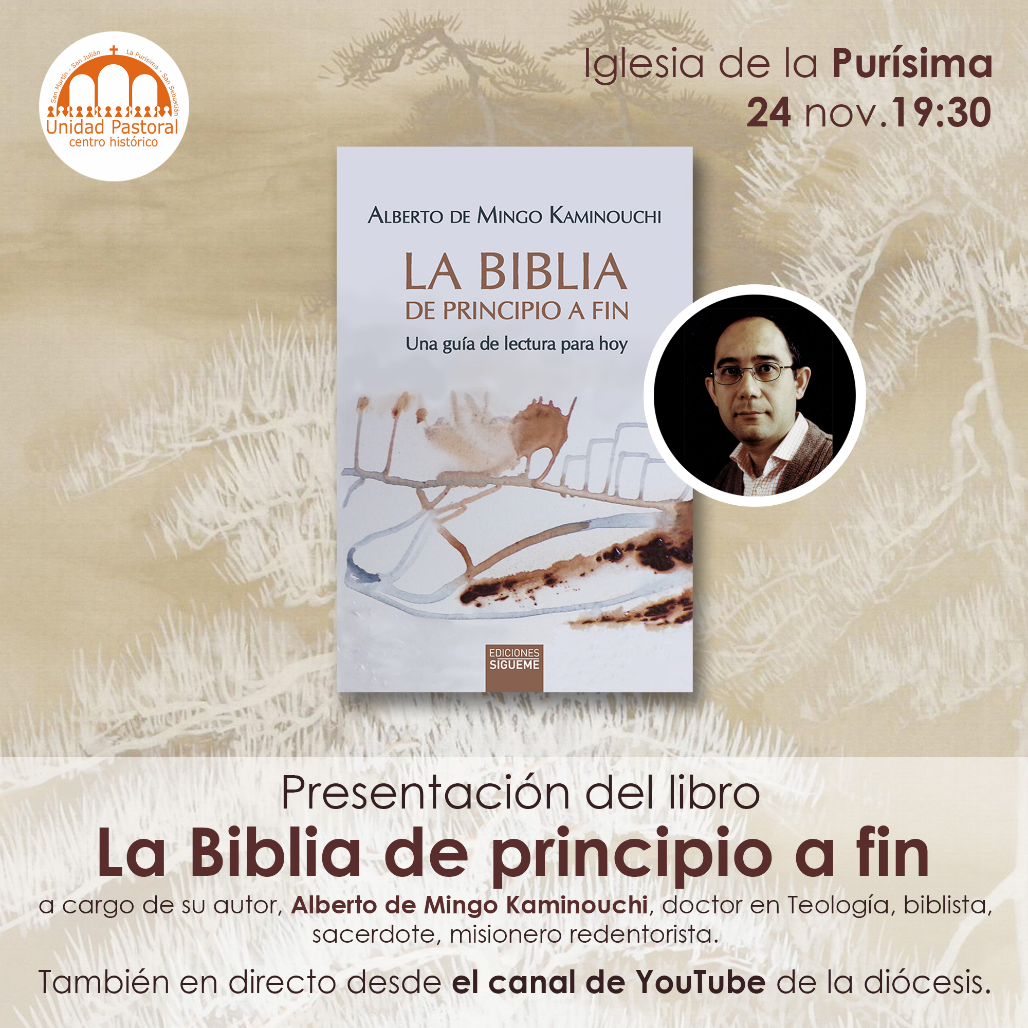El próximo martes, 24 de noviembre, la iglesia de la Purísima, en Salamanca, acogerá la presentación del libro: “La Biblia de principio a fin”, de Alberto de Mingo, profesor de teología moral bíblica en la Saint Louis University de Madrid y la Academia Alfonsiana de Roma. El acto ha sido promovido por los Grupos Bíblicos de la Unidad Pastoral Centro Histórico y es el primero de los nueve encuentros que se van a desarrollar a lo largo de este curso 2020-2021.