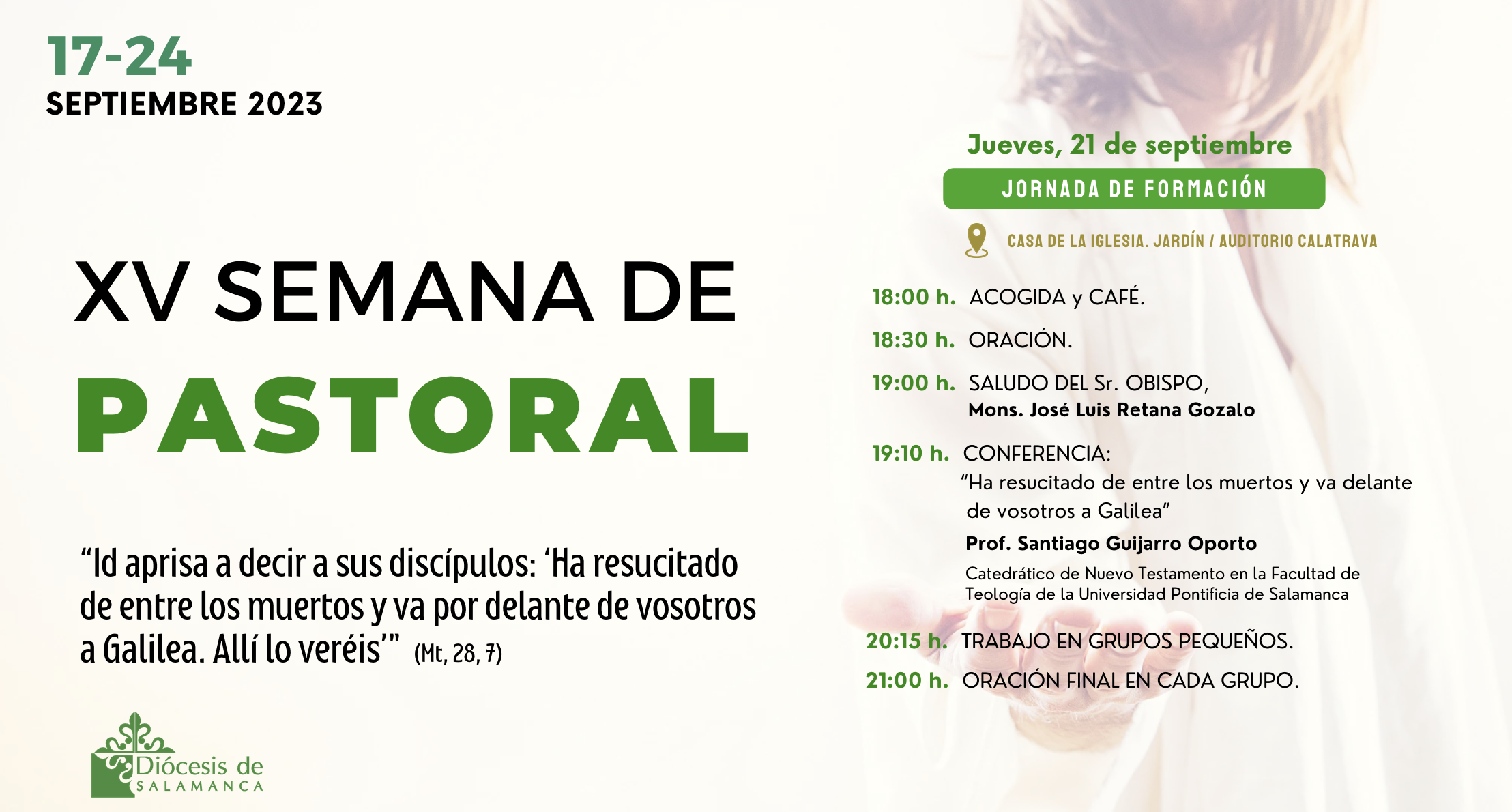 El tiempo diocesano de la XV Semana de Pastoral arranca este jueves, 21 de septiembre, en la Casa de la Iglesia, con una jornada de formación dirigida a toda la comunidad que conforma la Iglesia en Salamanca. En esta ocasión el lema elegido es un versículo de Mateo 28,7: “Id aprisa a decir a sus discípulos: Ha resucitado de entre los muertos y va por delante de vosotros a Galilea. Allí lo veréis”. La acogida tendrá lugar a las seis de la tarde en los jardines, con un café, y a continuación, una oración.