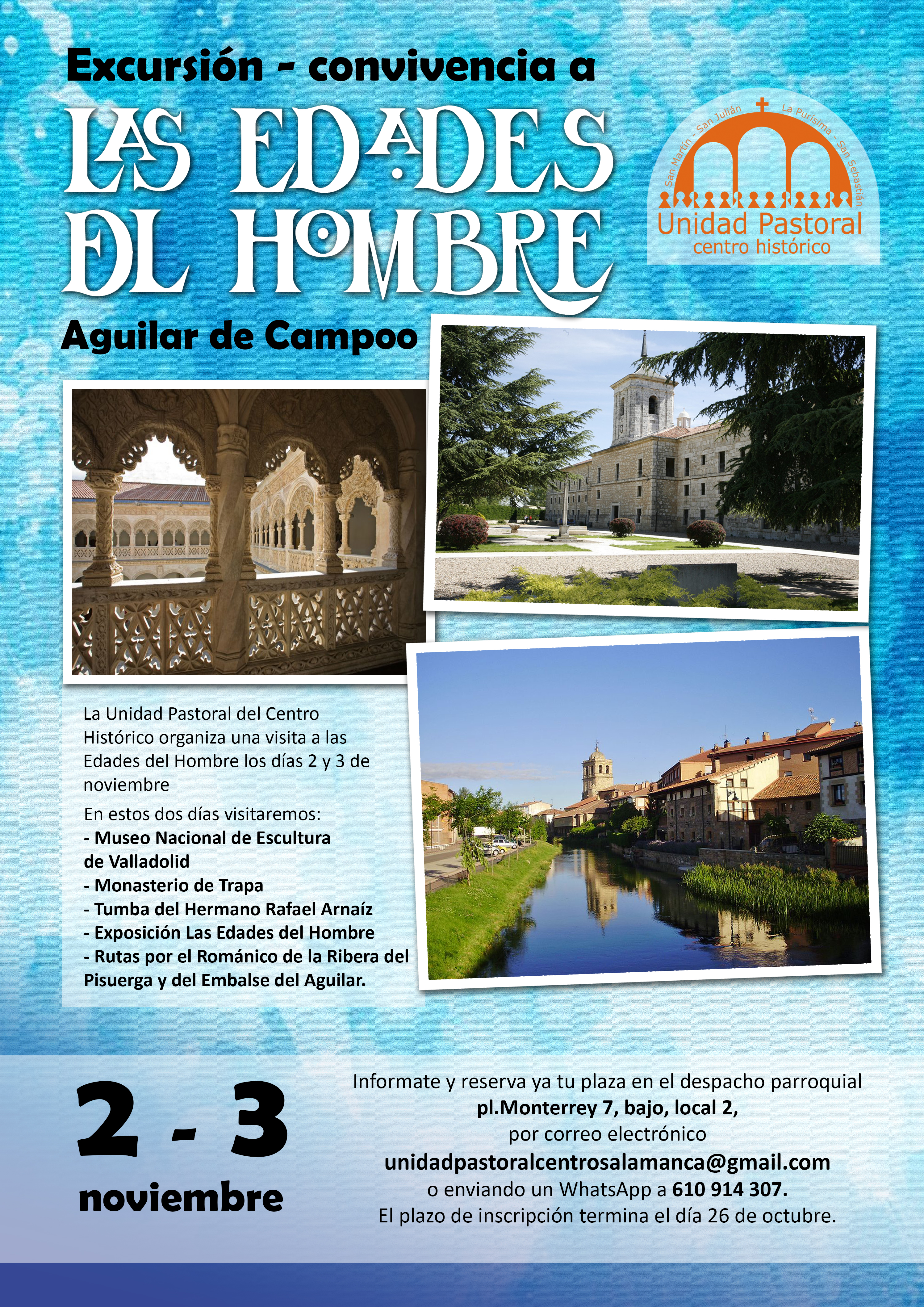 Las parroquias que integran la Unidad Pastoral Centro Histórico de Salamanca (San Martín, San Julián, La Purísima y San Sebastián) han organizado una excursión-convivencia a las Edades del Hombre, en la localidad palentina de Aguilar de Campo los días 2 y 3 de noviembre. Además de visitar ‘Mons Dei’, la vigésimo tercera exposición de Las Edades que aborda el significado de la montaña dentro de la tradición simbólica cristiana, los participantes conocerán el Museo Nacional de Escultura de Valladolid; el Monasterio de la Trapa o de San Isidro de Dueñas donde visitarán el sepulcro de San Rafael Arnáiz Barón, conocido como Hermano Rafael, considerado como uno de los grandes místicos del Siglo XX; y, realizarán rutas por el románico de la Ribera del Pisuerga y del Embalse del Aguilar.