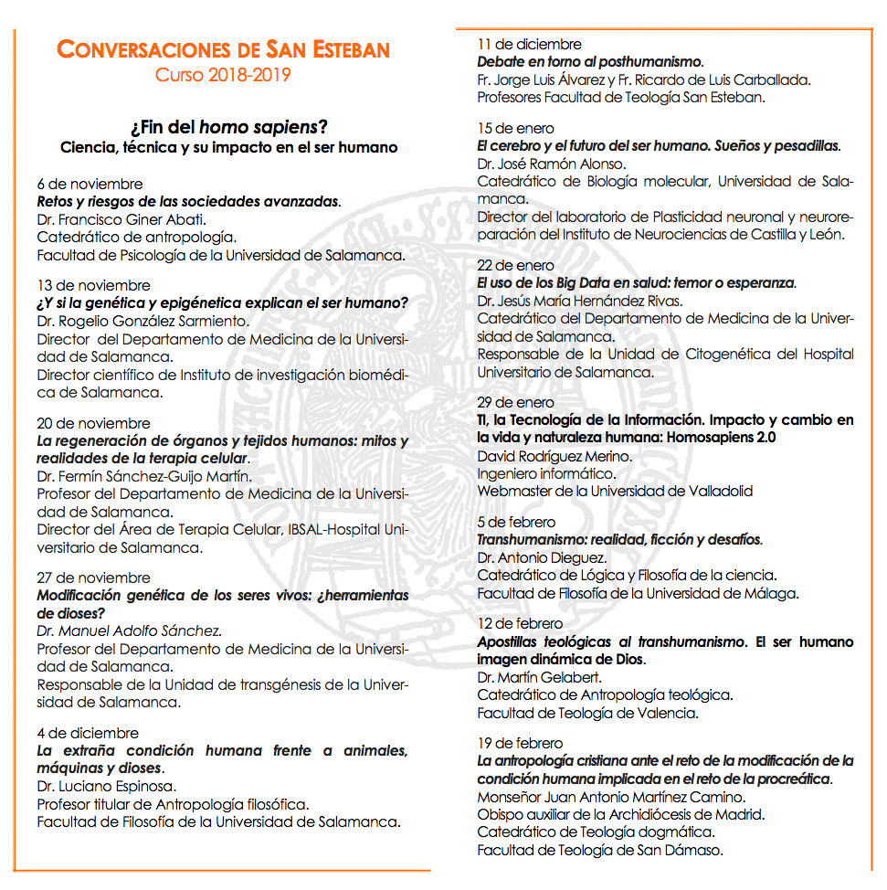 El martes 11 de diciembre tendrá lugar la sexta sesión de las XLVII Conversaciones de San Esteban que organiza la Facultad de Teología de los Dominicos de Salamanca y que este asño se cuestionan sobre “¿El final del Homo Sapiens?: Ciencia, tecnología y modificación de la naturaleza”. En esta ocasión los religiosos dominicos Jorge Luis Álvarez y Ricardo de Luis Carballada participarán en un debate en torno al posthumanismo. El acto dará comienzo a las 20.00 horas en el Aula Magna del Convento de San Esteban.