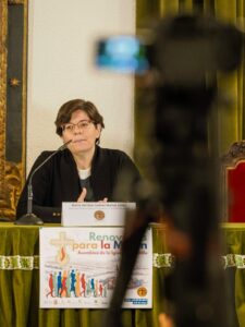 La misionera oblata de María Inmaculada, María del Mar Gómez Mañas, explicó el proceso que se está siguiendo en las diócesis para preparar la Asamblea. Señaló que este trabajo “busca ante todo responder a una llamada a la conversión pastoral integral en sus diversas dimensiones, tanto personal como comunitaria como estructural”.