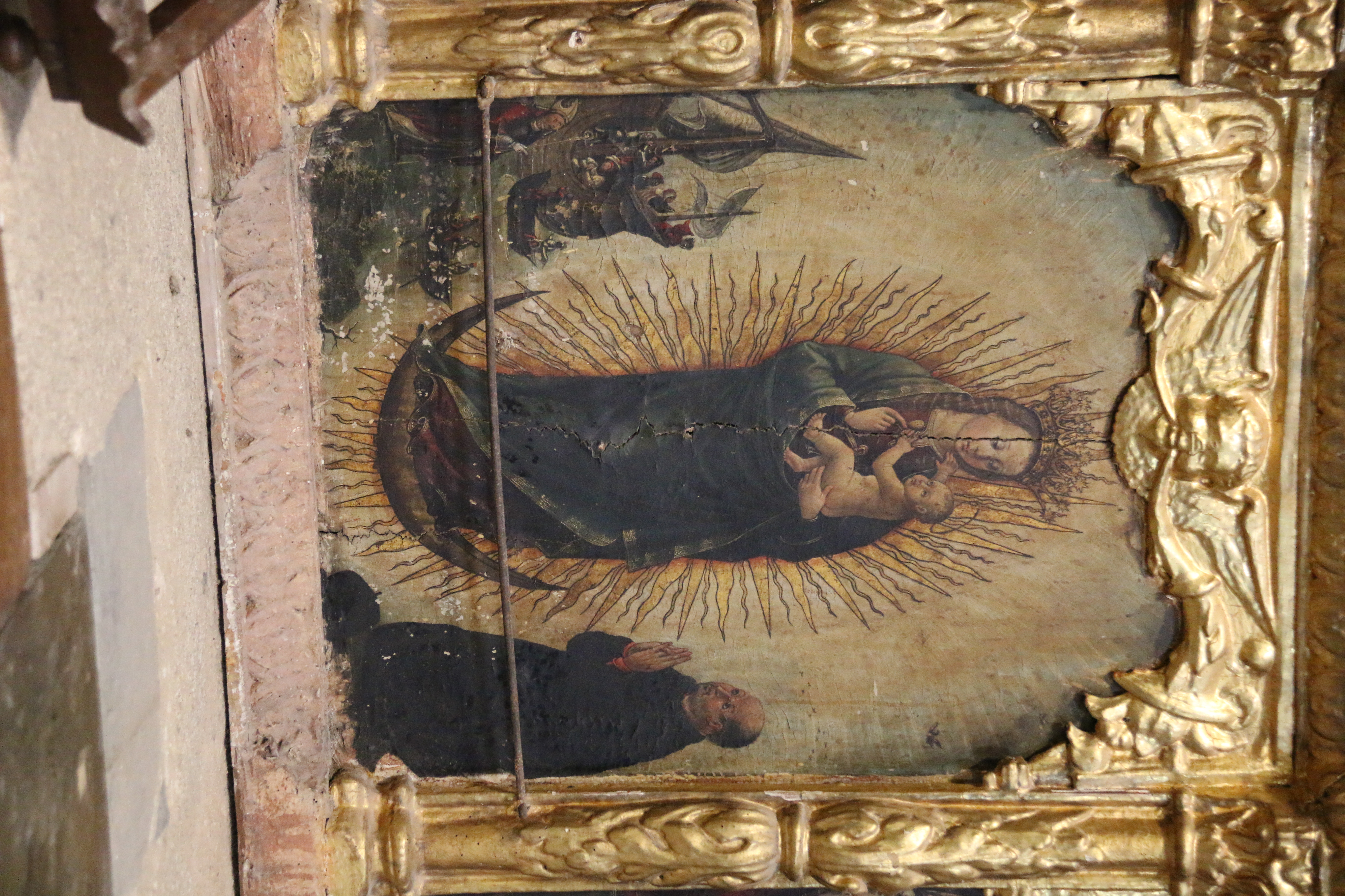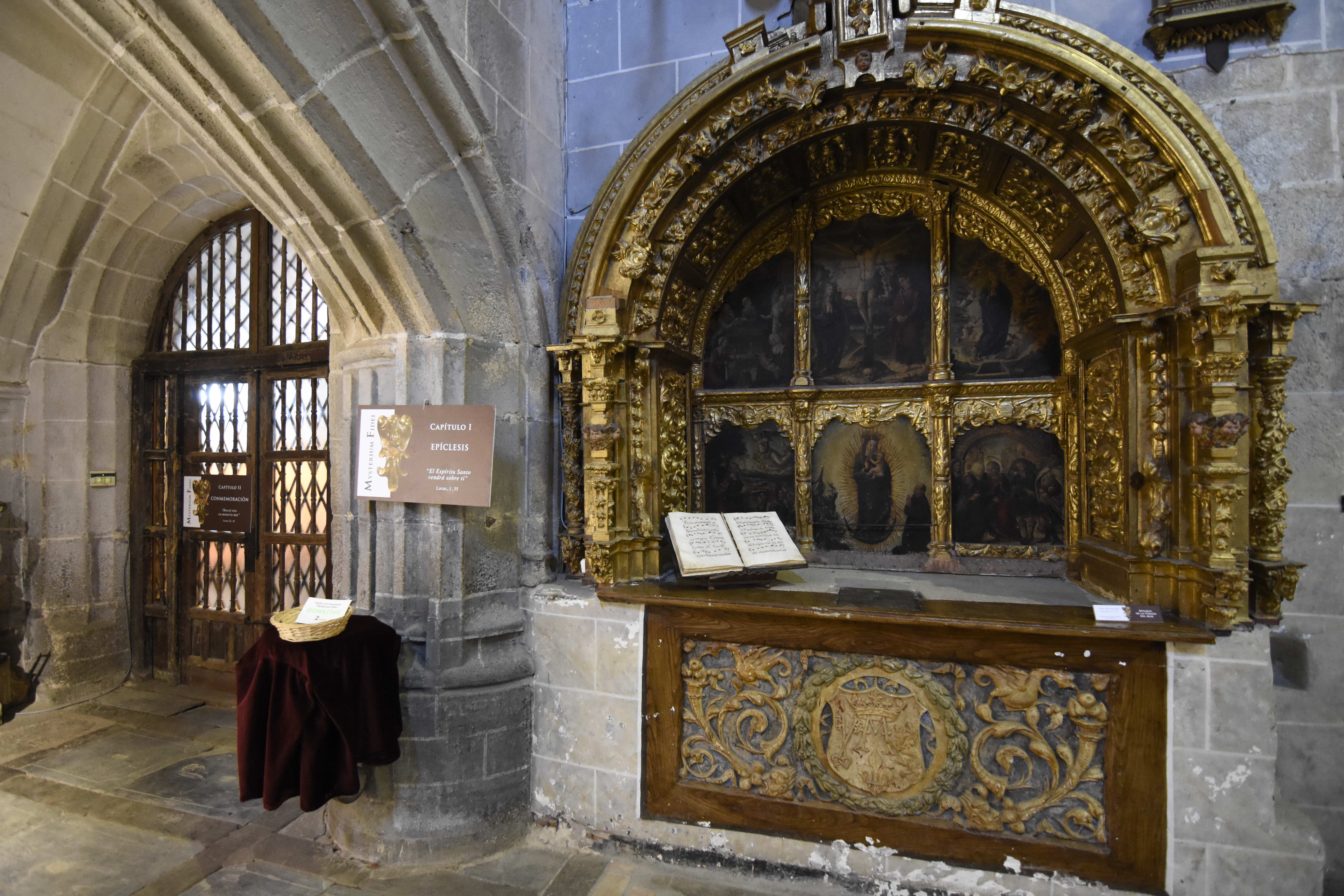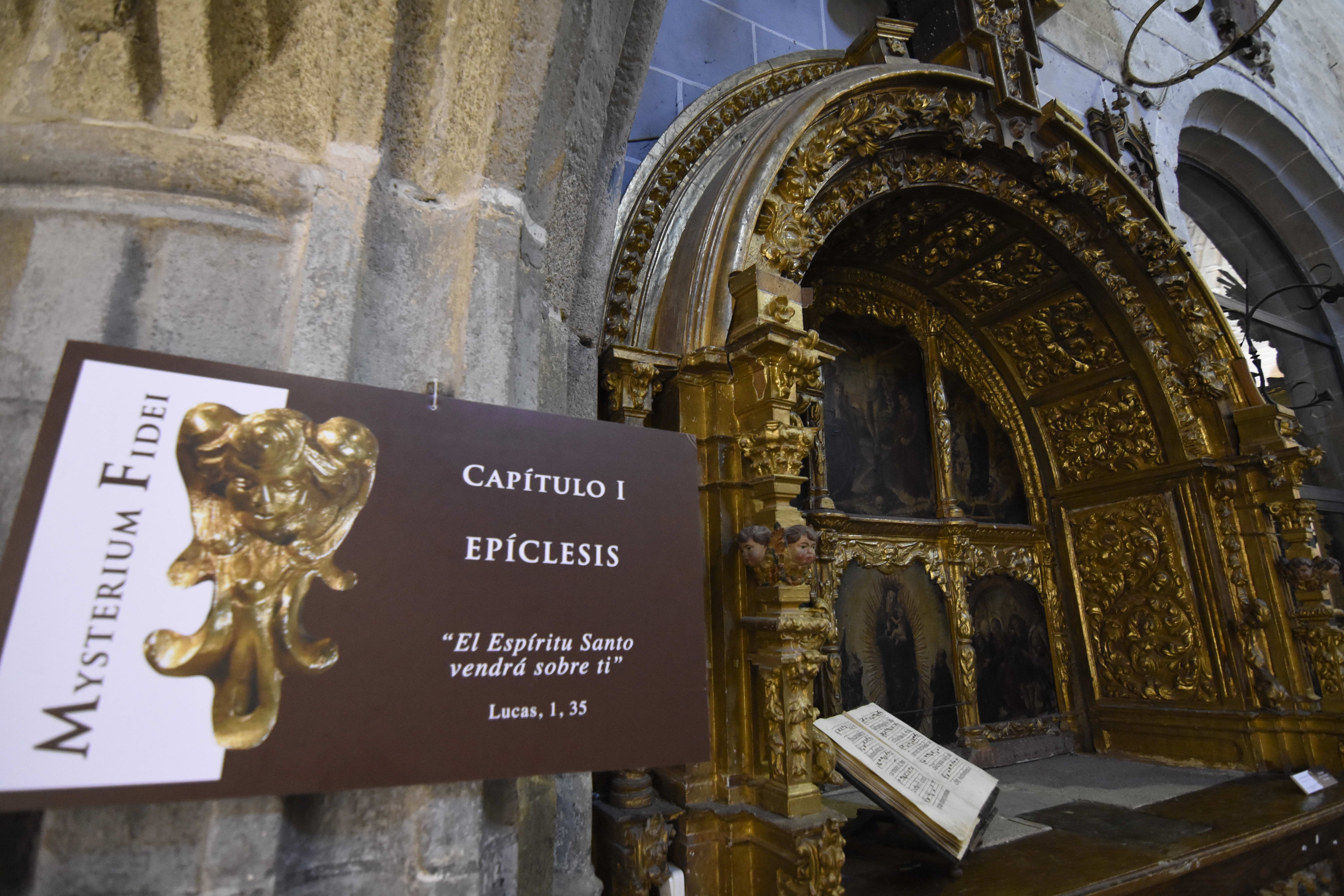 La muestra se divide en cuatro capítulos que recorre toda la simbología de la eucaristía, “como celebración y como presencia”, apunta el párroco de Ledesma, Emilio Vicente de Paz. Y todo ello con un sentido teológico. El primer capítulo lleva por título ‘Epíclesis’, que es el nombre que se le da a la extensión de manos del sacerdote sobre el pan y el vino para que sean transformados en el cuerpo y la sangre de Cristo. En esta parte de la exposición destaca el retablo dedicado a la Virgen del Mar, del siglo XVI, de un discípulo de Juan de Flandes, “con una calidad pictórica grande”, apunta uno de los responsables de la muestra, Roberto Velasco. De las seis tablas del retablo, tres están dedicadas a los padres de la Virgen, quienes aparecen en los textos apócrifos. En el centro está representada la Virgen del Mar, también conocida como de la Pera, aunque en realidad, según detallan, es un higo.