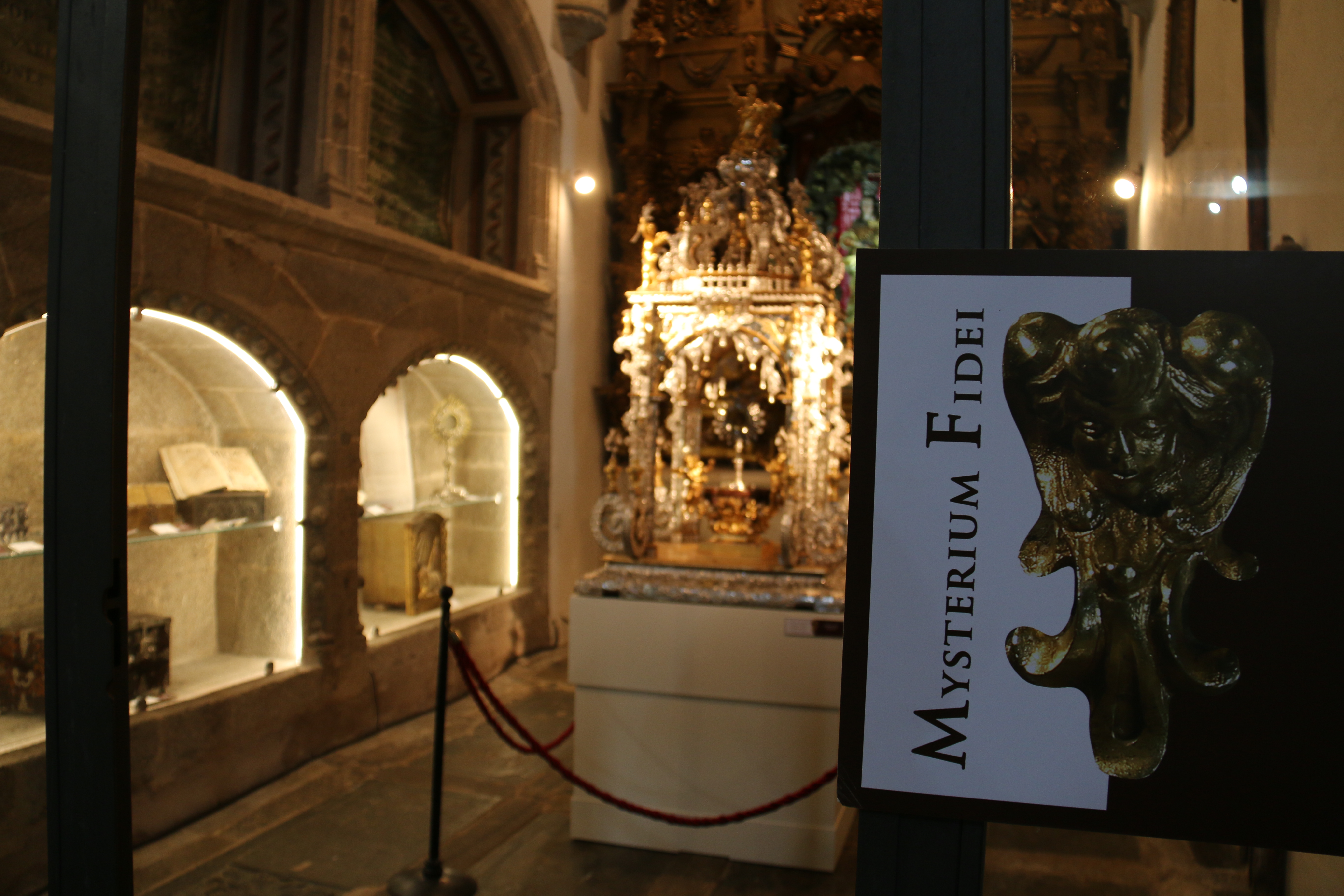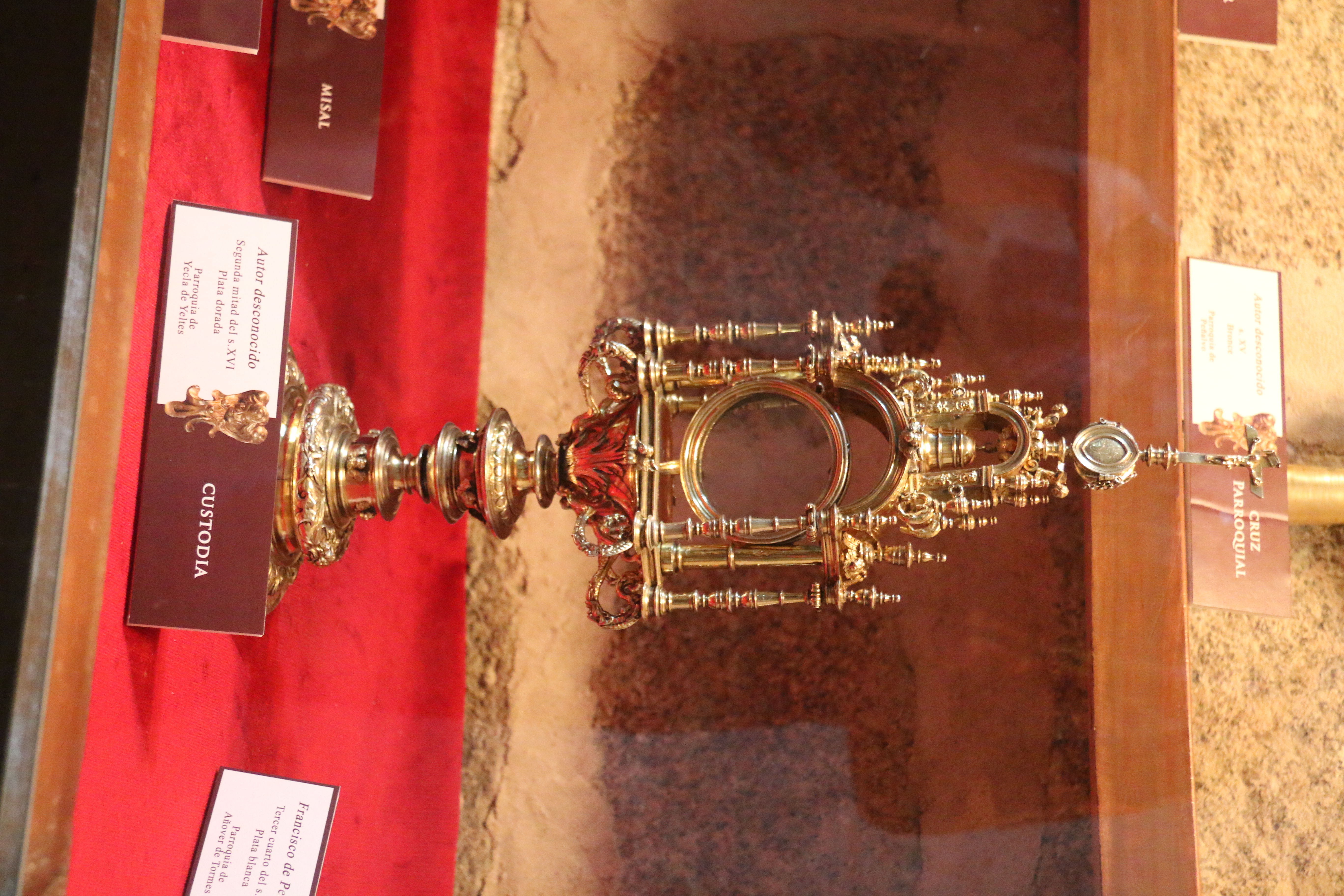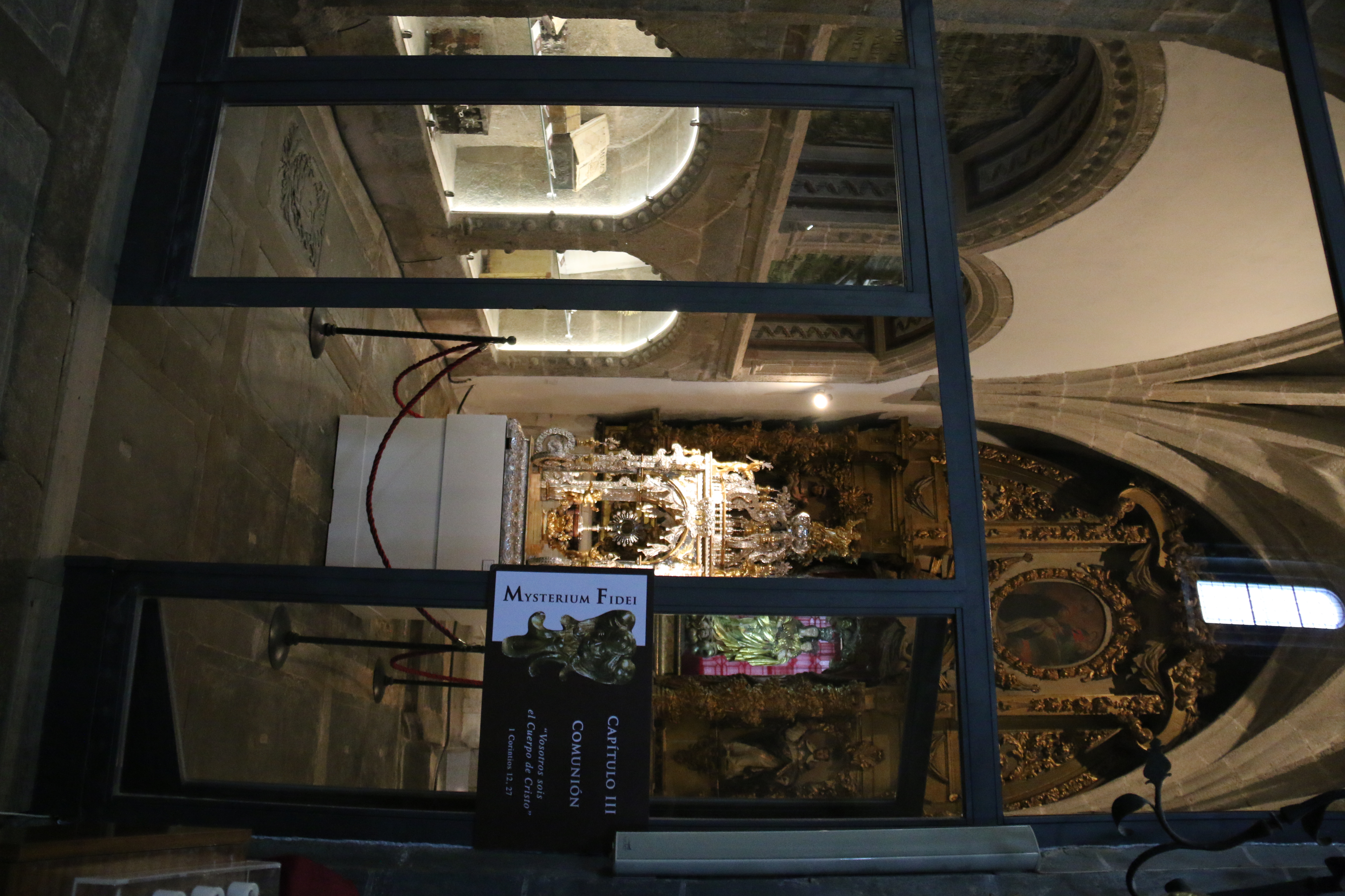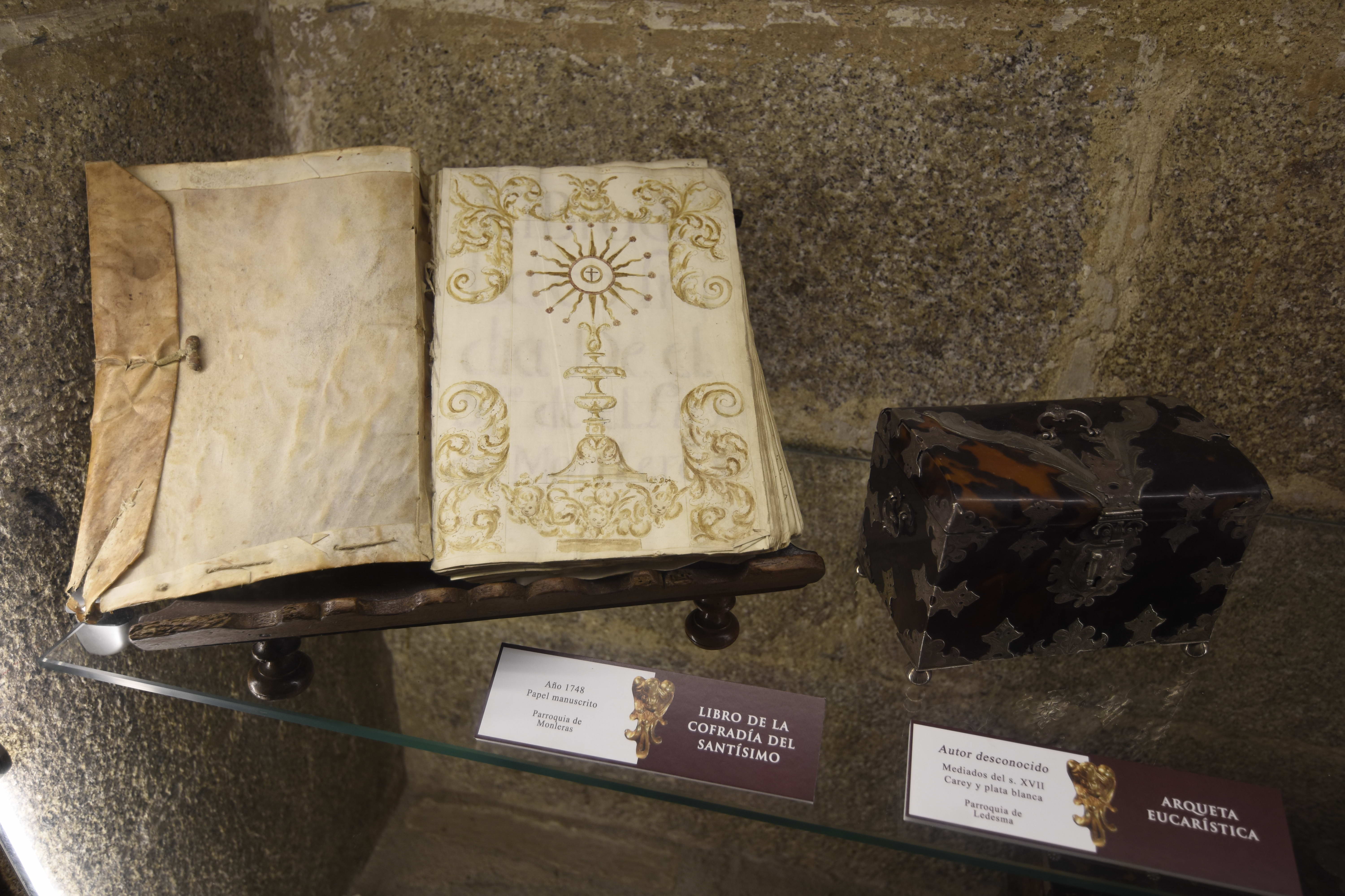 En toda la cartelería de la exposición se aprecia una ménsula de las andas eucarísticas, en concreto, la figura de un ángel. En los dos arcos de esta capilla se ha querido representar cómo se ha vivido la fiesta del Corpus en esta comarca, el primero, dedicado a Ledesma, y donde se encuentran objetivos vinculados a la primera cofradía del Santísimo, encontrado en el pajar de una casa, y donde se comprueba que fue una de las primeras cofradías de toda Salamanca en admitir como hermanas de pleno derecho a las mujeres, “a las que se denominaban cofradas”, explica Velasco. Asimismo, se pueden apreciar dos arquetas eucarísticas que se utilizaban el Jueves y el Viernes Santo para el monumento. La más antigua es del siglo XVI, y otras dos, del XVII. De estas últimas como detalle, se realizaron en México y son de carey de concha de tortuga que fueron donadas por la condesa de Ledesma. El elemento central es una custodia de altar que encargan en 1802 para el interior de la iglesia, para la adoración, “custodia de sol que llaman”, apunta.