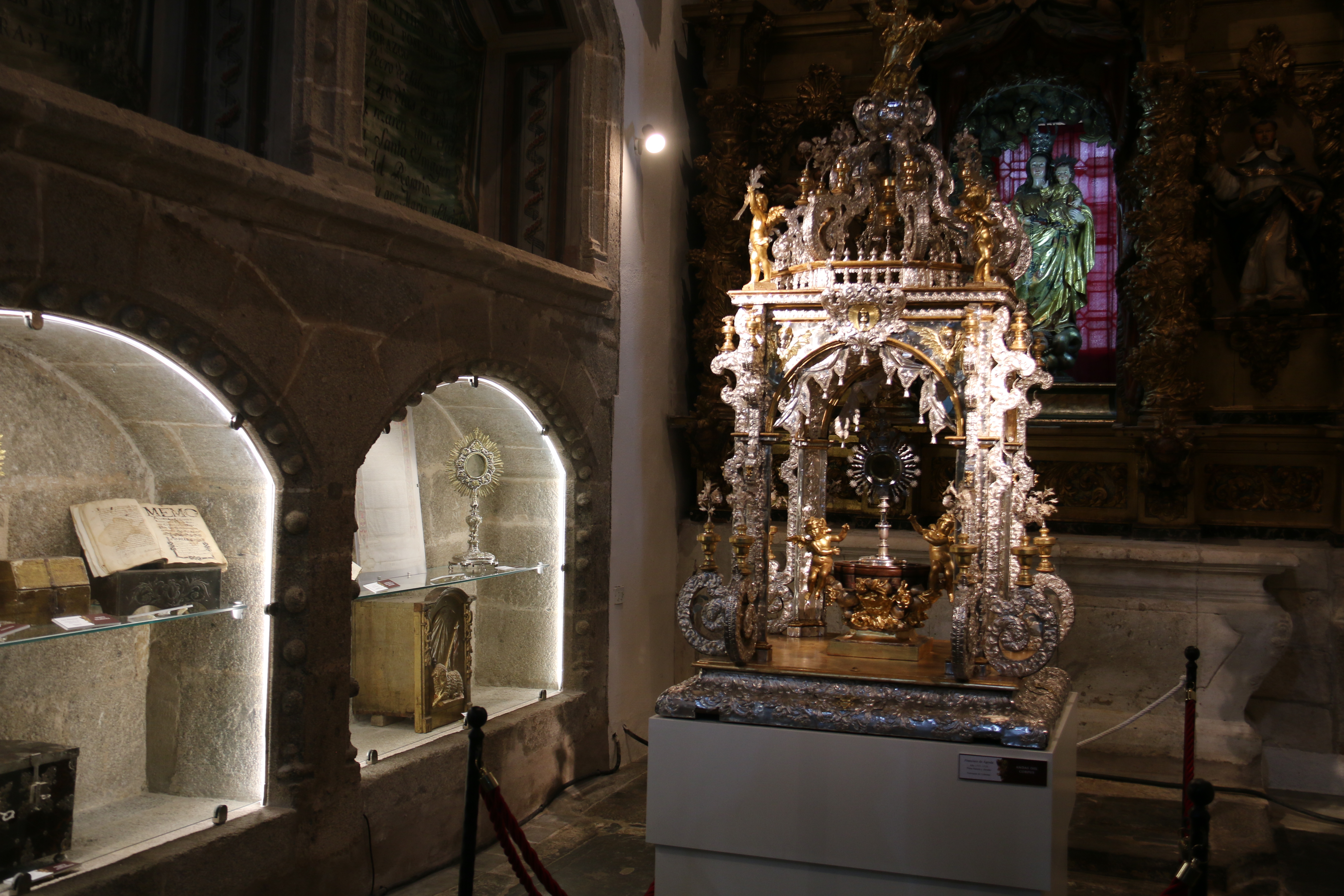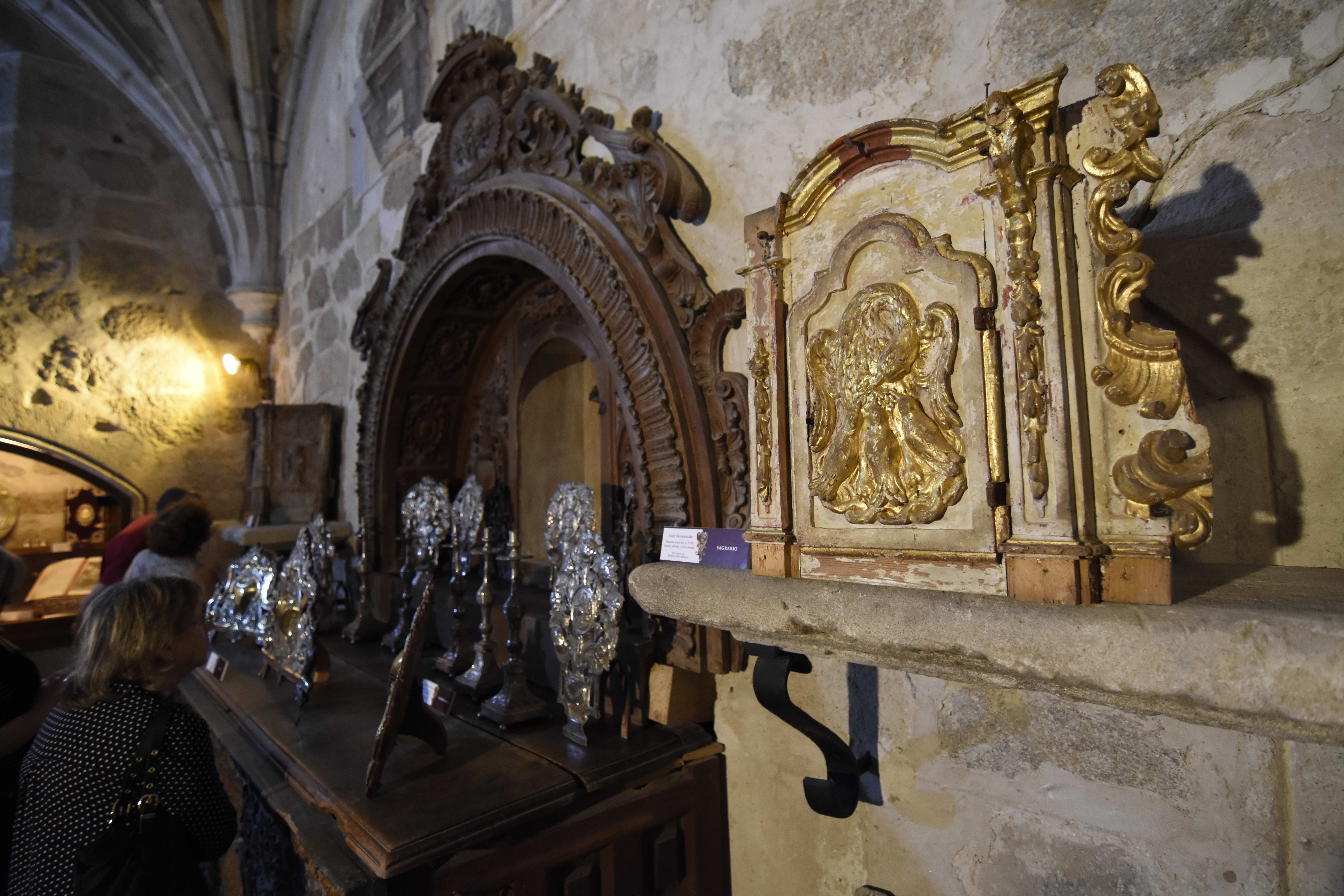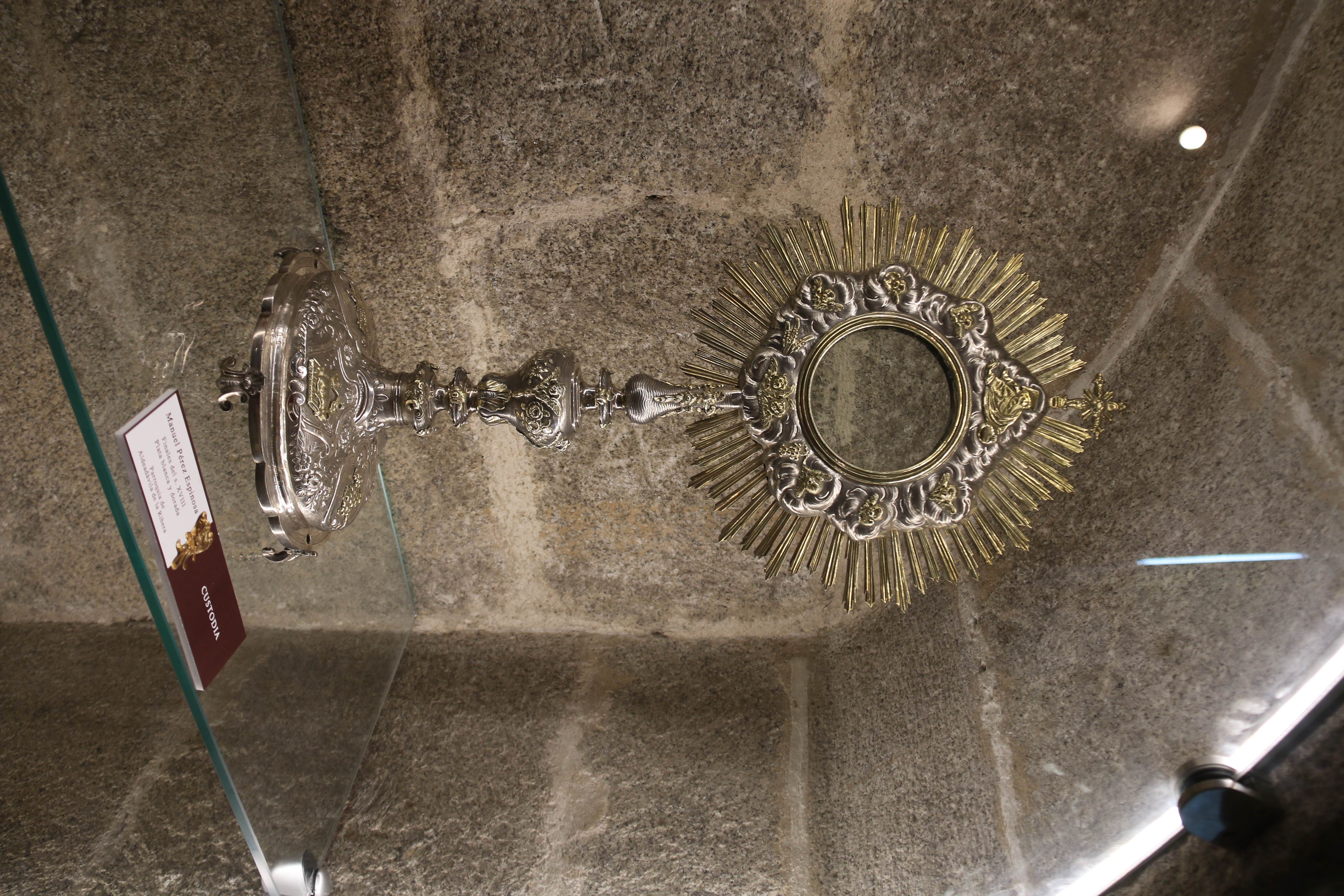 En toda la cartelería de la exposición se aprecia una ménsula de las andas eucarísticas, en concreto, la figura de un ángel. En los dos arcos de esta capilla se ha querido representar cómo se ha vivido la fiesta del Corpus en esta comarca, el primero, dedicado a Ledesma, y donde se encuentran objetivos vinculados a la primera cofradía del Santísimo, encontrado en el pajar de una casa, y donde se comprueba que fue una de las primeras cofradías de toda Salamanca en admitir como hermanas de pleno derecho a las mujeres, “a las que se denominaban cofradas”, explica Velasco. Asimismo, se pueden apreciar dos arquetas eucarísticas que se utilizaban el Jueves y el Viernes Santo para el monumento. La más antigua es del siglo XVI, y otras dos, del XVII. De estas últimas como detalle, se realizaron en México y son de carey de concha de tortuga que fueron donadas por la condesa de Ledesma. El elemento central es una custodia de altar que encargan en 1802 para el interior de la iglesia, para la adoración, “custodia de sol que llaman”, apunta.