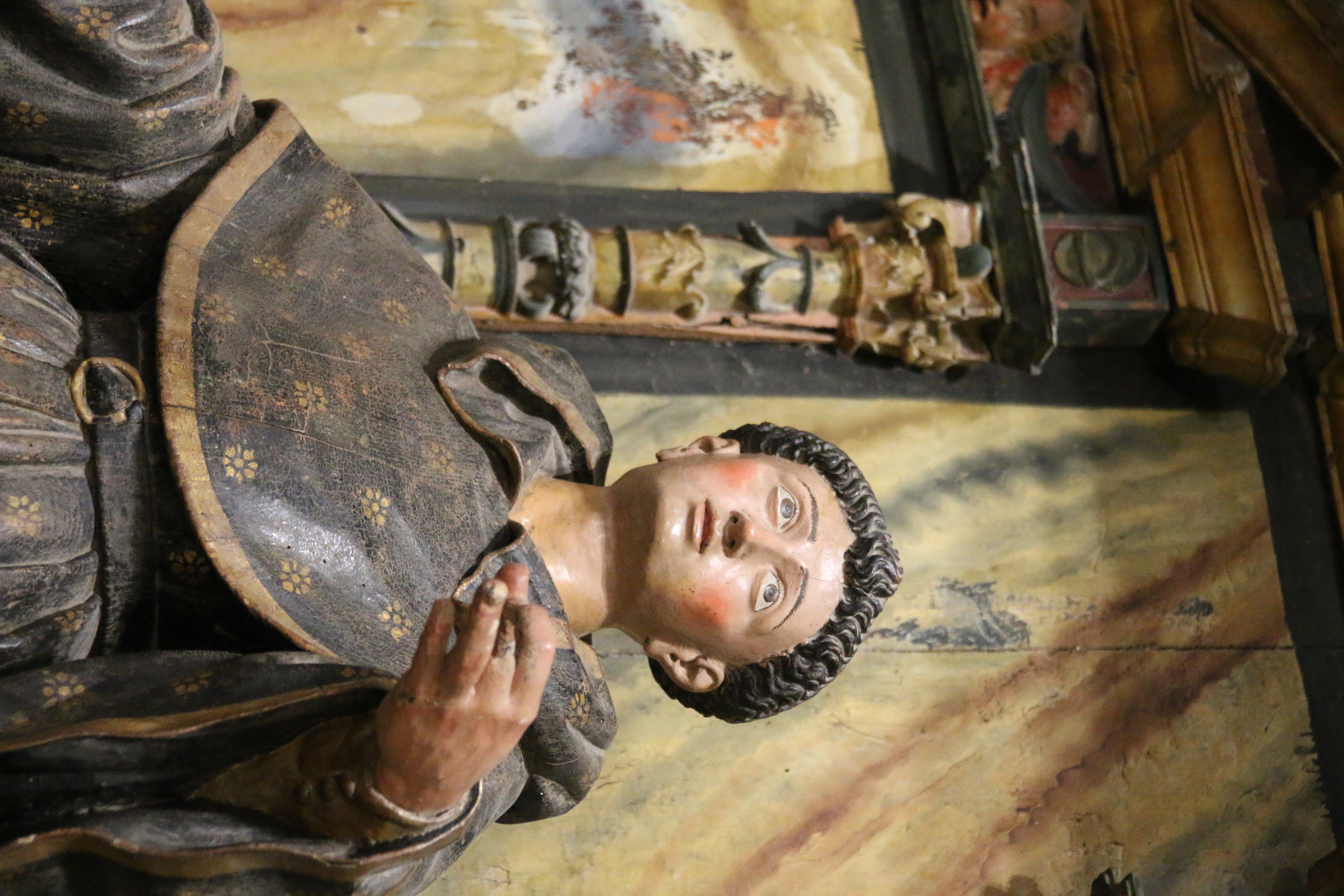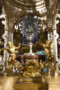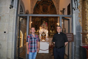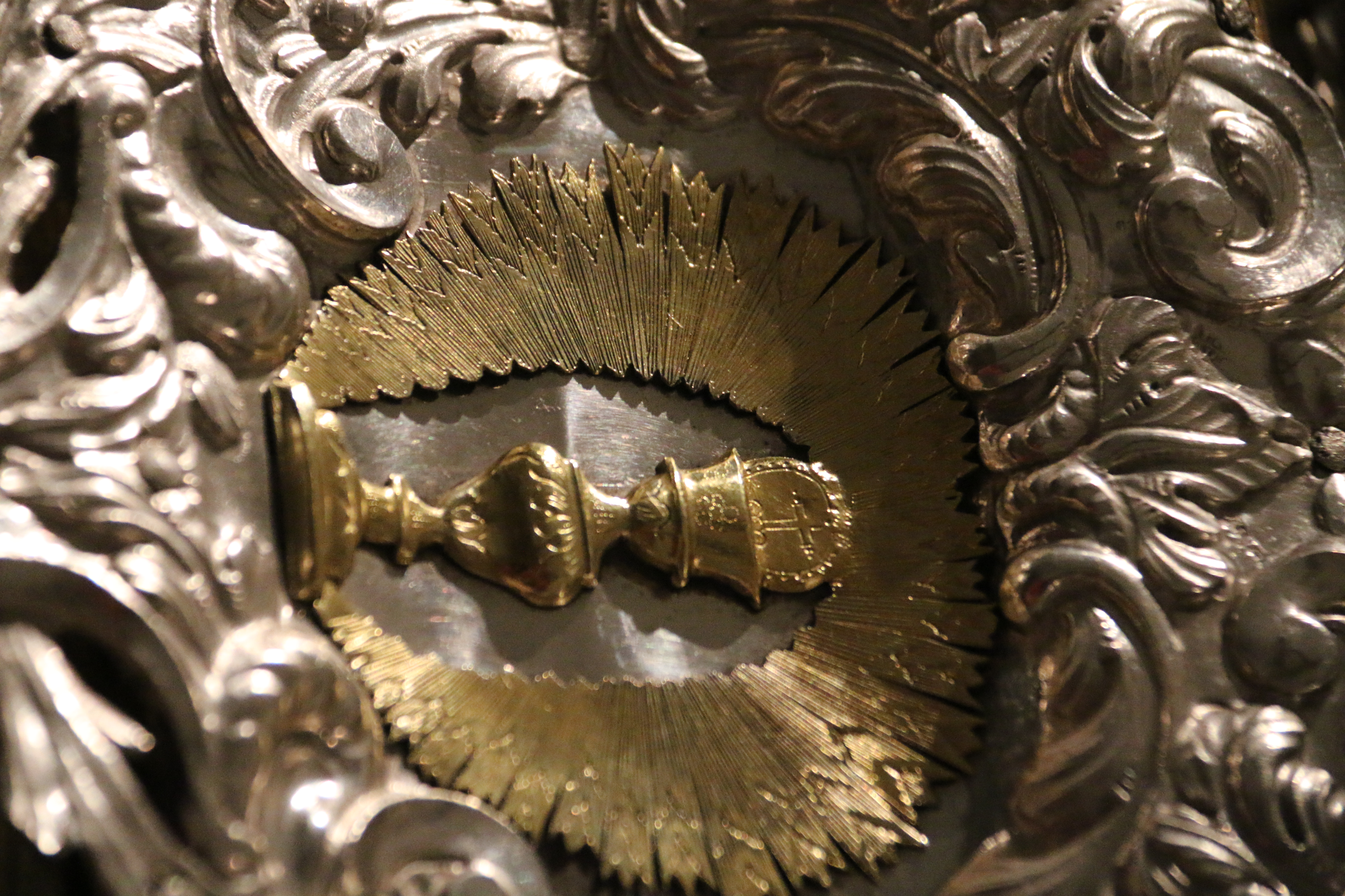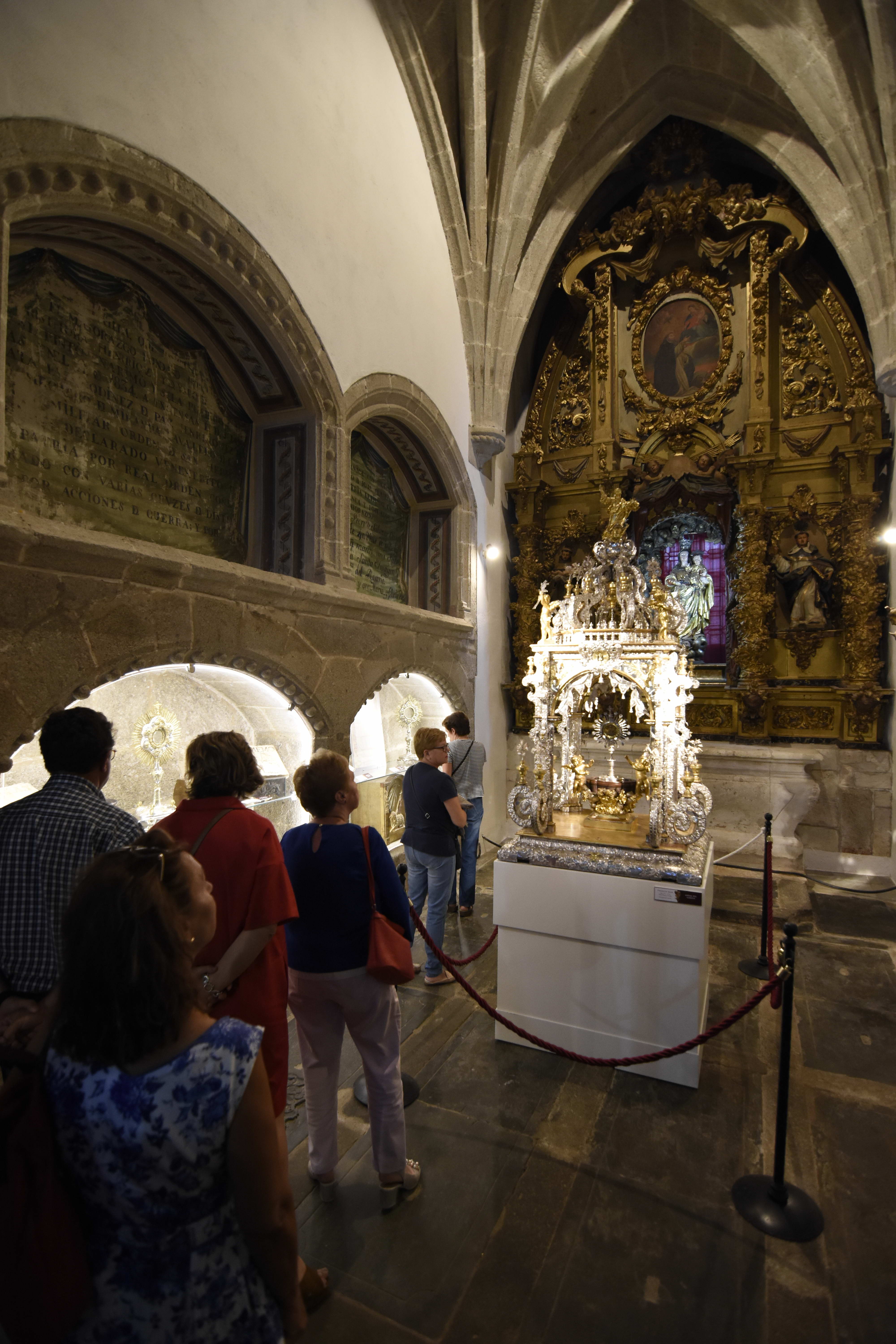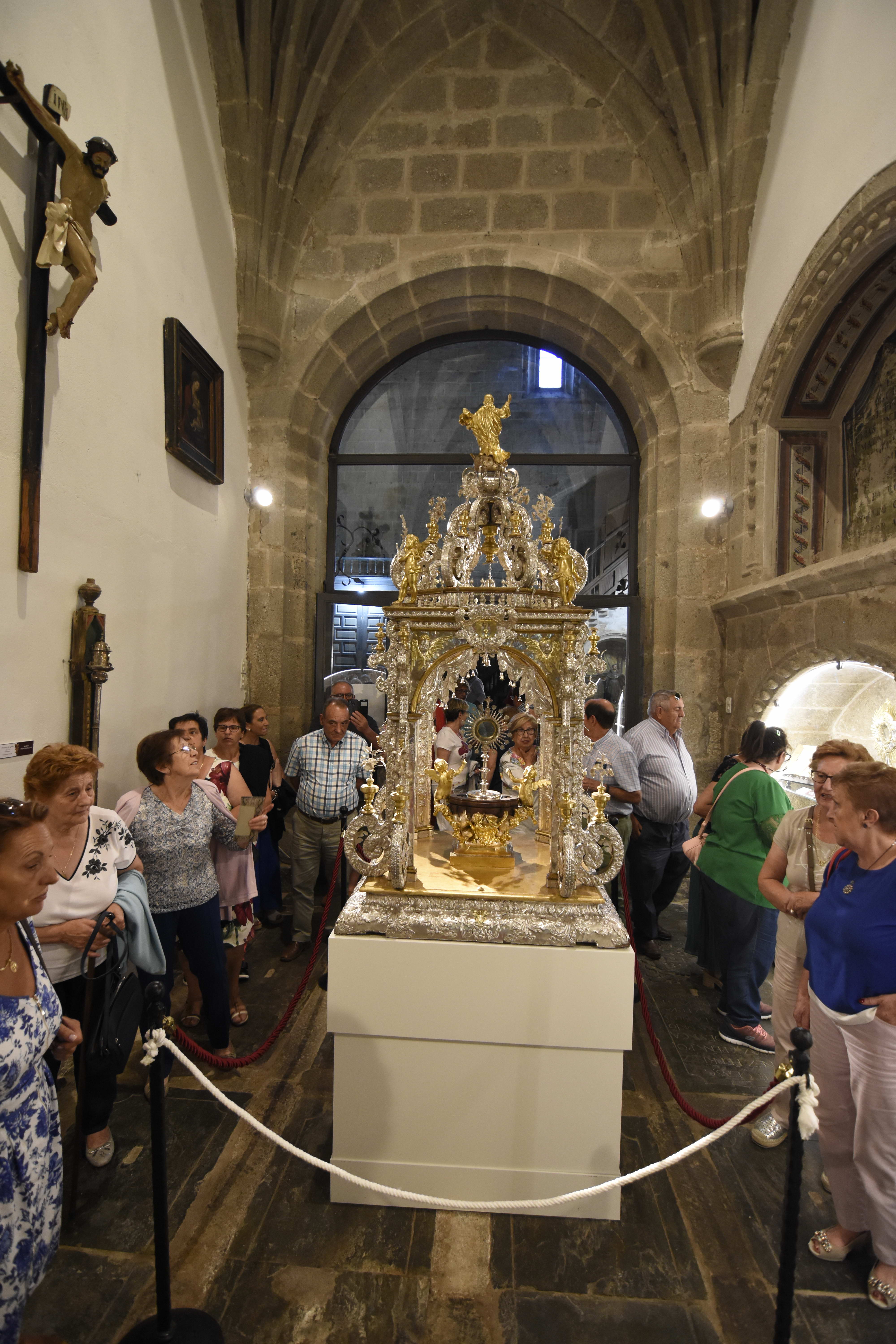 En toda la cartelería de la exposición se aprecia una ménsula de las andas eucarísticas, en concreto, la figura de un ángel. En los dos arcos de esta capilla se ha querido representar cómo se ha vivido la fiesta del Corpus en esta comarca, el primero, dedicado a Ledesma, y donde se encuentran objetivos vinculados a la primera cofradía del Santísimo, encontrado en el pajar de una casa, y donde se comprueba que fue una de las primeras cofradías de toda Salamanca en admitir como hermanas de pleno derecho a las mujeres, “a las que se denominaban cofradas”, explica Velasco. Asimismo, se pueden apreciar dos arquetas eucarísticas que se utilizaban el Jueves y el Viernes Santo para el monumento. La más antigua es del siglo XVI, y otras dos, del XVII. De estas últimas como detalle, se realizaron en México y son de carey de concha de tortuga que fueron donadas por la condesa de Ledesma. El elemento central es una custodia de altar que encargan en 1802 para el interior de la iglesia, para la adoración, “custodia de sol que llaman”, apunta.
