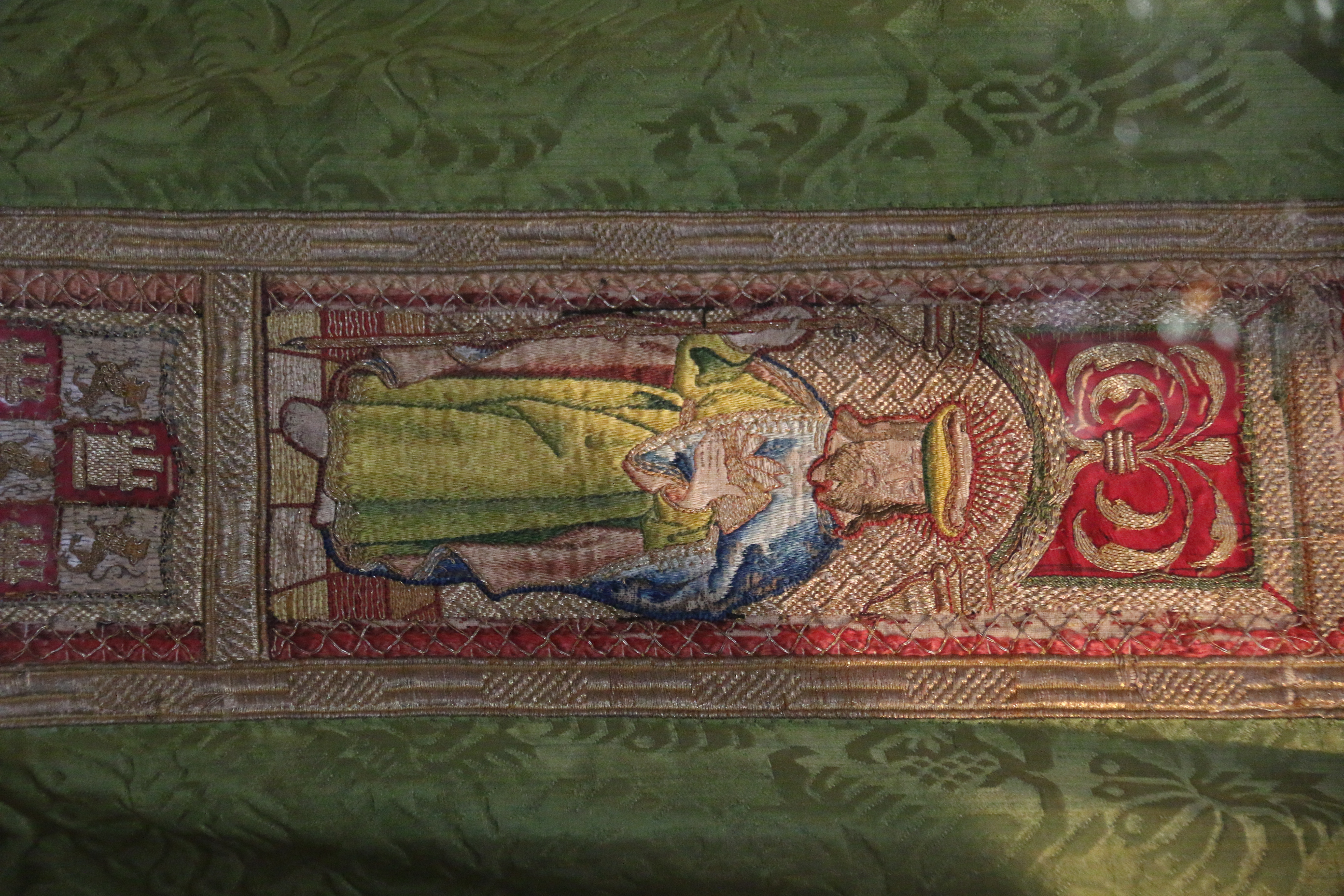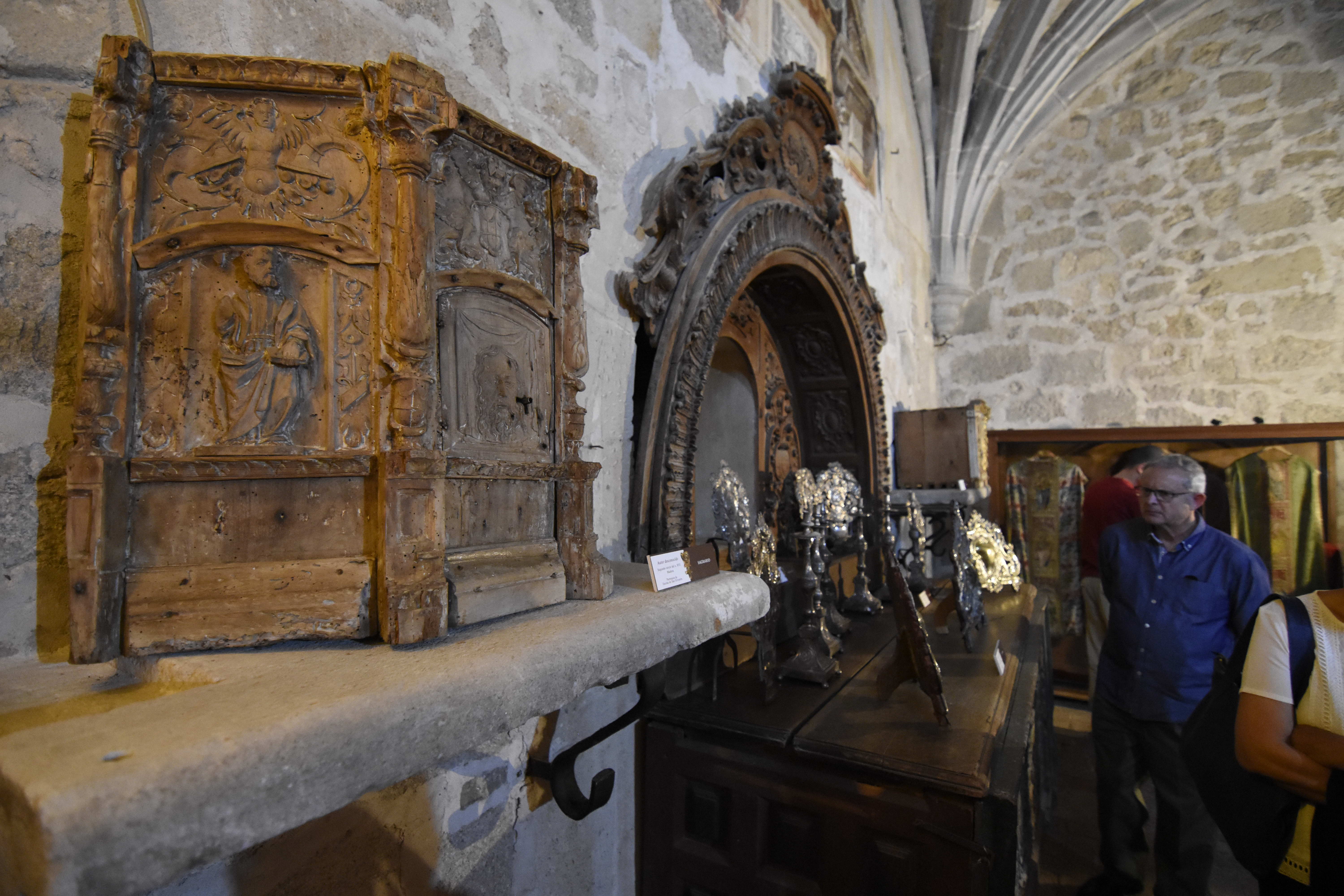 En el siguiente arco se han colocado vinajeras y cálices, entre los que destaca por su valor uno del siglo XVI, o los copones. Para Roberto Velasco, son grandes joyas, así como el cáliz de Aldeadávila, de herencia italiana, del siglo XVII. Asimismo, destacan en la sala dos sagrarios, uno plateresco, del XVI, donde aparece representado en el centro el paño de la Verónica, y en el otro, “se aprecia la dimensión sacrificial, con el mito del pelícano”, aclara Velasco. Debajo de ellos, también se exponen una serie de sacras con las que se adornaban los altares en los días de fiesta. En la última zona de esta sala está ubicada una vitrina con tres casullas, dos de Ledesma y una de Villaseco de los Reyes, de mediados del siglo XVI, donde se representa siempre María en primer lugar.
