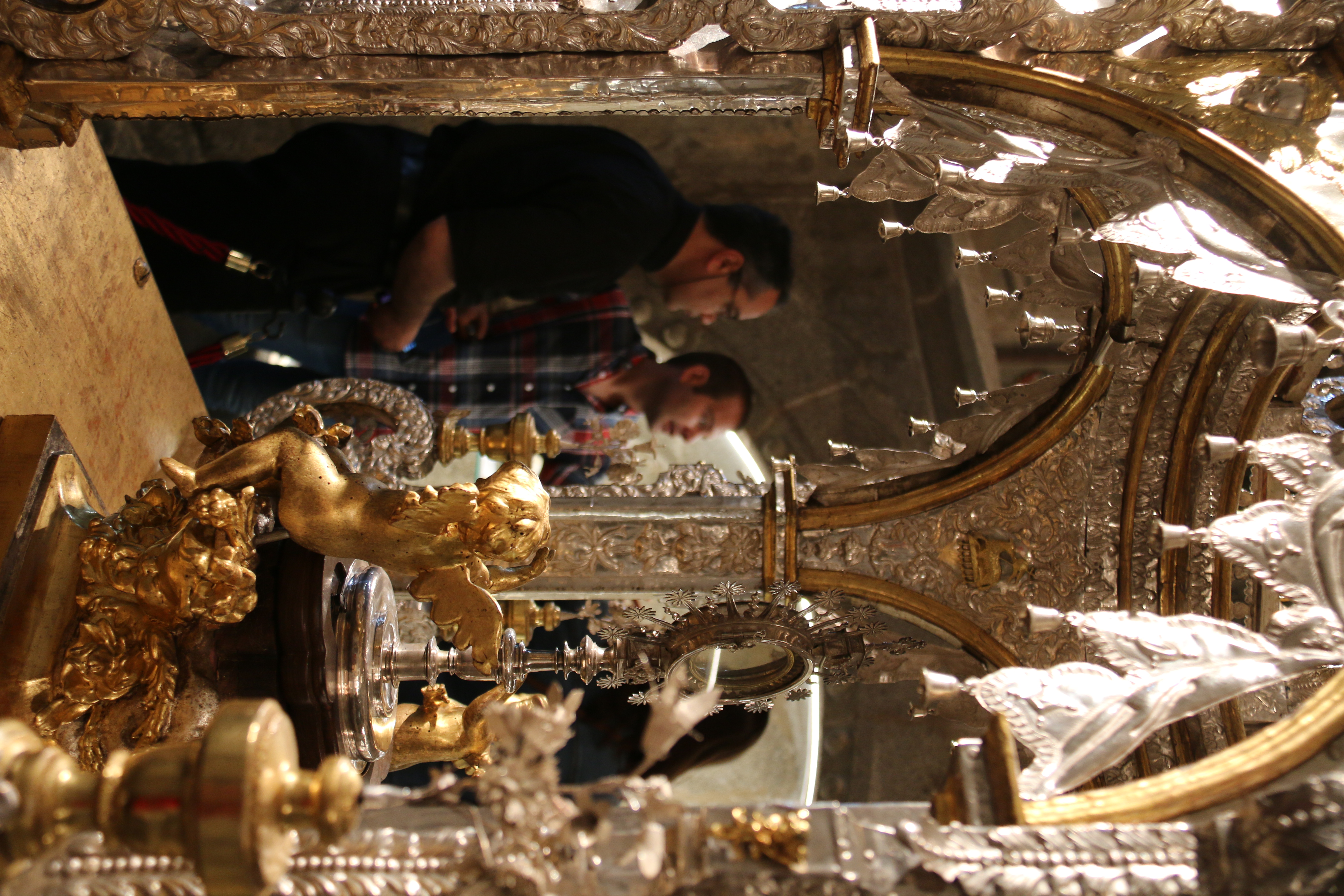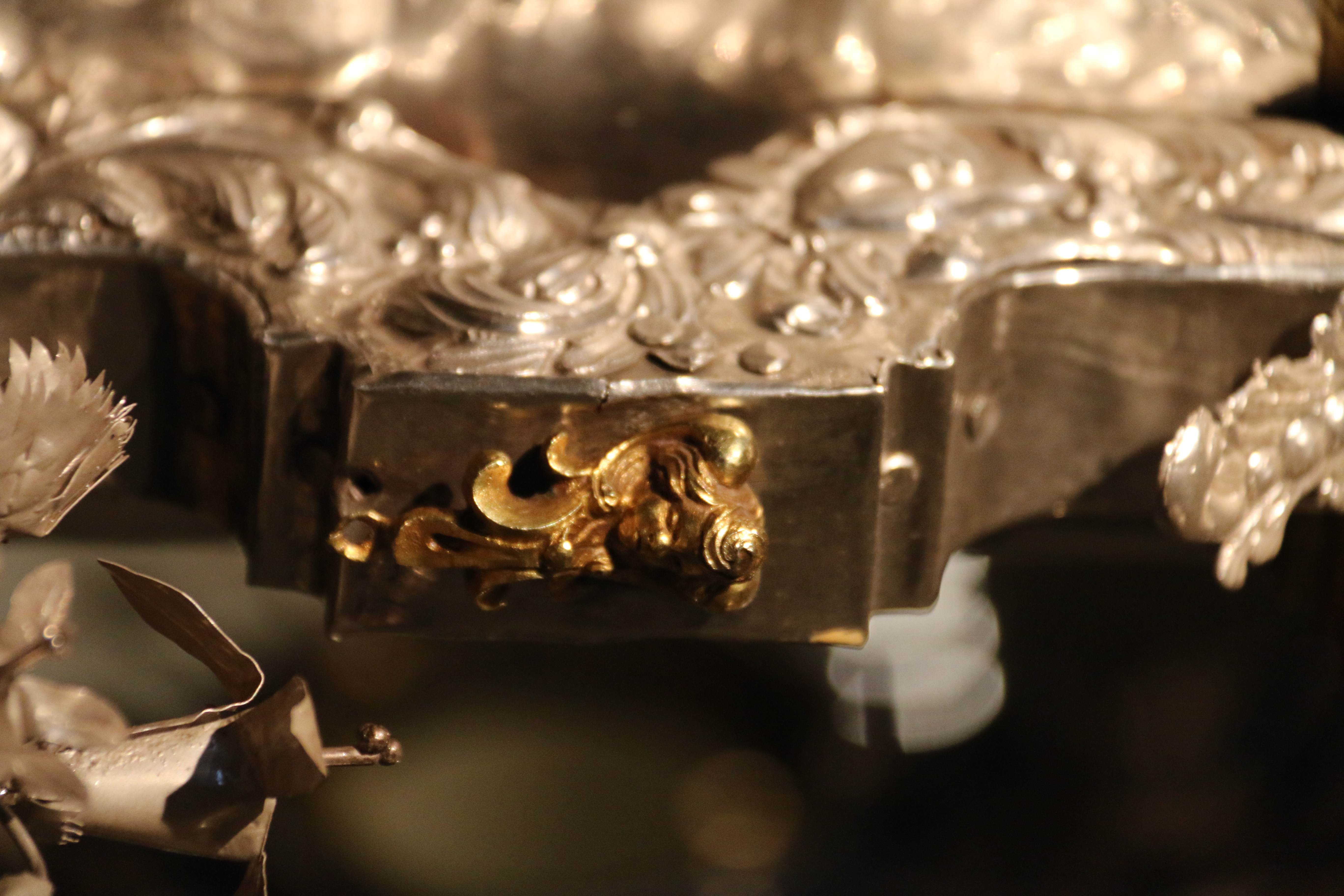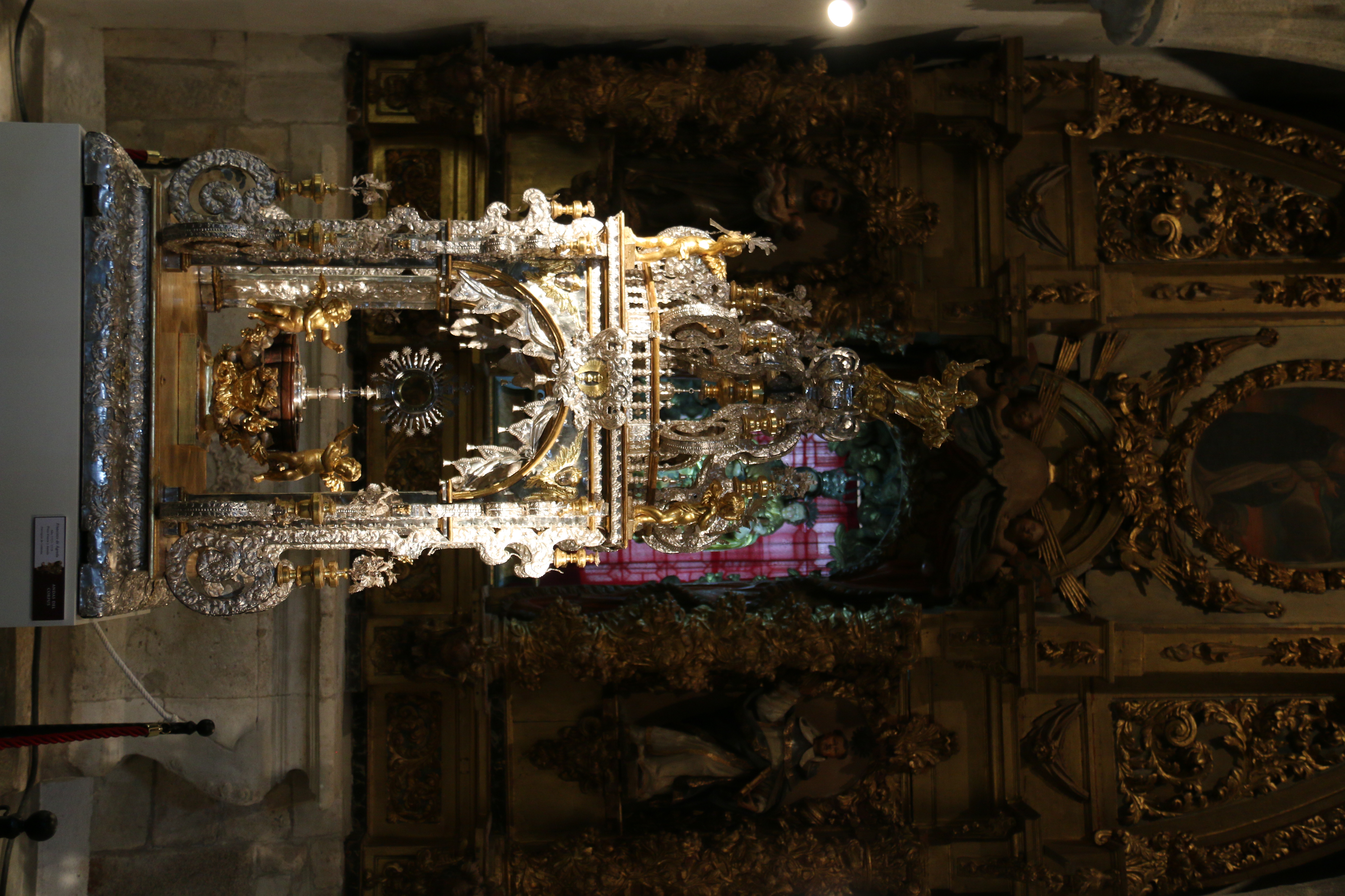 En el capítulo tres, que lleva por título ‘Comunión’, se puede apreciar la pieza que da sentido a la exposición: las andas eucarísticas de Ledesma, obra del orfebre salmantino Francisco de Ágreda, que se inauguraron en las fiestas del Corpus de 1719, es decir, hace 300 años. En el centro de la sala, la capilla del Rosario, se encuentran las andas, recién restauradas en los talleres de Las Edades del Hombre, donde se aprecia mucha simbología, como relata Roberto Velasco, “con elementos de transición del cuadro al círculo, porque según la escuela pitagórica griega, el cuadrado es la tierra, lo humano, y siempre se va ir cerrando en círculo, como elemento divino, y que siempre está bañado en oro”.
