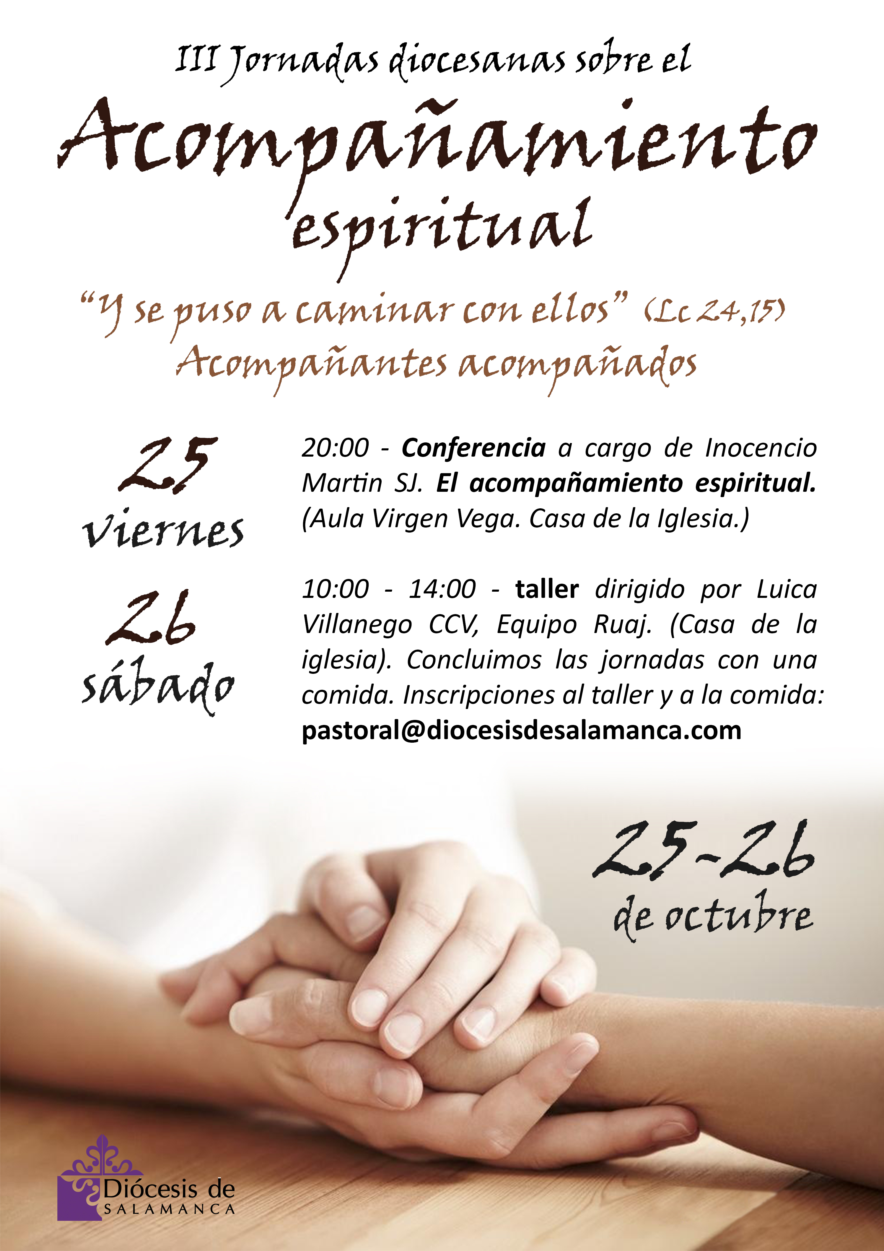 El viernes 25, se celebrará una conferencia a cargo de Inocencio SJ. sobre ‘El acompañamiento espiritual’, a las 20:00 horas en el aula Virgen de la Vega de la Casa de la Iglesia. Un día después, el 26 de octubre, se desarrollará el taller entre las 10:00 y las 14:00 horas, dirigido por Luica Villanego CCV, equipo Ruaj, en la Casa de la Iglesia. Además, las jornadas se concluyen con una comida.