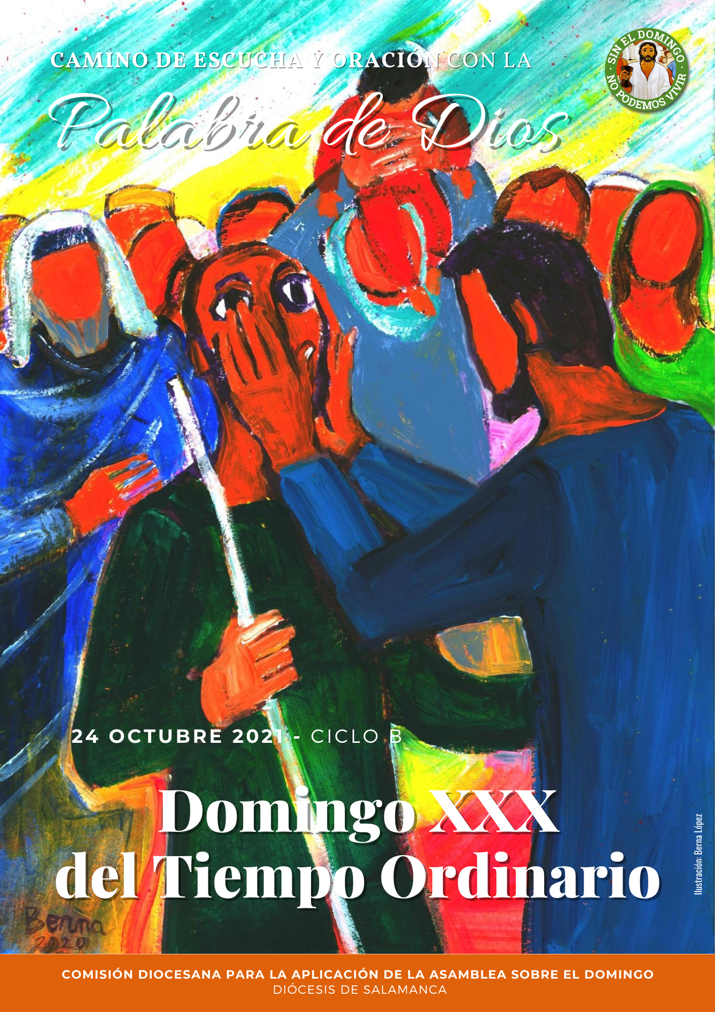 El relato sigue la misma dinámica que los domingos pasados. Jesús camina hacia Jerusalén acompañado por sus discípulos a quienes les va anunciando la entrega a la cruz que le espera al llegar a la ciudad santa. En Jericó, al borde del camino se encuentran al ciego Bartimeo que al enterarse de que Jesús pasa a su lado, le increpa: “¡Hijo de David, Jesús, ten compasión de mí”. El Señor le manda a llamar y “él, de un salto, tira el manto”, se pone delante de Jesús y le pide recobrar la vista. Bartimeo no le pide gloria, como hicieron Santiago y Juan, sino la luz para recorrer su camino. Jesús le dice: “Vete tu fe te ha salvado” y al instante recobra la vista y decide seguirle en el camino hacia la cruz.
