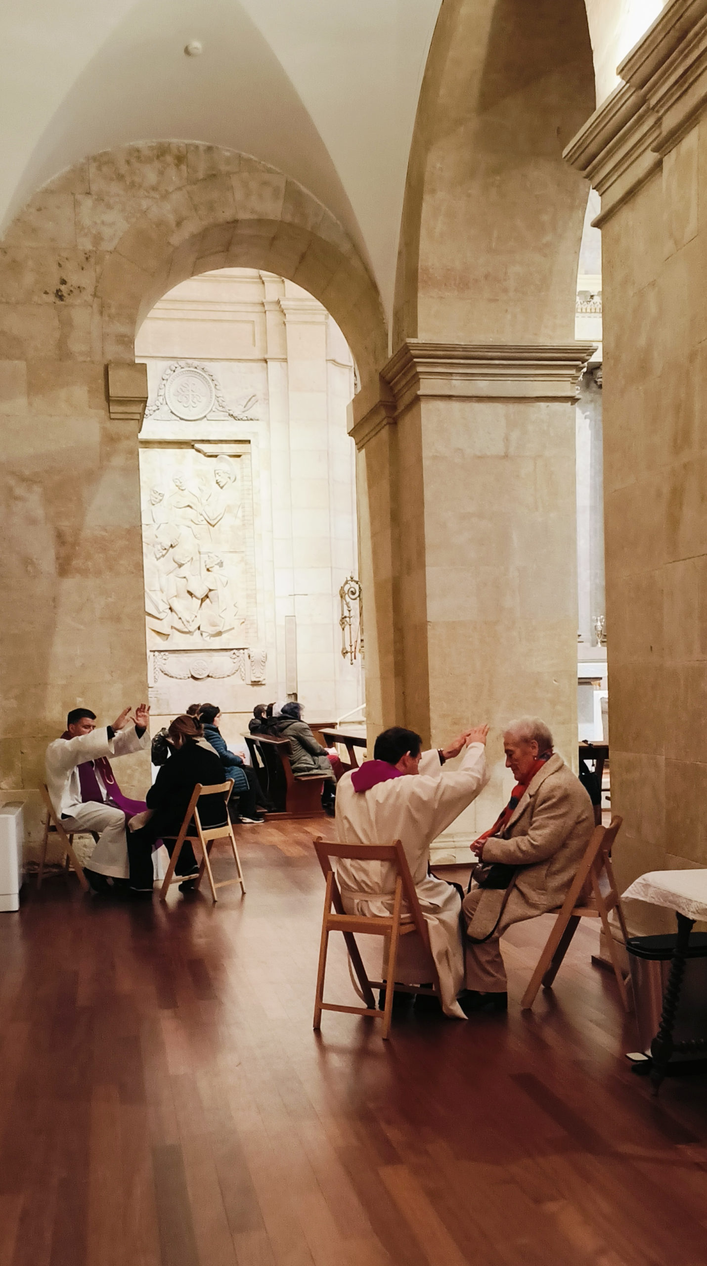 Tras la charla-meditación, los participantes vivieron un tiempo de silencio y adoración al Santísimo, animado con los cantos de las hermanas Carmelitas Samaritanas. Durante este momento de oración, se ofreció la posibilidad de participar en el sacramento de la Reconciliación. La jornada concluyó con una puesta en común y una comida fraterna.