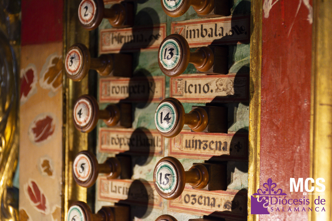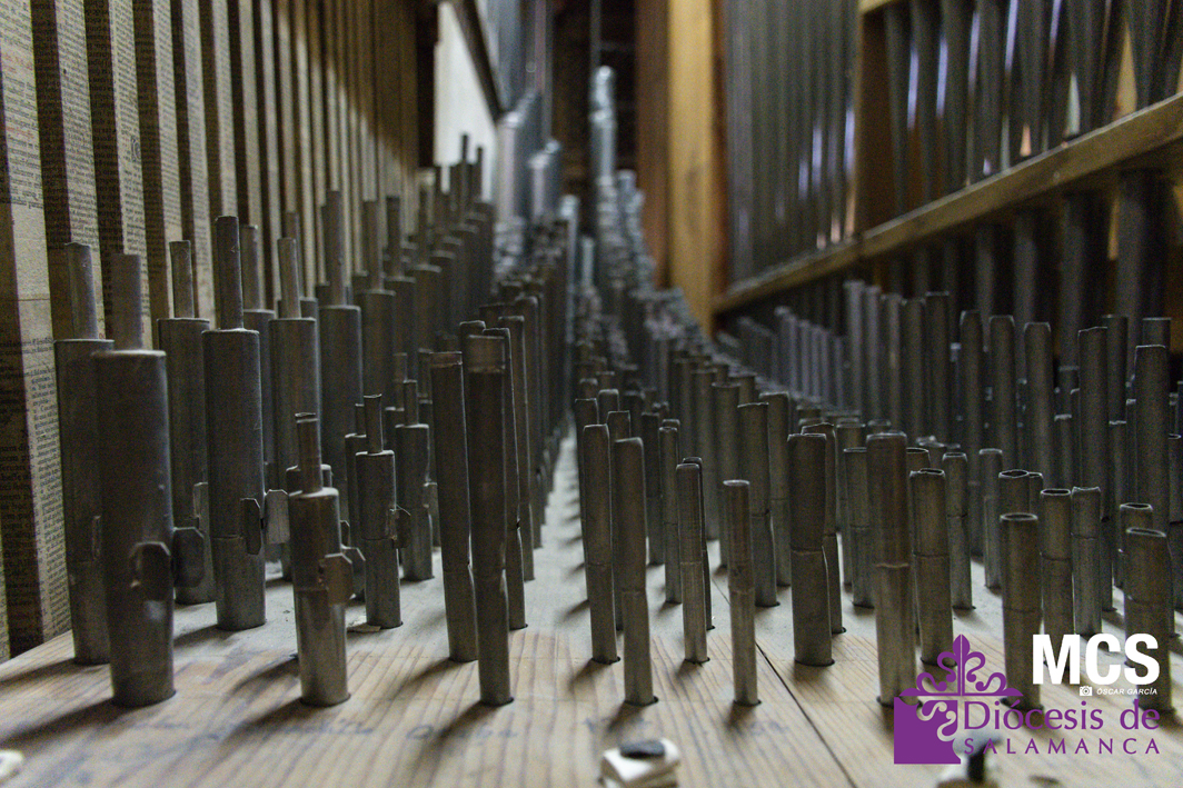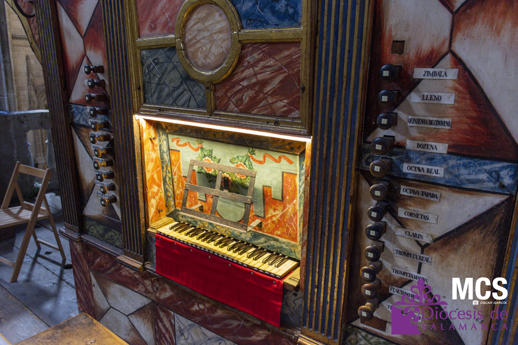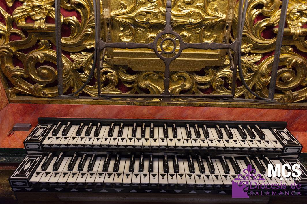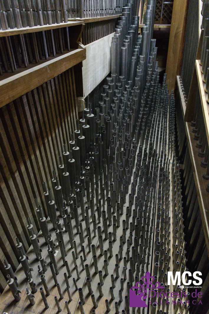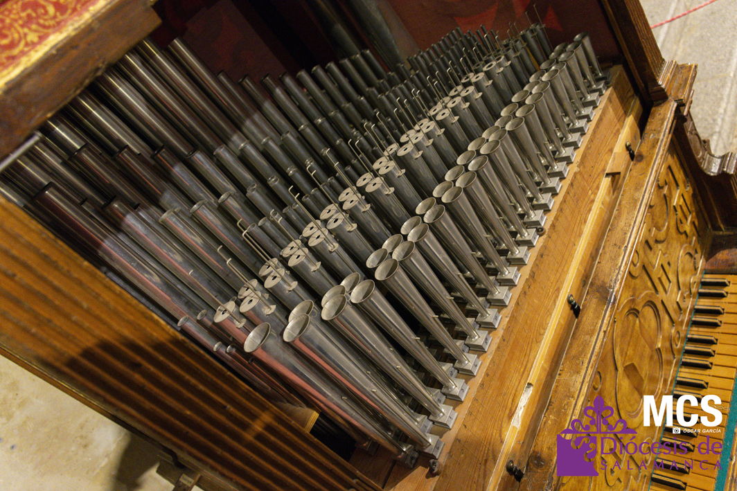 El otro gran órgano, el mayor de todos, es el de Pedro Echevarría, construido entre los años 1742 y 1744, y costeado por el entonces obispo de Salamanca, José Sancho Granados. “Es un órgano que reúne unas características muy especiales, y en su época, era uno de los mayores órganos que había en el Reino de Castilla”, destaca Alberto Moñivas. Además, se incorporó muchos de los adelantos que por entonces eran novedosos para la época, “como dos teclados y una cantidad numerosa de registros, casi todas las familias de las lengüetas o labiales flautados que están representados en este instrumento”. En total, tiene 2.365 tubos.