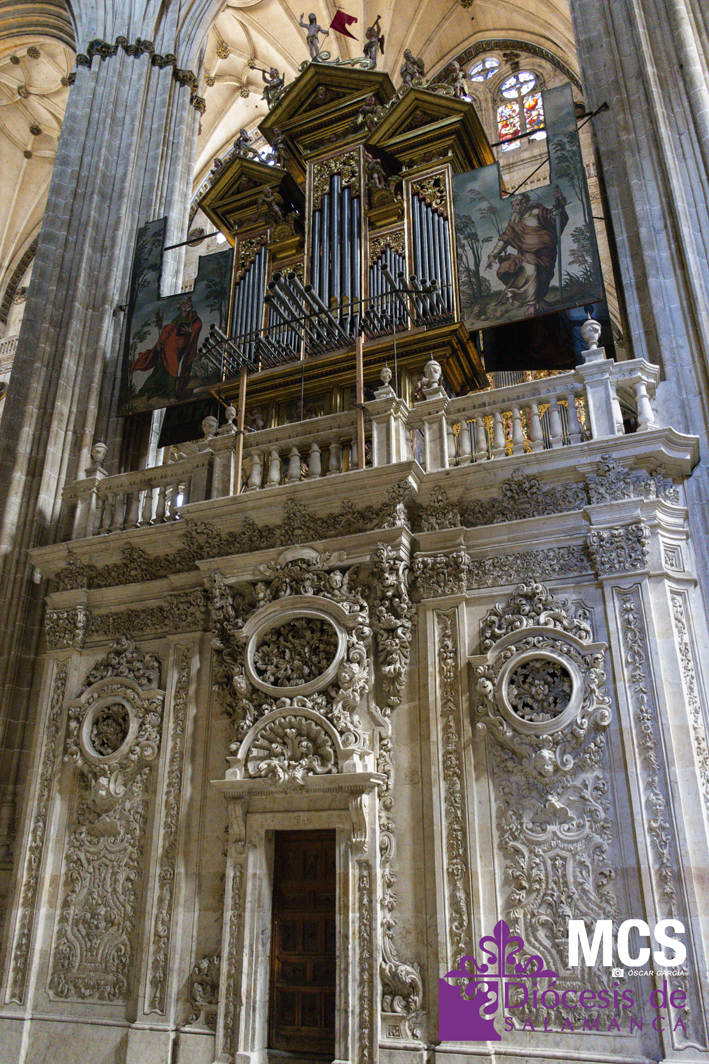 En el coro de la Catedral Nueva se encuentran dos órganos más, los de mayor tamaño, enfrentados uno al otro. “Ambos son de la época barroca, aunque el más antiguo en origen era renacentista, construido a finales del siglo XVI“, relata. En concreto, este instrumento se construyó para el coro que existía en la Catedral Vieja, en la nave central, “pero después se traslada a la Nueva cuando se termina de construir el coro de los hermanos Churriguera”. Destacar que se reforma el interior del órgano, “de forma que el material sonoro y la estética del instrumento es barroca”, apela esté músico.