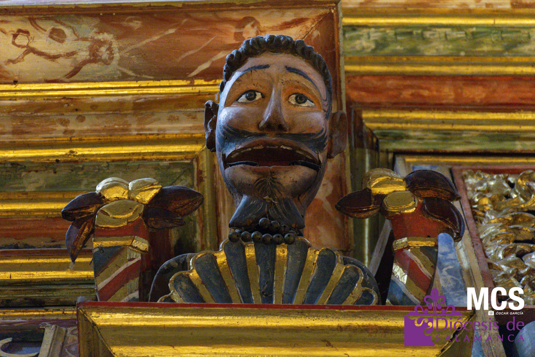 Alberto Moñivas destaca la estética de la caja del órgano de Echevarría, “de etilo barroco exuberante, donde se representa elementos de la liturgia celeste, como los ángeles músicos, lo que simboliza la unión de nuestra liturgia y la música, con la que disfrutaremos en el paraíso eterno”. Y a ambos lados del instrumento se observa el escudo del obispo Sancho Granados, “que fue el donante del órgano”. A modo de anécdota, en los tubos más grandes, que dan las notas graves, “en la parte del labio han aprovechado para simular una boca y dibujar una máscara que representa la forma en la que estaría cantando ese personaje”.