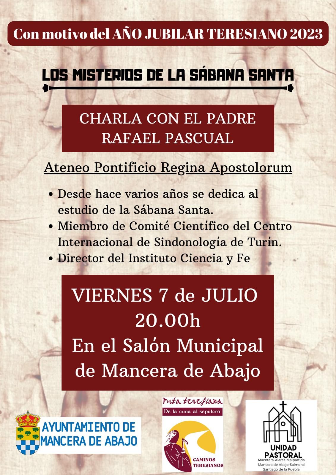 El salón municipal de Mancera de Abajo acogerá este viernes, 7 de julio, a las 20:00 horas, la conferencia: “Los misterios de la Sábana Santa”, que va a impartir el sacerdote y miembro del Comité Científico del Centro Internacional de Sindonología de Turín, el P. Rafael Pascual, L.C.