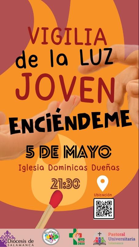 “Enciéndeme”, es el lema de la Vigilia de la Luz Joven que se va a celebrar el próximo viernes, 5 de mayo, en la iglesia del Monasterio de las Dominicas de Salamanca, en la Plaza del Concilio de Trento, convocada por las Delegaciones diocesanas de Pastoral Juvenil y Universitaria. Una ocasión para “celebrar con jóvenes y entre jóvenes la renovación de vida que trae la Resurrección de Jesús”, como señala el responsable de Pastoral Universitaria, Ricardo de Luis Carballada.