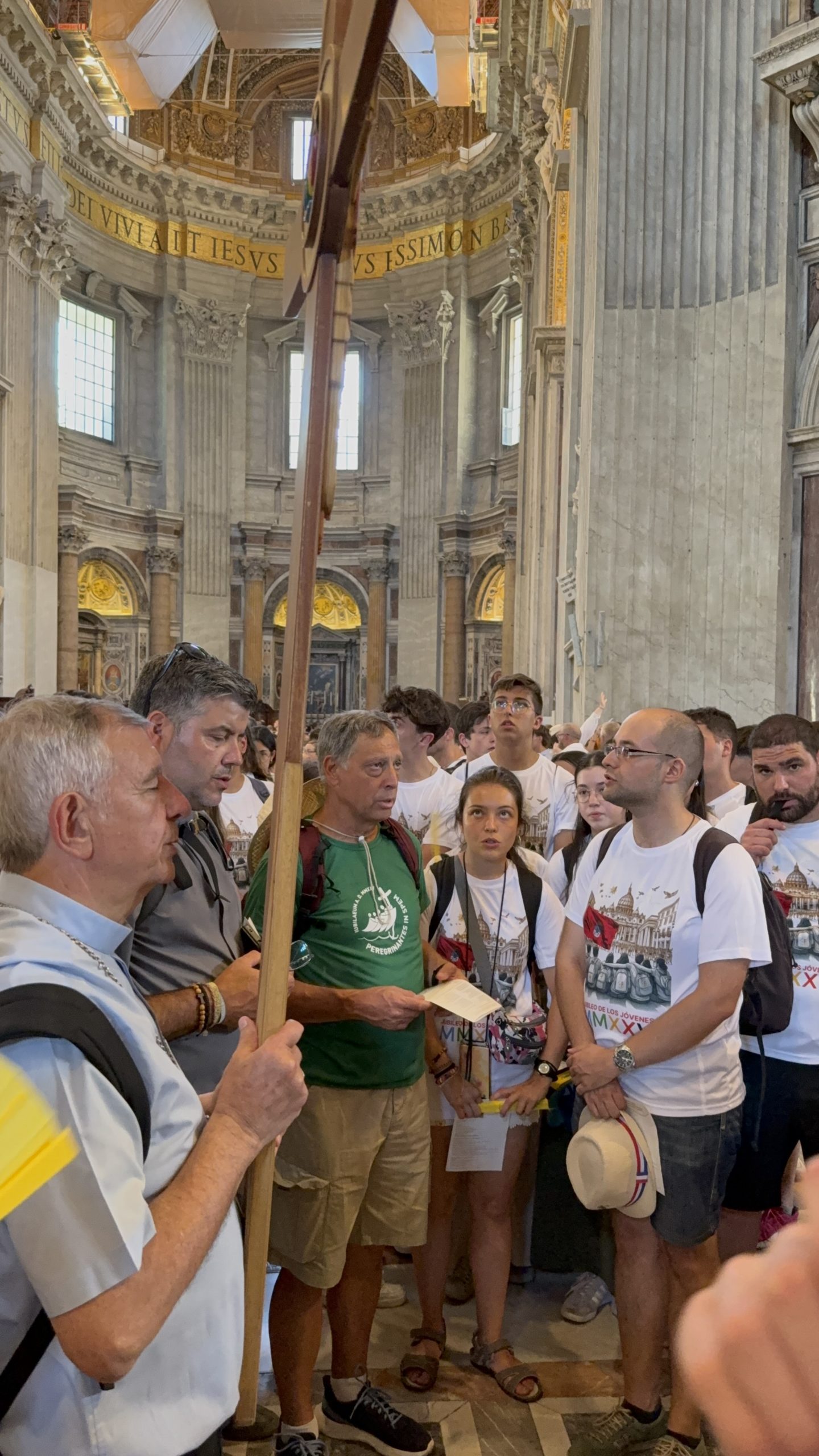 La peregrinación avanzó entre cantos, momentos de silencio y la oración. Al llegar a la Puerta Santa, el grupo rezó el Salmo 23 y atravesó el umbral con recogimiento, conscientes de que no se trataba de una puerta cualquiera, sino de la entrada a una experiencia única de fe que solo se vive cada 25 años. Ya en el interior de la basílica, rezaron el Credo ante la tumba del apóstol Pedro, renovando su fe en el corazón de la Iglesia y como signo de comunión con ella.