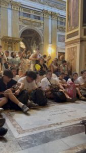 Ya por la tarde, en la iglesia del Gesù y coincidiendo con la festividad de San Ignacio de Loyola, el sacerdote diocesano, Nacho Gómez, había guiado una oración titulada “Tú has afianzado mis pasos”. A través de textos del profeta Isaías y de la Primera Carta de Pedro, los jóvenes fueron invitados a acoger la gracia de Dios que fortalece y sostiene: “el Dios de toda gracia […] los hará fuertes e inconmovibles”. Fue un momento de silencio, gratitud y súplica desde el anhelo de verdad y que preparó interiormente a los jóvenes para lo que vendría después: el paso por la Puerta Santa.