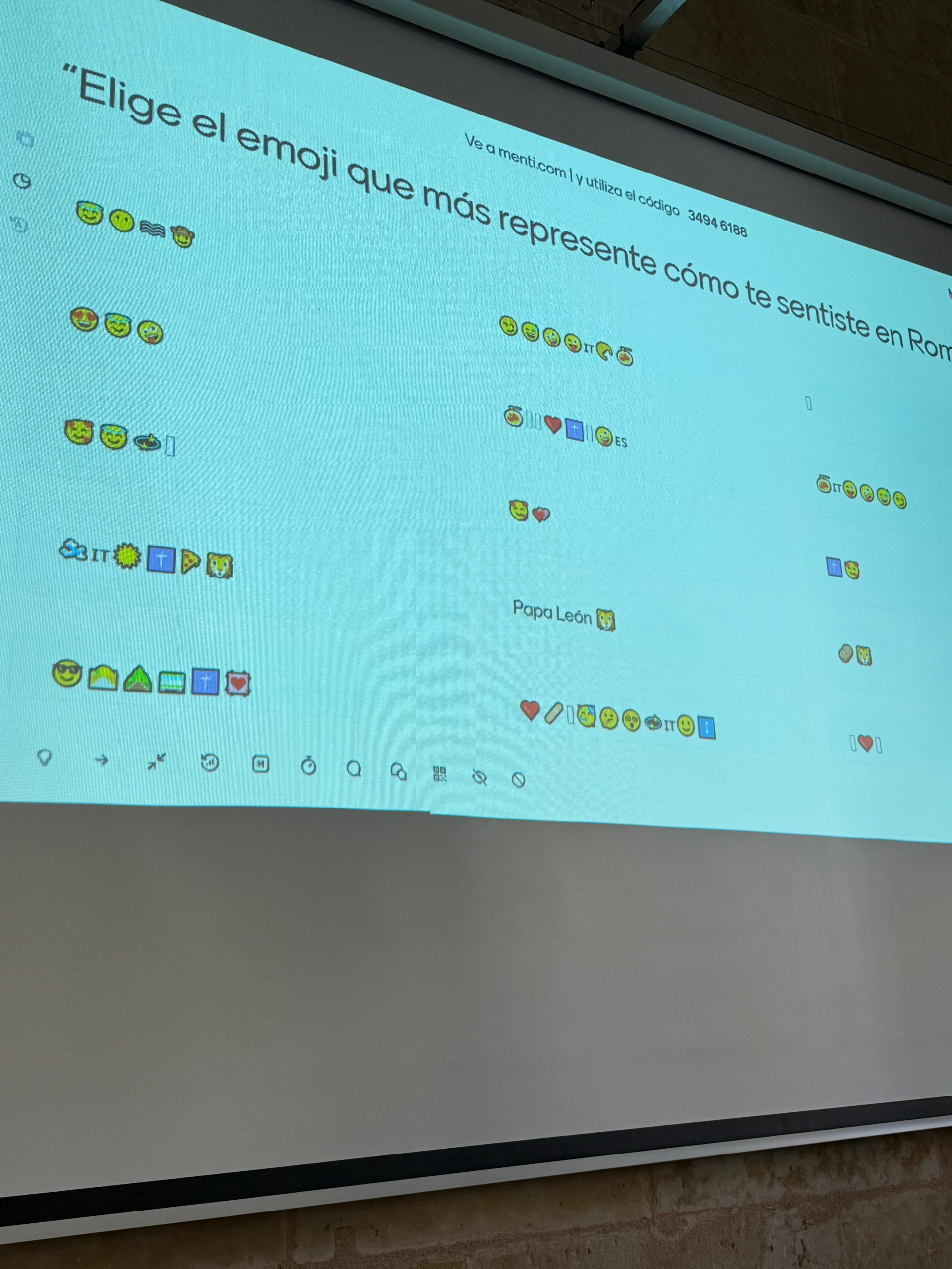 Después del momento de oración, los jóvenes participaron en una dinámica interactiva en la que pudieron expresar lo que el Jubileo supuso para ellos. La palabra más repetida fue “esperanza”, seguida de “encuentro”, mientras que los emojis más elegidos reflejaron alegría, fraternidad y fe compartida. Entre los momentos más especiales, la mayoría destacó el Encuentro de Españoles en la pllaza de San Pedro, la vigilia en Tor Vergata y la entrada en la Basílica de San Pedro.