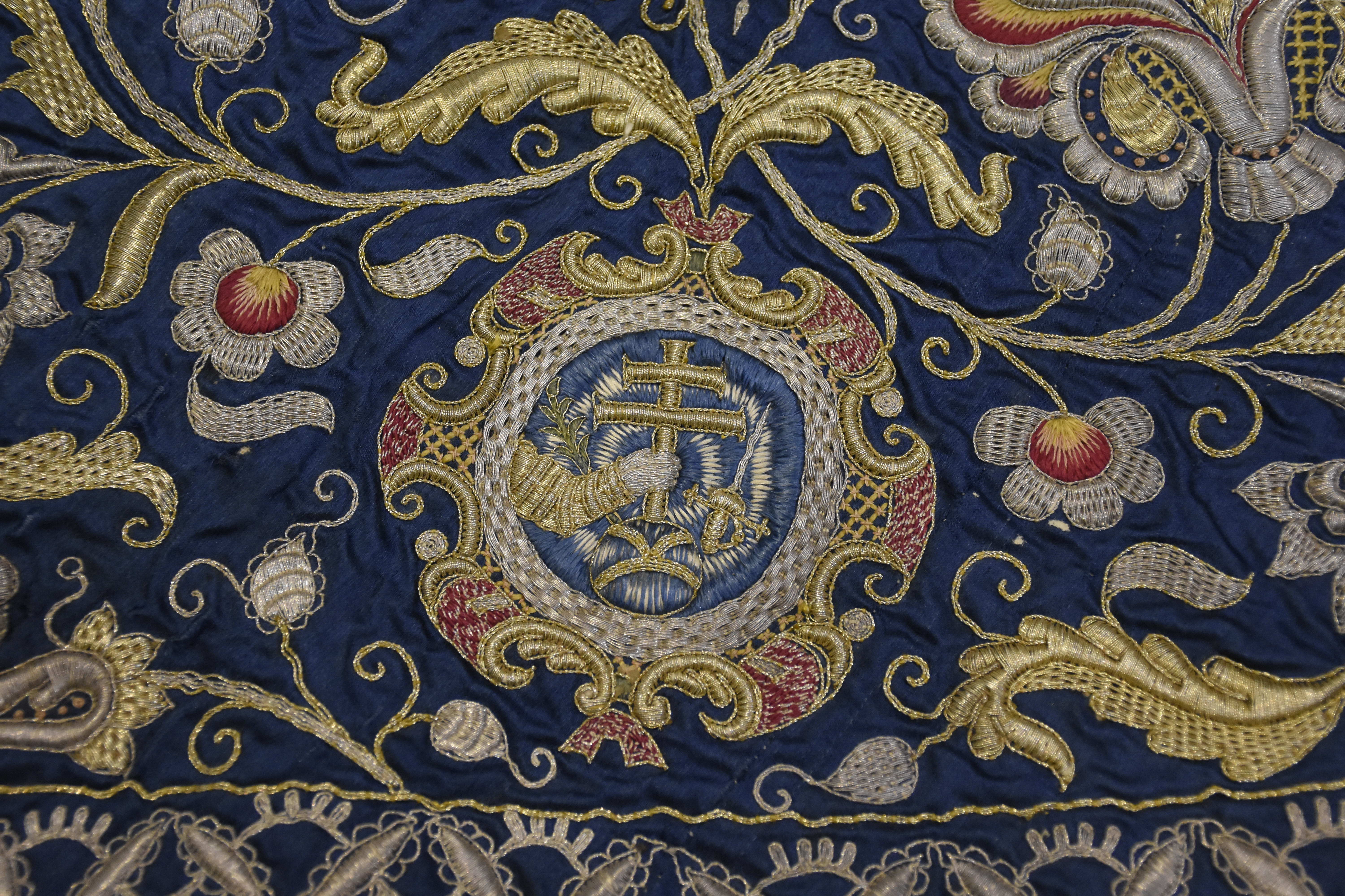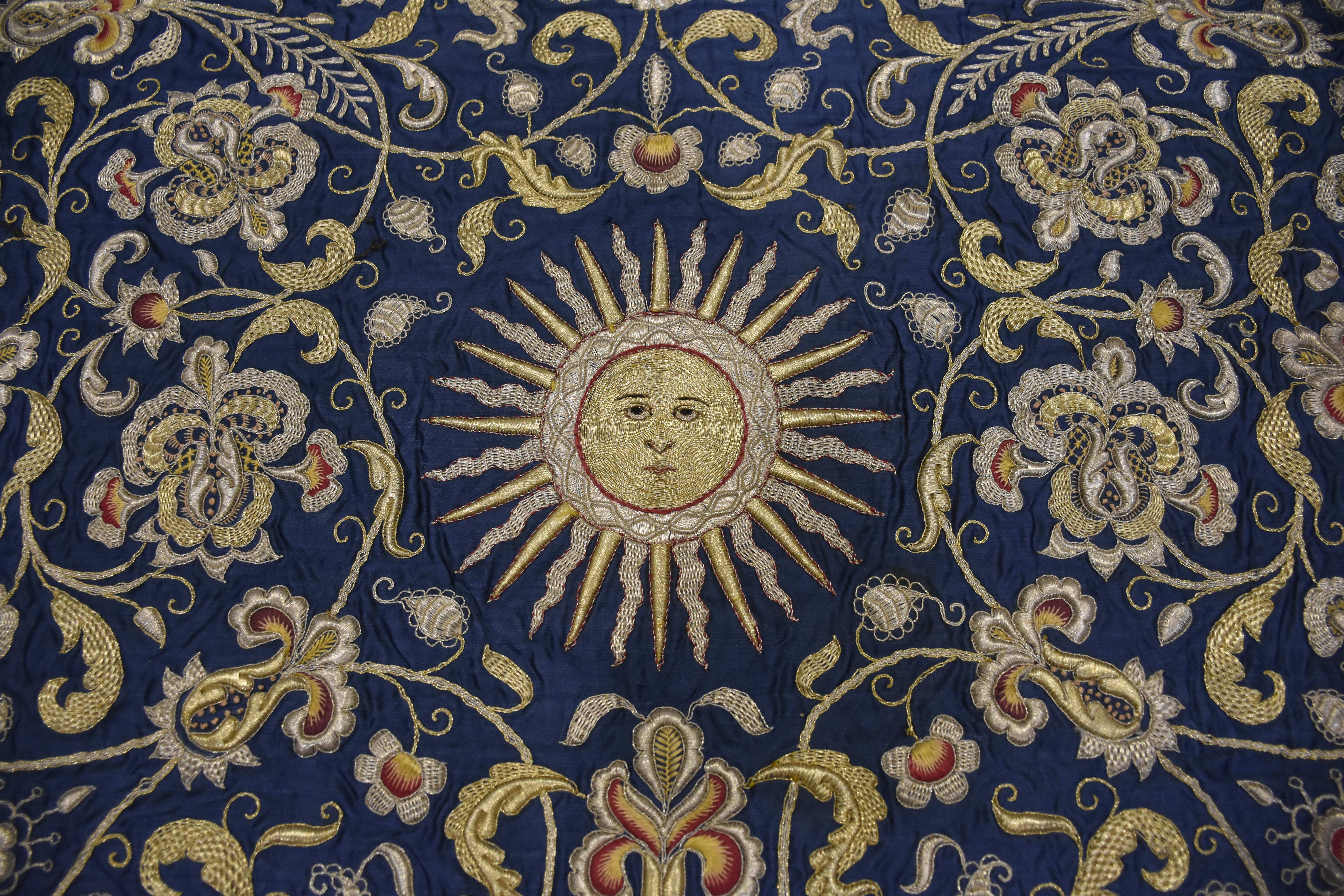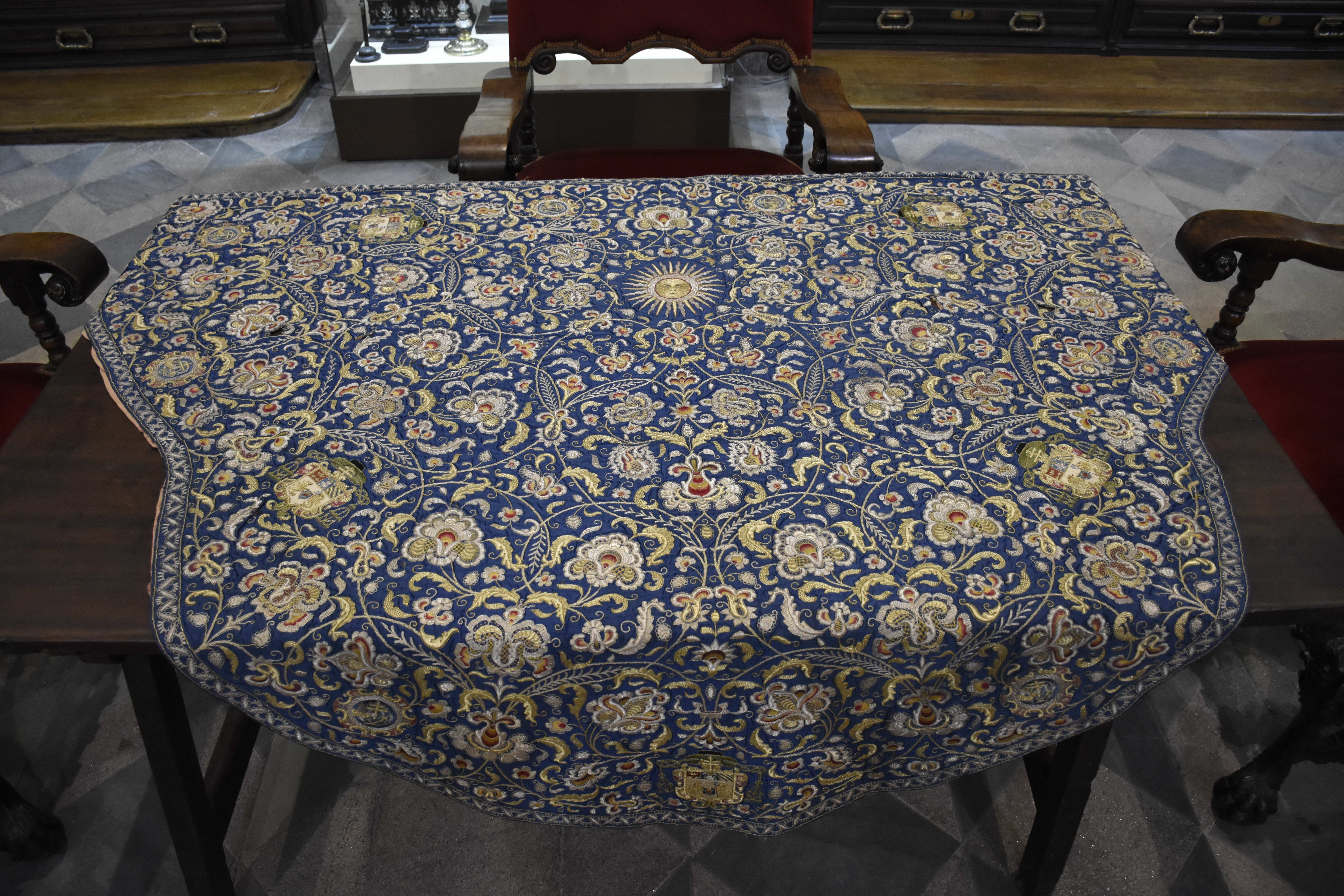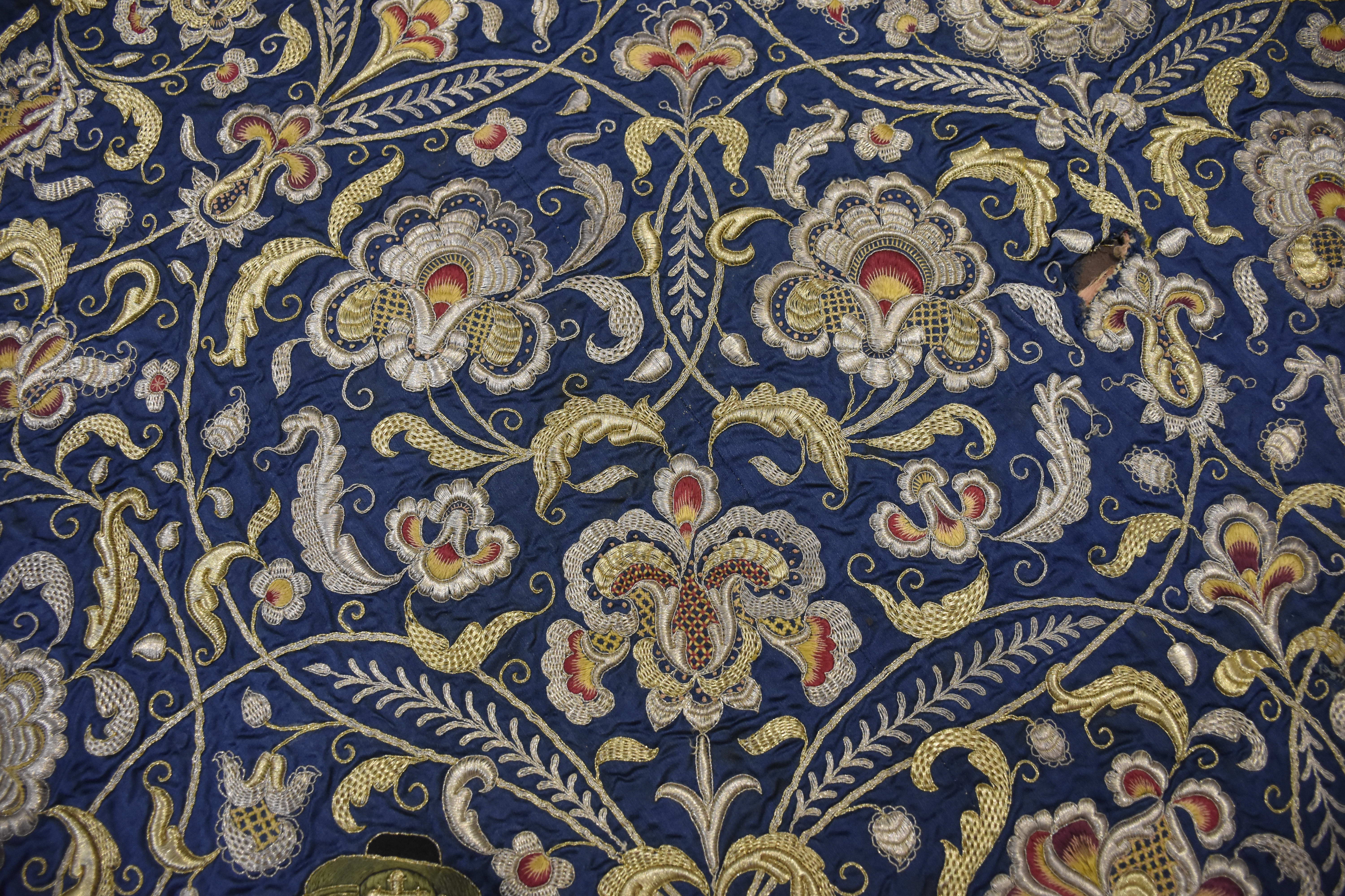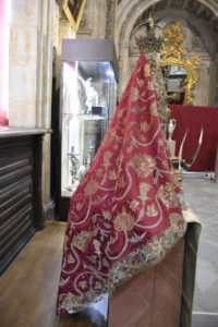 Uno de los mantos de mayor riqueza de la patrona de la ciudad es de seda azul, “bordado con hilo de plata y oro, con algunos colores en seda”, describe. Raúl Benito aclara que es un manto “riquísimo”, y en el centro aparece un sol, “que quedaría a la altura de los hombros de la Virgen”, y que también cuenta con un escudo episcopal, “que tiene la cruz patriarcal con doble travesaño, que representa el letrero donde Poncio Pilato mandó escribir: “Este es el Rey de los judíos”.