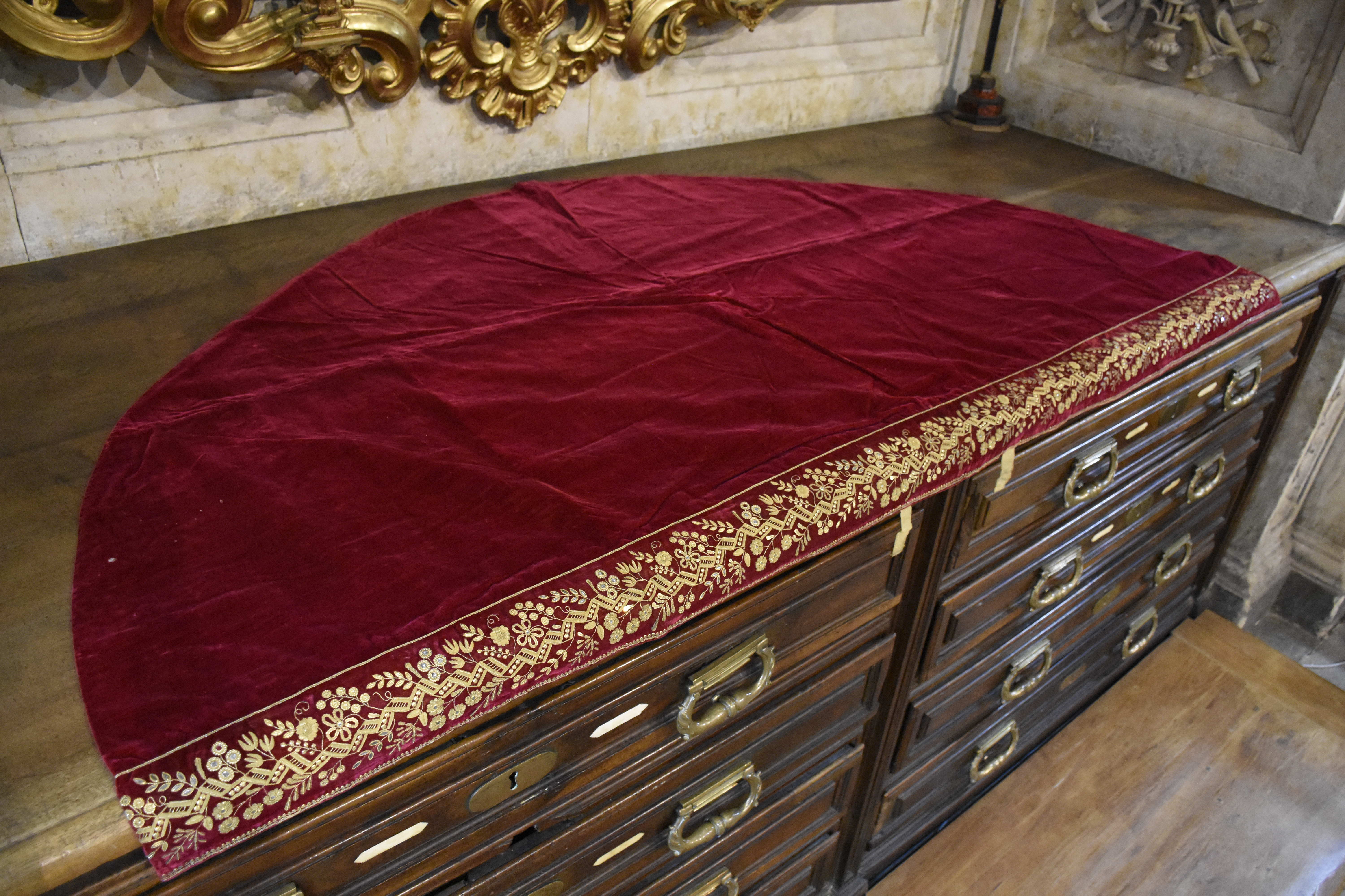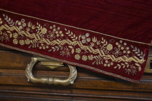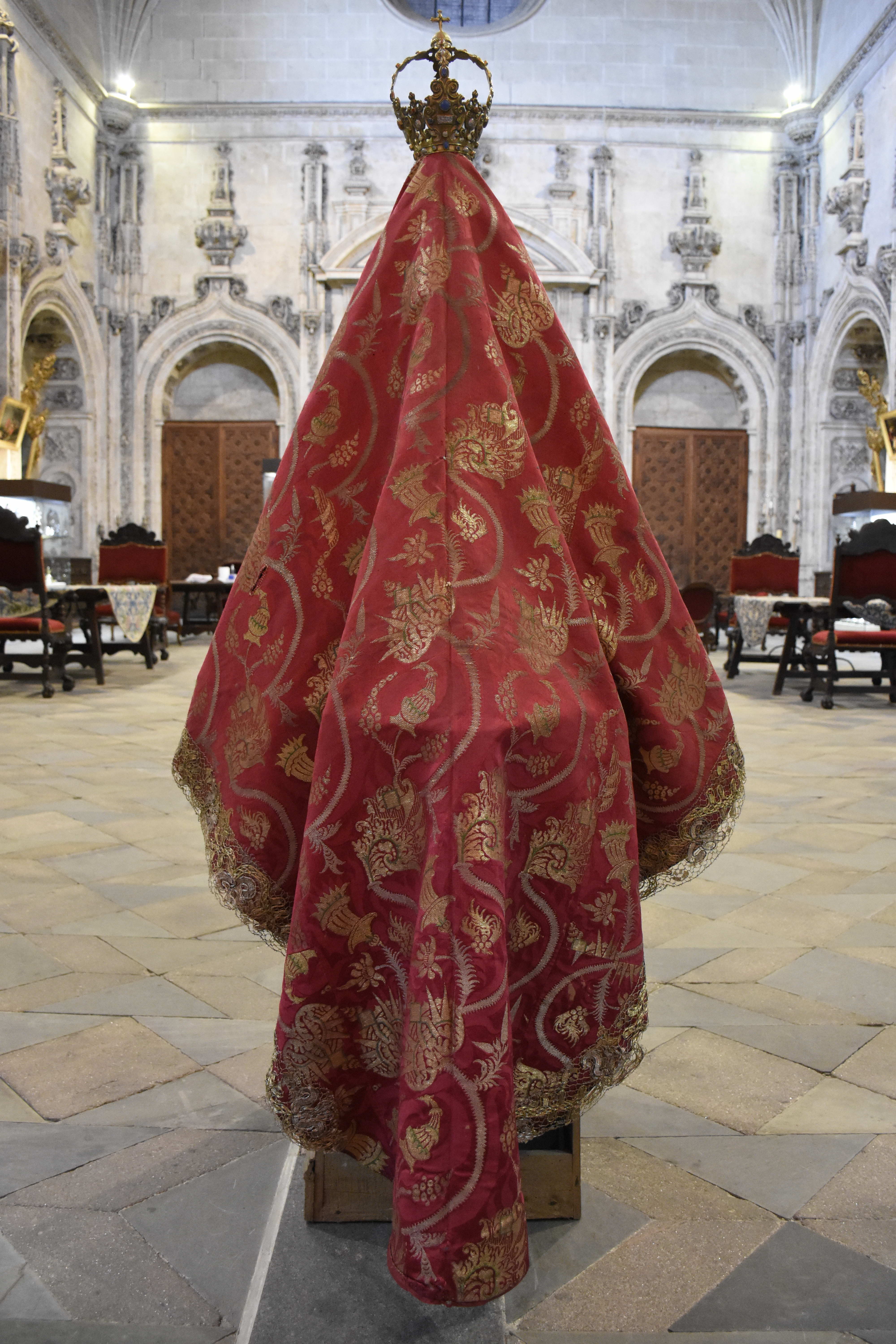 La imagen original de la Virgen de la Vega tiene una colección original de nueve mantos, confeccionados entre los siglos XVIII y principios del XIX. Entro ellos destaca uno de color rojo, “porque el resto tiene tonos azules”, en este caso, de seda espolinada y con una aplicación de remate de hilo de oro, según relata Benito, “para enriquecer toda la orla del manto”. Entre su ajuar textil también cuenta con tocas de sobremanto de encaje, “e incluso ropa para vestir tanto a la Virgen como al Niño”.
