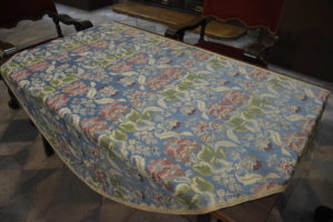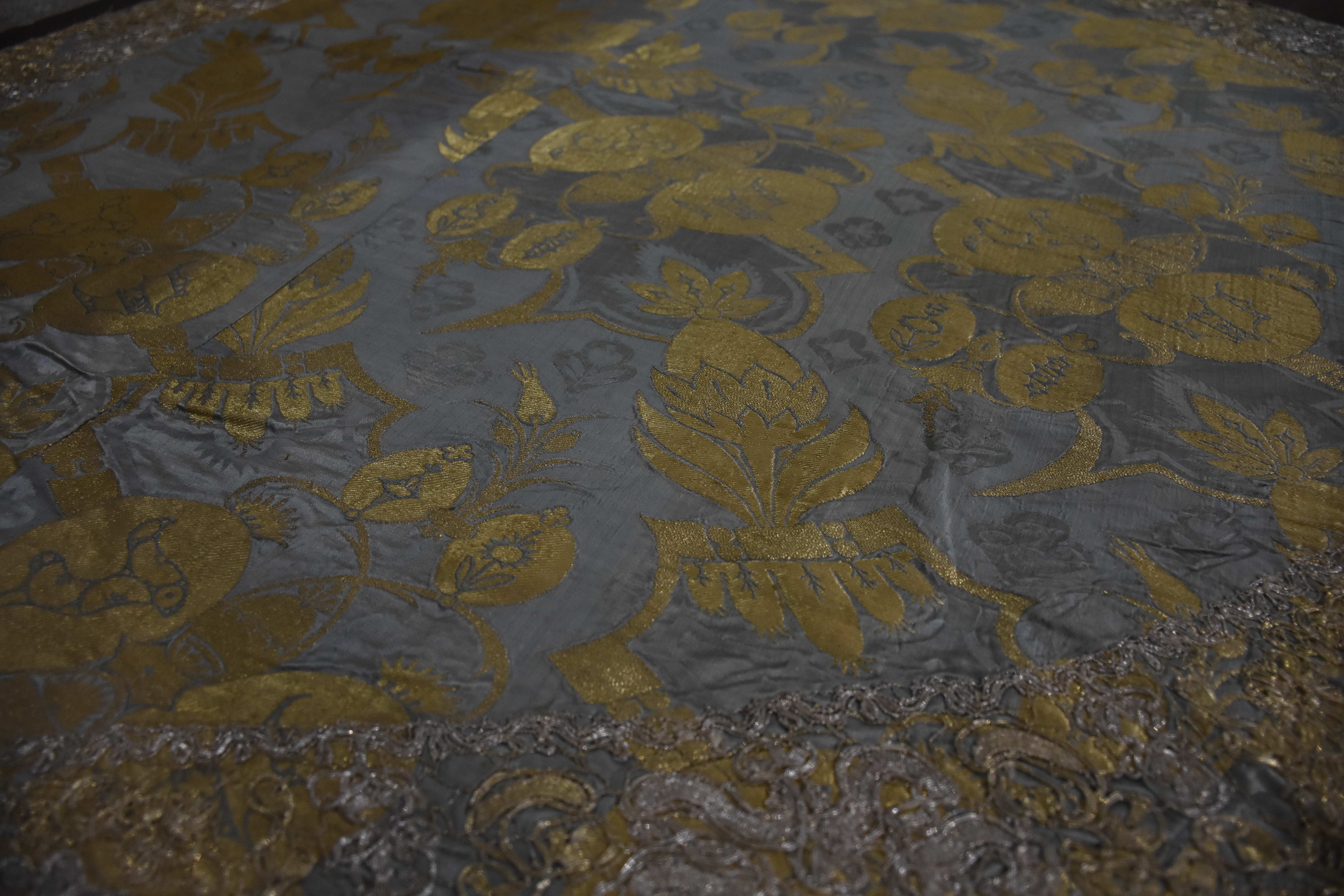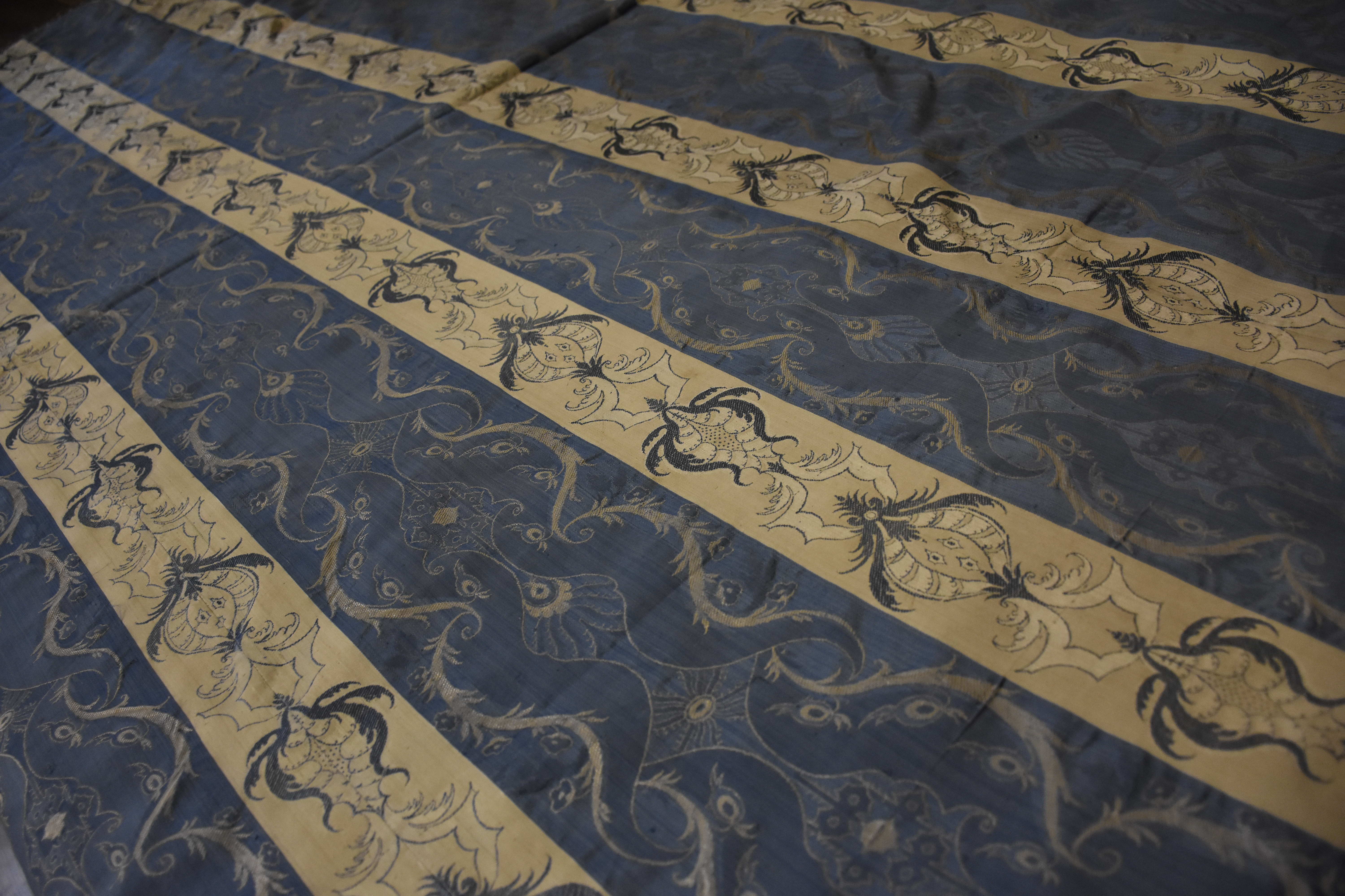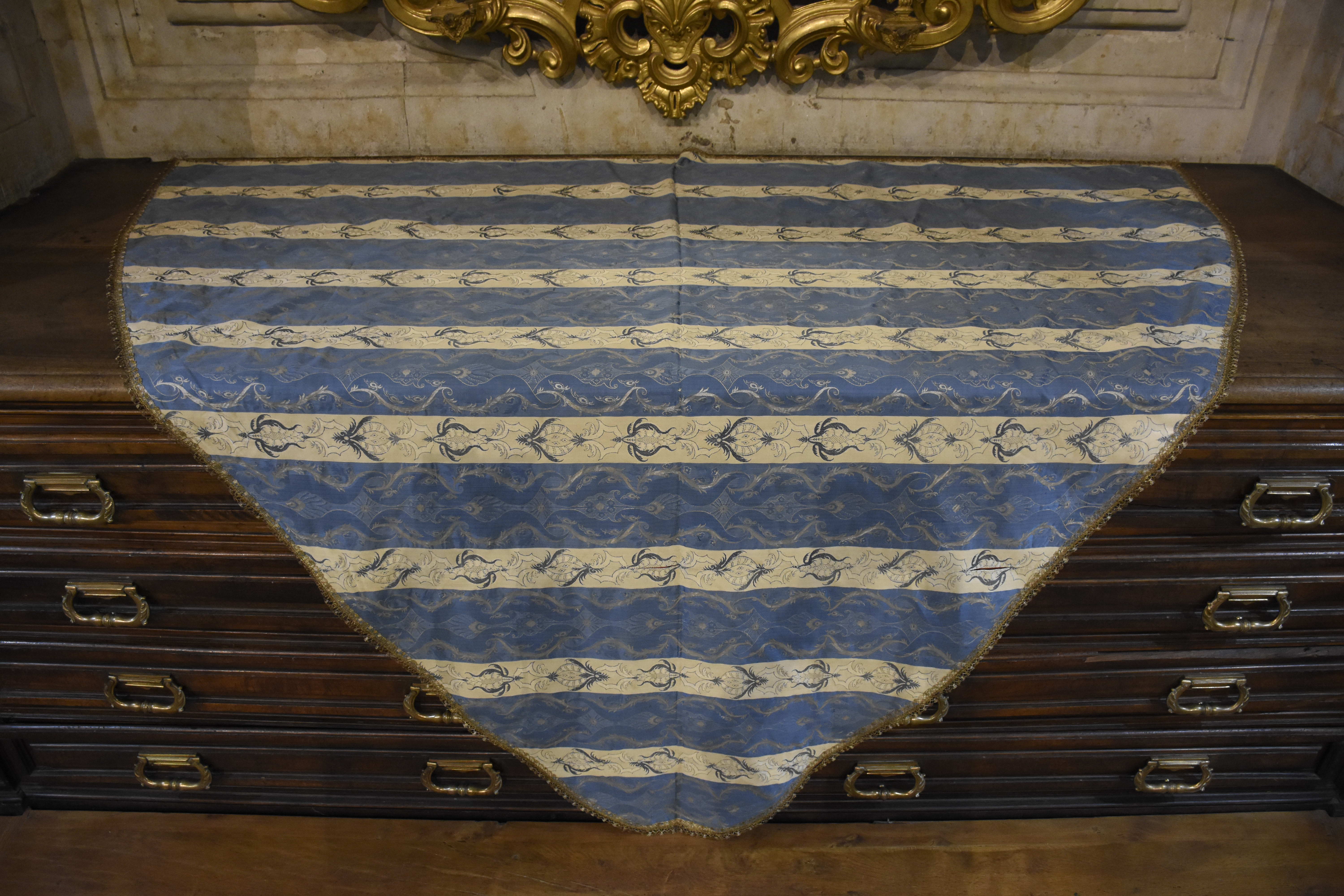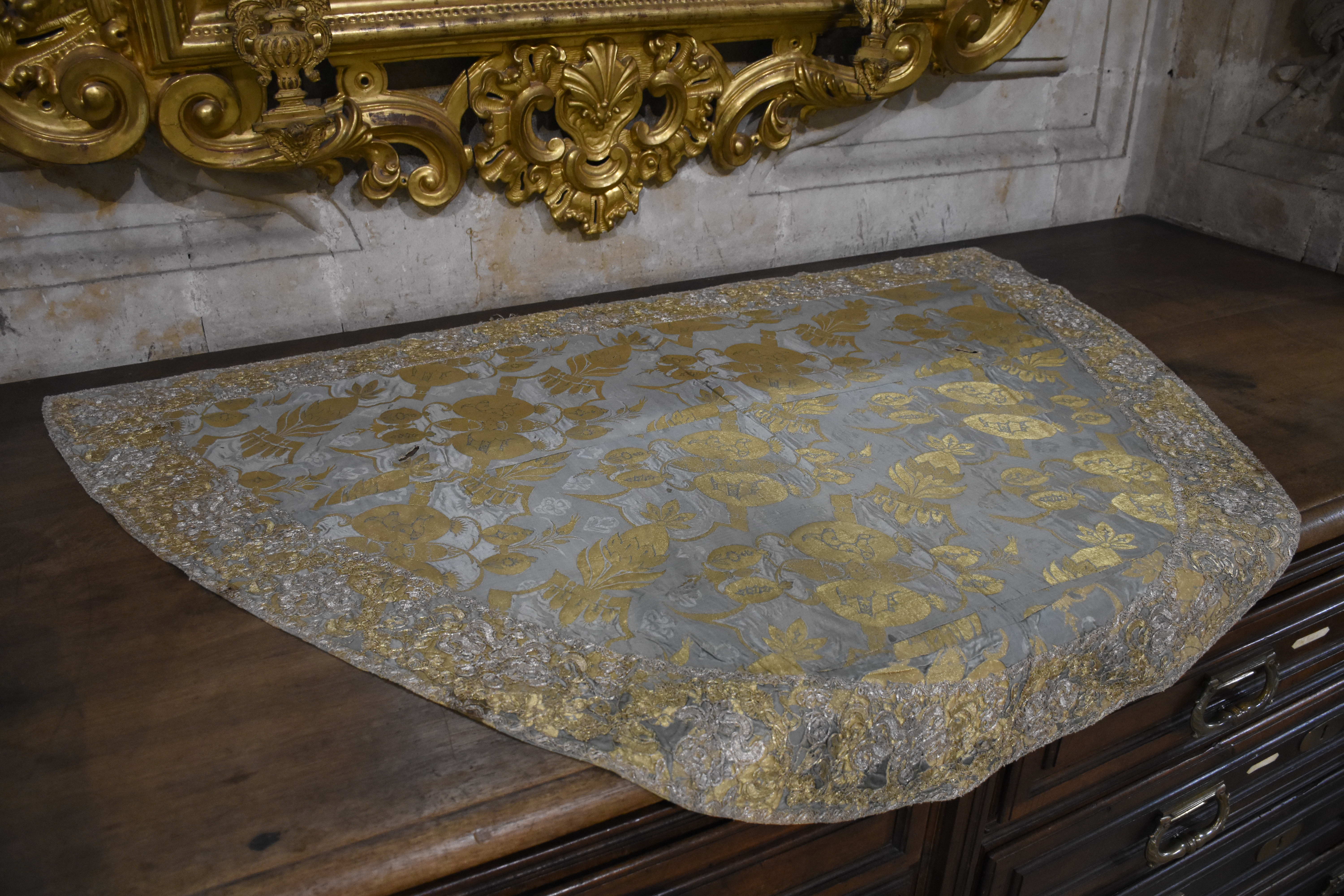 Otro de los mantos tiene un tamaño bastante mayor que la talla, que como apunta Benito, “se entiende que se utilizaría en procesión, para llevarla en andas”. En este caso, su diseño es de líneas horizontales, en azul y blanco, “que refleja un estilo posterior del XIX, rematada la orla con hilo de oro y plata, hecho con bolillos”.