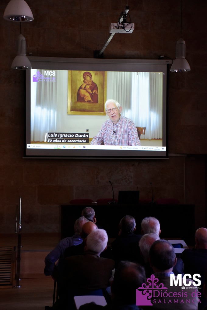 La jornada comenzó con la proyección de un vídeo con el testimonio de los homenajeados en el aula Virgen de la Vega de la Casa de la Iglesia. Y después, a las 12:45 horas, se celebró la eucaristía en la capilla mayor, presidida por el obispo, Mons. José Luis Retana, y concelebrada por el clero diocesano. Junto al pastoral, en el altar, se encontraban los ocho presbíteros que cumplen sus bodas de oro y plata como sacerdotes.