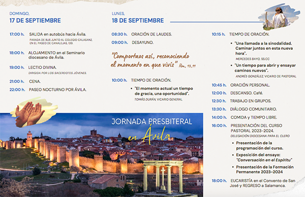 Los presbíteros participarán en una jornada presbiteral antes del inicio del curso en Ávila, los días 17 y 18 de septiembre, previa a la XV Semana Diocesana de Pastoral. Las inscripciones deben de realizarse antes del 12 de septiembre en la portería de la Casa de la Iglesia, en la calle Rosario, 18, o en el teléfono 923 12 89 00, con un coste de 55 euros.