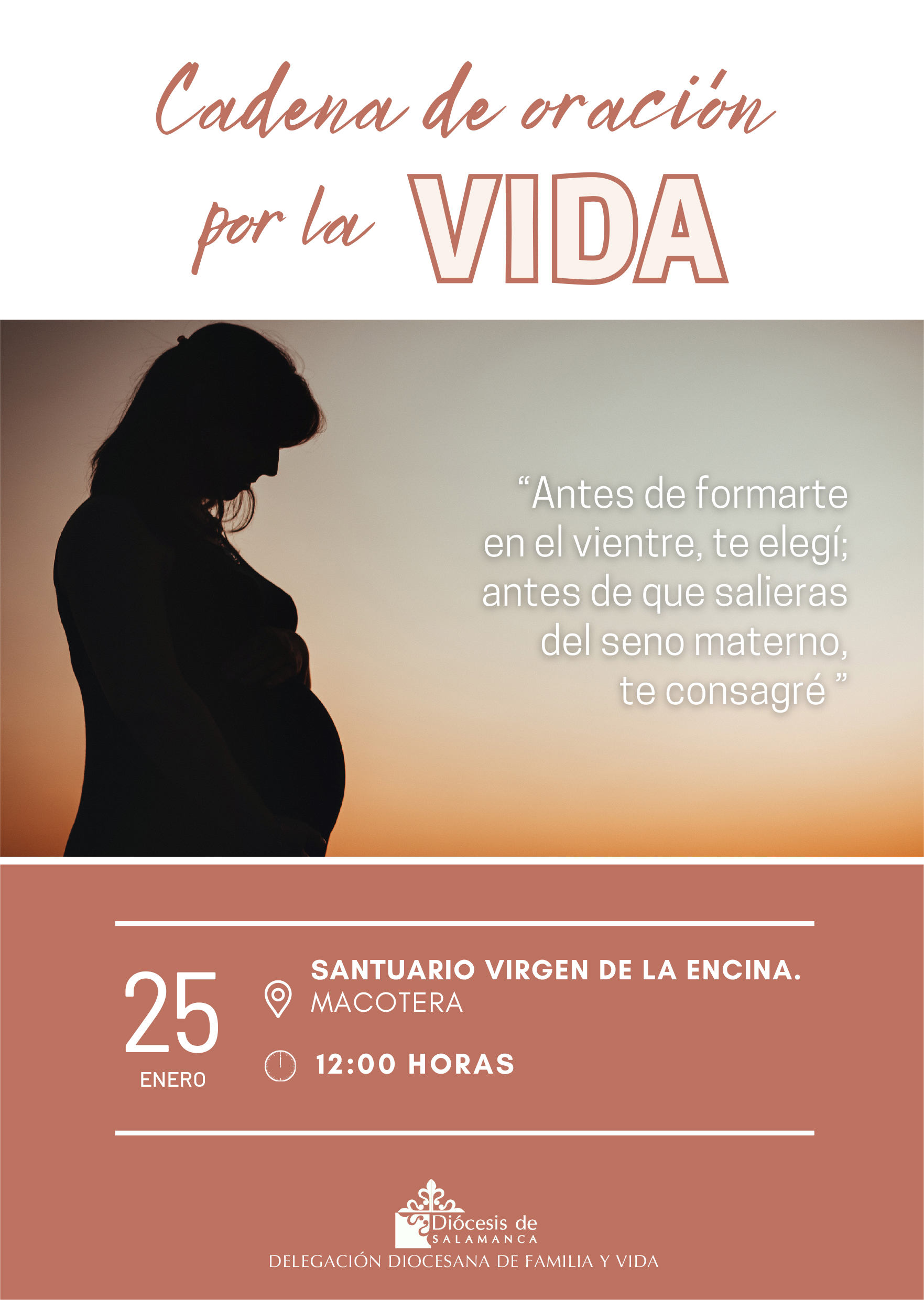 La cita del libro del profeta Jeremías: “Antes de formarte en el vientre, te elegí; antes de que salieras del seno materno, te consagré”, ha sido escogida para la celebración de la cadena de oración por la vida de este mes de enero. Una iniciativa, organizada por la Delegación diocesana de Familia y Vida, tiene lugar el día 25 de cada mes. En esta ocasión, se llevará a cabo en el Santuario Virgen de la Encina, en Macotera, el 25 de enero a las 12:00 horas. La oración se iniciará con el rezo del Ángelus, la celebración de la Eucaristía y la lectura de un texto que invitará a la reflexión en torno a la intención de oración de este mes.