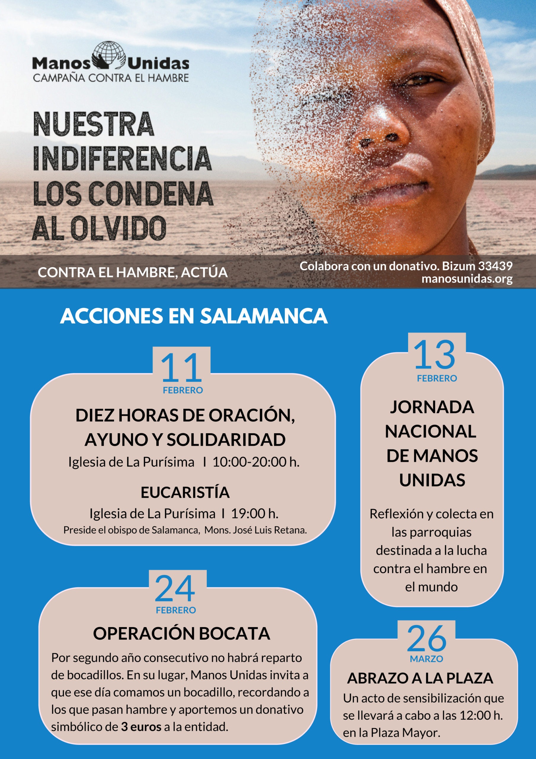 Desde Manos Unidas de Salamanca quieren despertar la conciencia de la sociedad respecto a las desigualdades en el mundo y el hambre. Así lo recordó su presidenta, Mercedes Marcos, en la campaña de 2022, que lleva por lema: “Nuestra indiferencia los condena al olvido”.