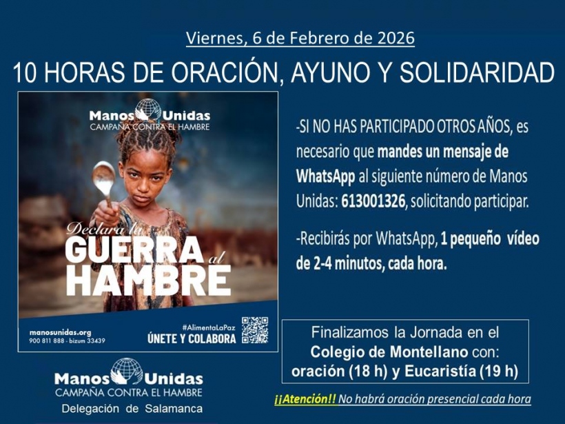 Las diez horas concluirán con la celebración de la Hora del Hambre, una oración comunitaria, a las 18:00 horas en la capilla del Colegio Mayor Montellano (C/ Zamora, 18), seguida de la eucaristía, presidida por el obispo de Salamanca, Mons. José Luis Retana, a las 19:00 horas, como signo de comunión y compromiso cristiano con las personas que más sufren.