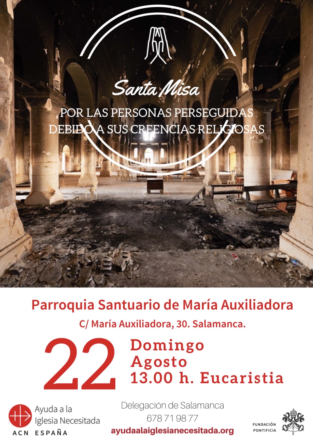 Ayuda a la Iglesia Necesitada celebra este domingo, 22 de agosto, una santa misa por las personas perseguidas debido a sus creencias religiosas, a las 13:00 horas en la parroquia de María Auxiliadora. Con esta eucaristía se conmemora el Día Internacional para conmemorar a las víctimas de la violencia religiosa, que según el responsable de Ayuda de la Iglesia Necesitada de Salamanca, Ignacio Manzano, “se trata de un paso importante para que se escuche más la voz de los cristianos perseguidos”.
