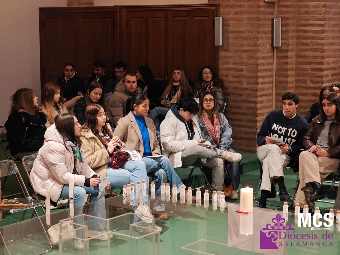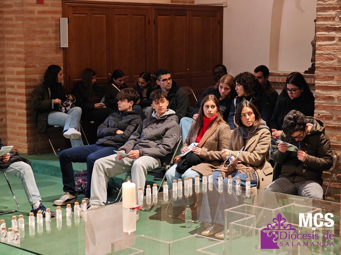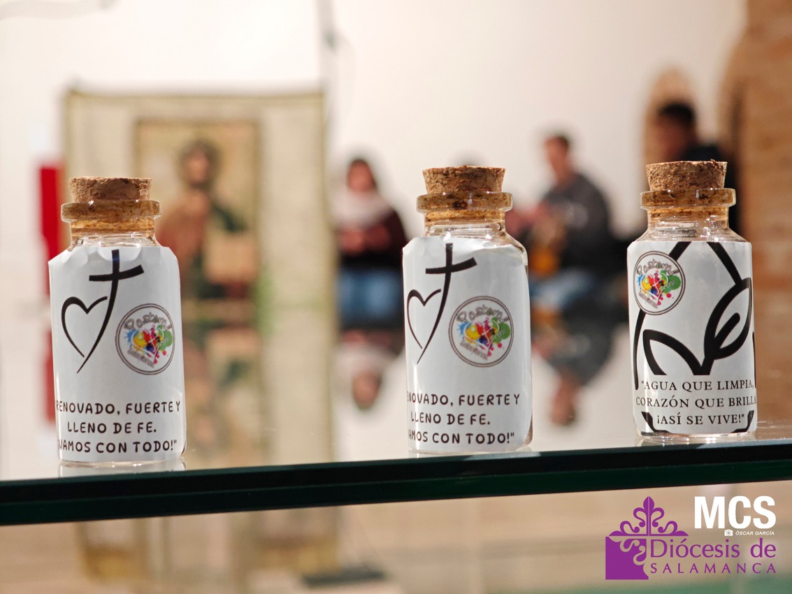 Después se realizó el gesto del agua: cada joven abrió su botella, mojó sus dedos y trazó una señal de la cruz en la frente o el corazón. Fue un signo sencillo, pero profundo, de volver a la fuente que limpia, renueva y recuerda la identidad recibida en el Bautismo. El momento concluyó con la renovación de las promesas bautismales, proclamadas en voz alta: renunciar al egoísmo, al miedo y a la indiferencia, y confesar la fe en el Padre, el Hijo, el Espíritu, la Iglesia y la vida que no se apaga. El envío final animó a vivir el Bautismo como misión cotidiana: ser portadores de vida, alegría y esperanza allí donde estén