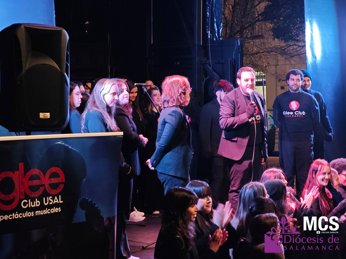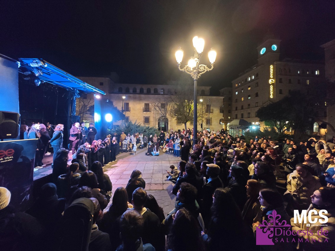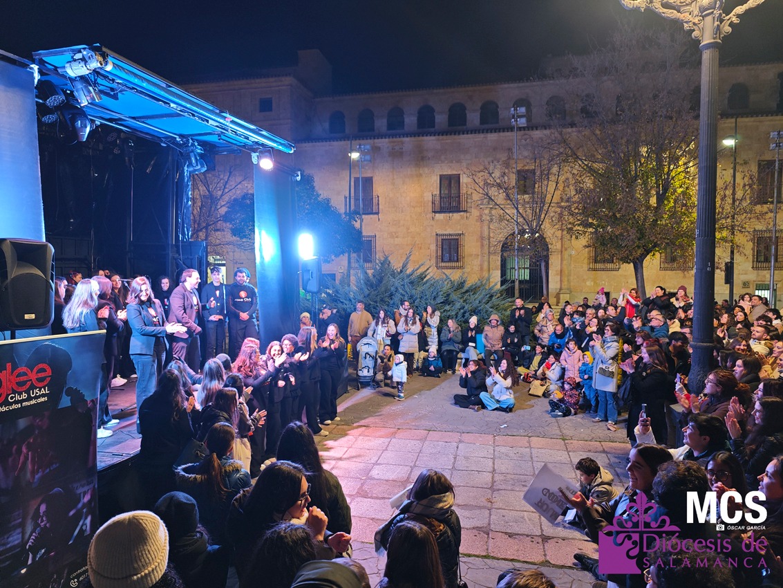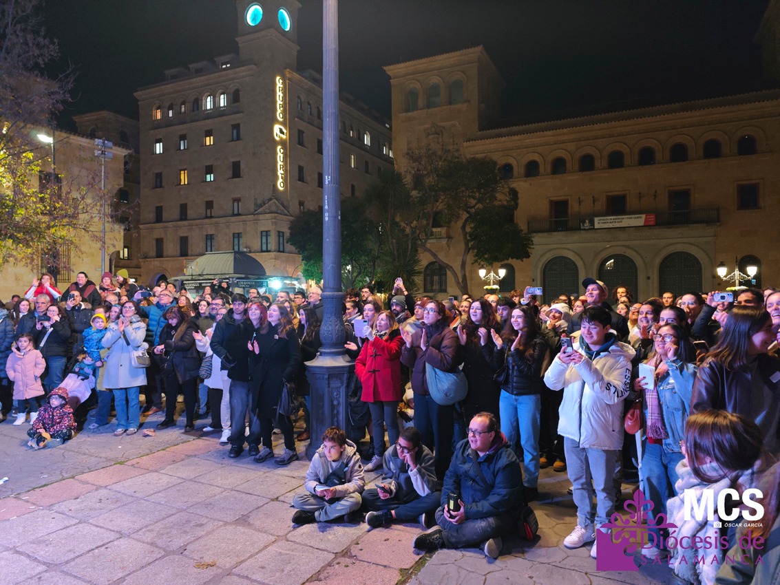 La tarde continuó en la plaza de Los Bandos con un breve concierto del GleeClub, presentado por Pablo Sánchez, del grupo Jerut. Los jóvenes disfrutaron de un momento festivo, lleno de ritmo y participación, que se convirtió en una de las imágenes más alegres del día. El trayecto entre la Catedral y este lugar estuvo acompañado de canciones y carteles que portaban los jóvenes donde se podía leer: “¡Vive!”, “¡Sueña!”, “¿Para quién Soy?”, “Somos jóvenes, somos Iglesia”, “Él es el rey de la gloria”, o “Basta con vivir con todo el alma”, entre otras.