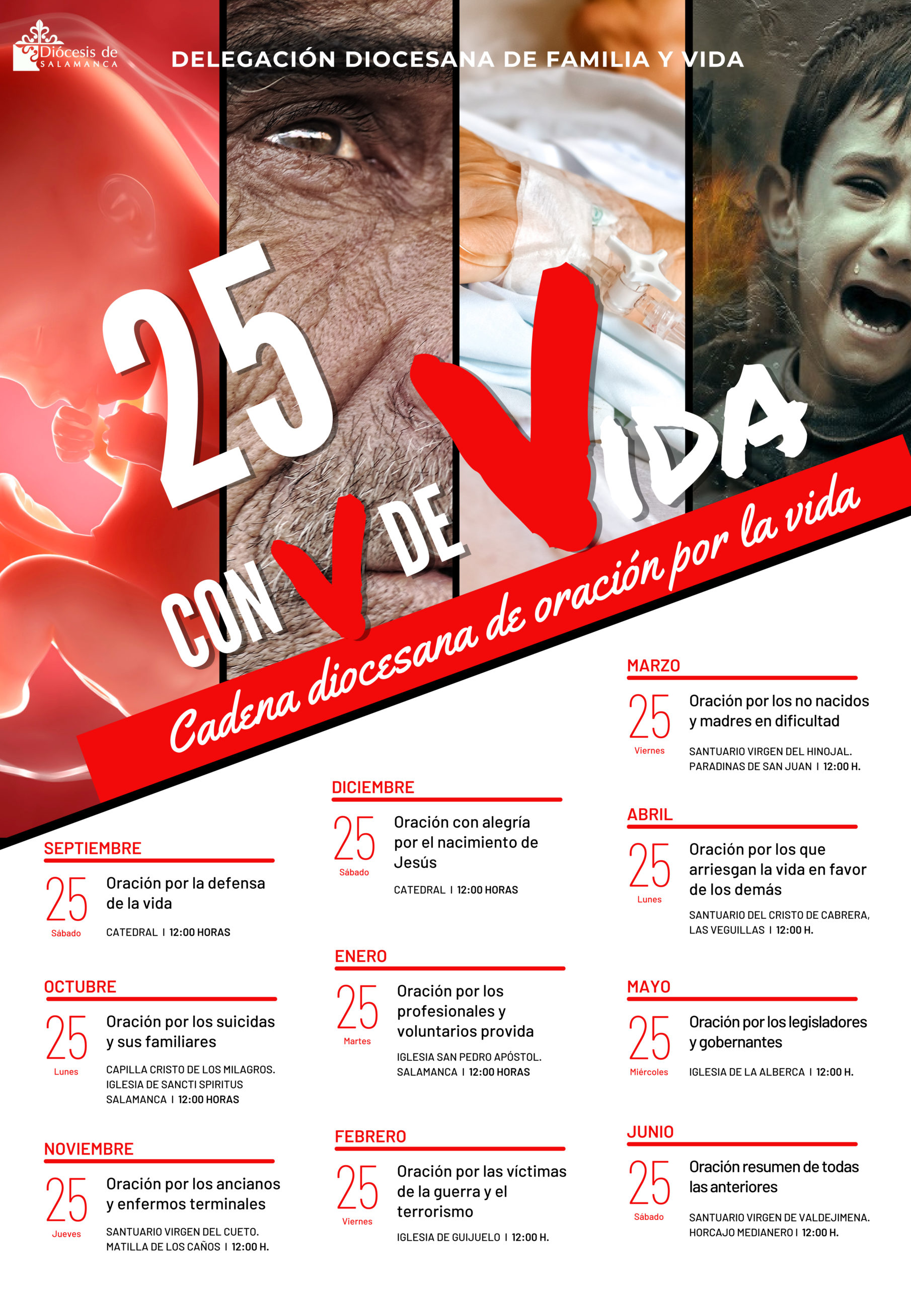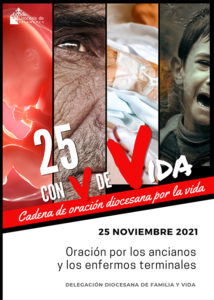 Una de las propuestas de la Delegación diocesana de Familia y Vida en este curso pastoral es la cadena de oración “Veintinco con ‘V’ de vida”, con la que se invita a la comunidad diocesana a rezar por la vida el 25 de cada mes, si es posible a las 12:00 del mediodía.