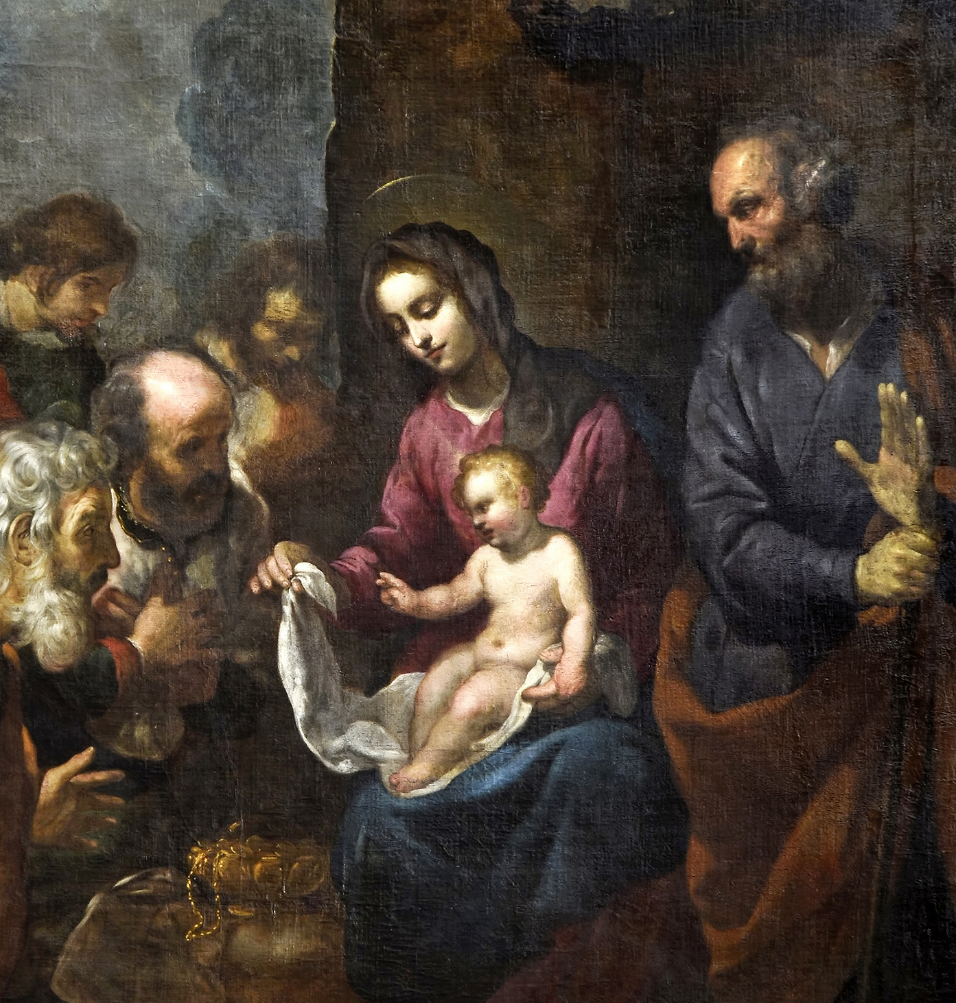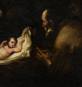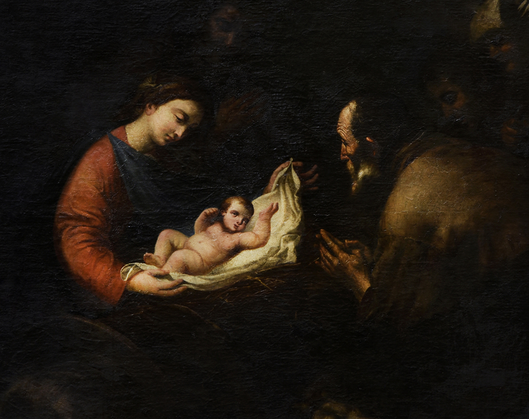 Ahora dirigimos la mirada a José, tan creyente, humilde y obediente como María. Le hallamos contemplando en adoración el rostro del niño Jesús, el hijo de su esposa. Con su gesto nos lo muestra sin palabras como el que “salvará a su pueblo de sus pecados” (Mt 1,21 ). Así cumple con humildad la misión que le encomendó en sueños un ángel del Señor. Nos muestra al niño en el pesebre del establo: el “palacio” del príncipe heredero del trono de David, que “vino a su casa y los suyos no lo recibieron” (Jn 1, 11 ); ni siquiera ha podido tener un lugar digno donde nacer, “porque no había sitio para ellos en la posada” (Lc 2, 6-7). Pero así llevó a cabo el Señor el nacimiento de su Hijo a su manera, donde él quiso y como él quiso, en la forma desconcertante en que actúa la sabiduría de Dios y su poder de salvación: asumiendo la condición humana en la forma de esclavo (Flp 2, 7).
