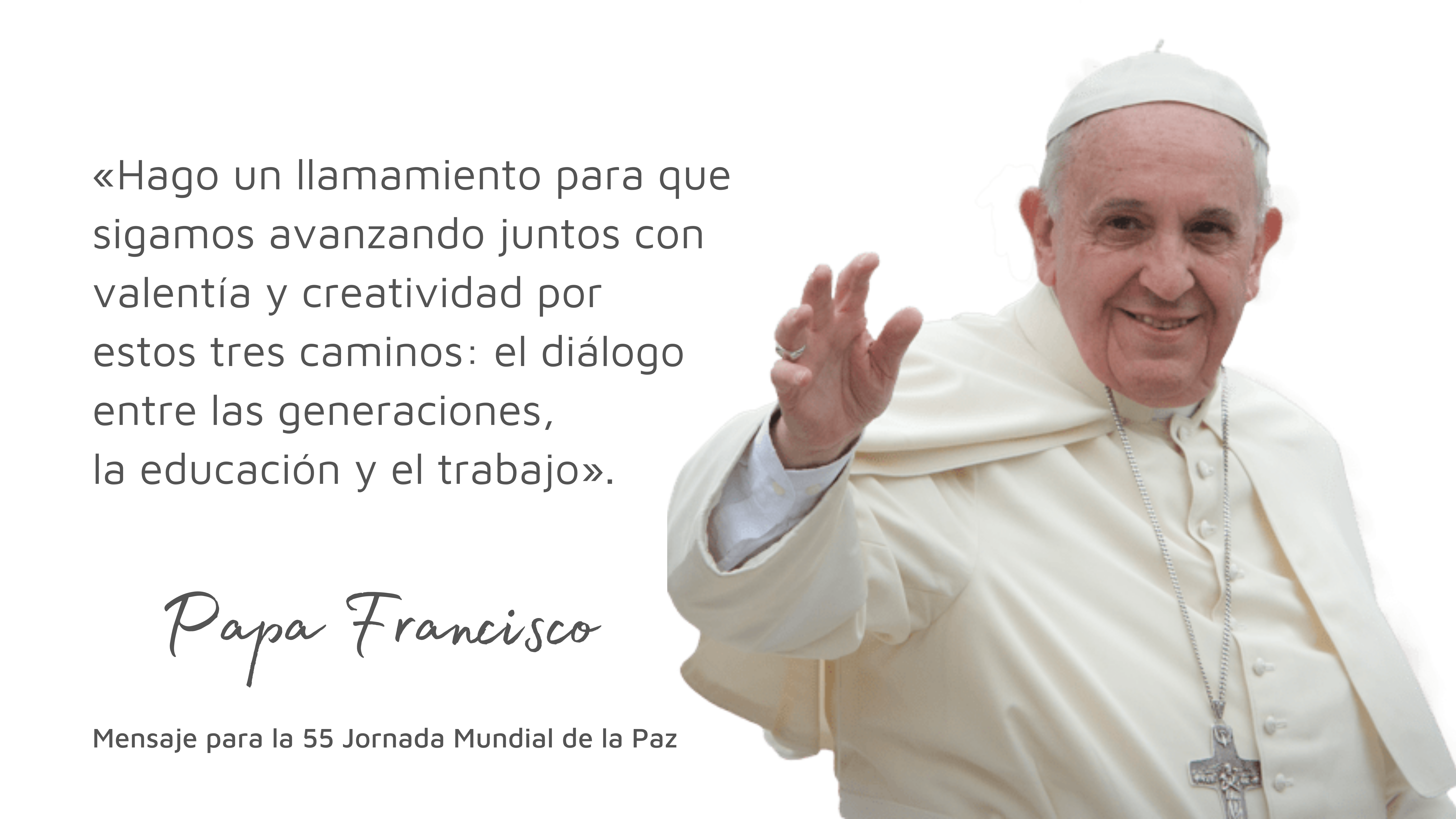 «Diálogo entre generaciones, educación y trabajo: instrumentos para construir una paz duradera», es el título del Mensaje del papa Francisco para la 55 Jornada Mundial por la Paz que la Iglesia celebra el 1 de enero, coincidiendo con la solemnidad de Santa María, Madre de Dios. En su mensaje, el Santo Padre hace un llamamiento a los gobernantes y a cuantos tienen responsabilidades políticas y sociales, a los pastores y a los animadores de las comunidades eclesiales, como también a todos los hombres y mujeres de buena voluntad, “para que sigamos avanzando juntos con valentía y creatividad por estos tres caminos: el diálogo entre las generaciones, la educación y el trabajo. Que sean cada vez más numerosos quienes, sin hacer ruido, con humildad y perseverancia, se conviertan cada día en artesanos de paz. Y que siempre los preceda y acompañe la bendición del Dios de la paz”.